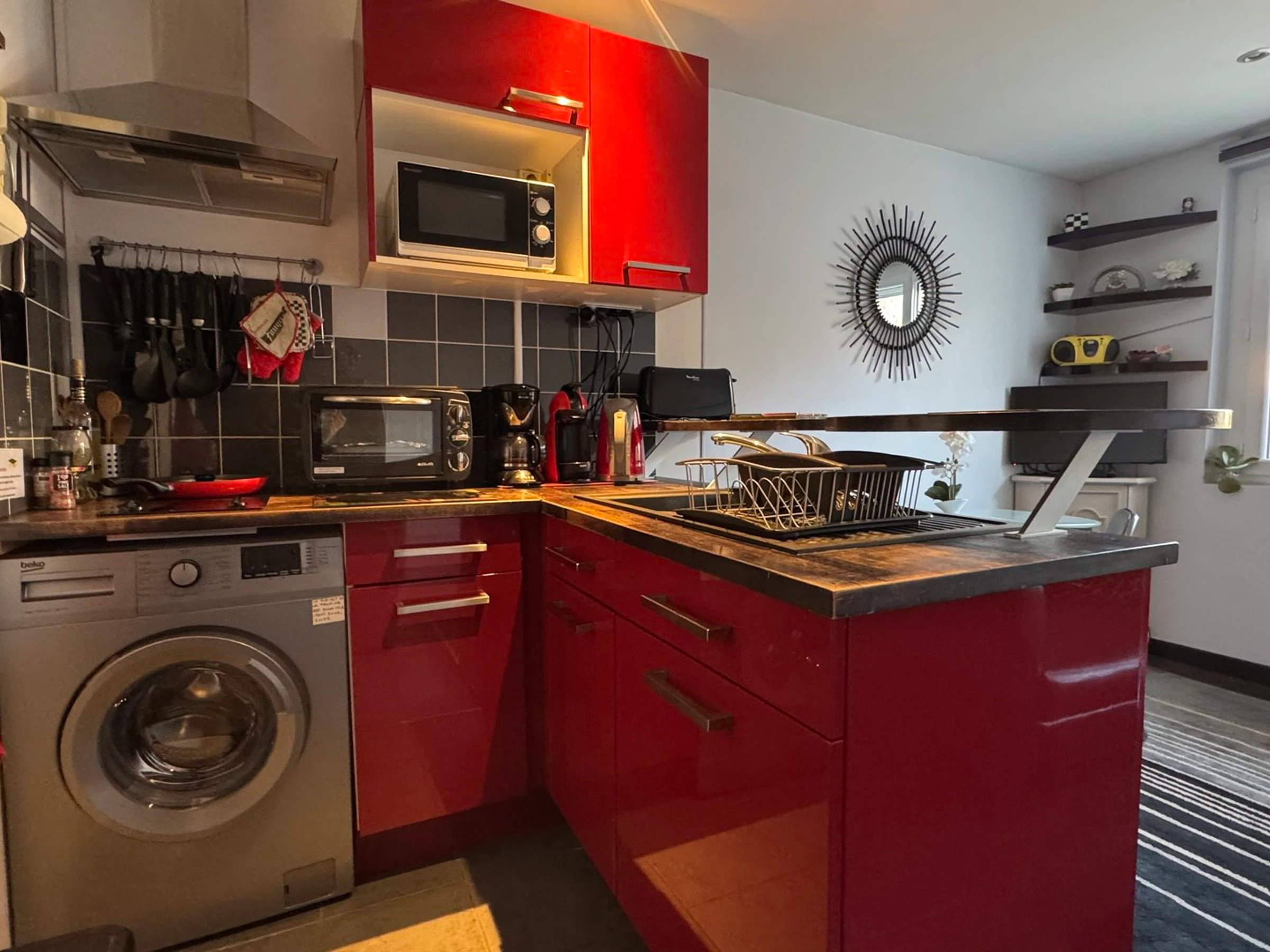 - OBERSTE KÜCHE auf dem Hauptteil: Plan de travail, évier 1 bac, Lava-linge, Mini-Four-Grill, Plaque de cuisson induction 2 feux, micro-ondes, hotte, meubles haut et bas, réfrigérateur / congélateur à tiroirs, Cafetière Dolce Gusto + Cafetière filtre, bouilloire, grille-pain, Vaisselle et Utensiles Divers.