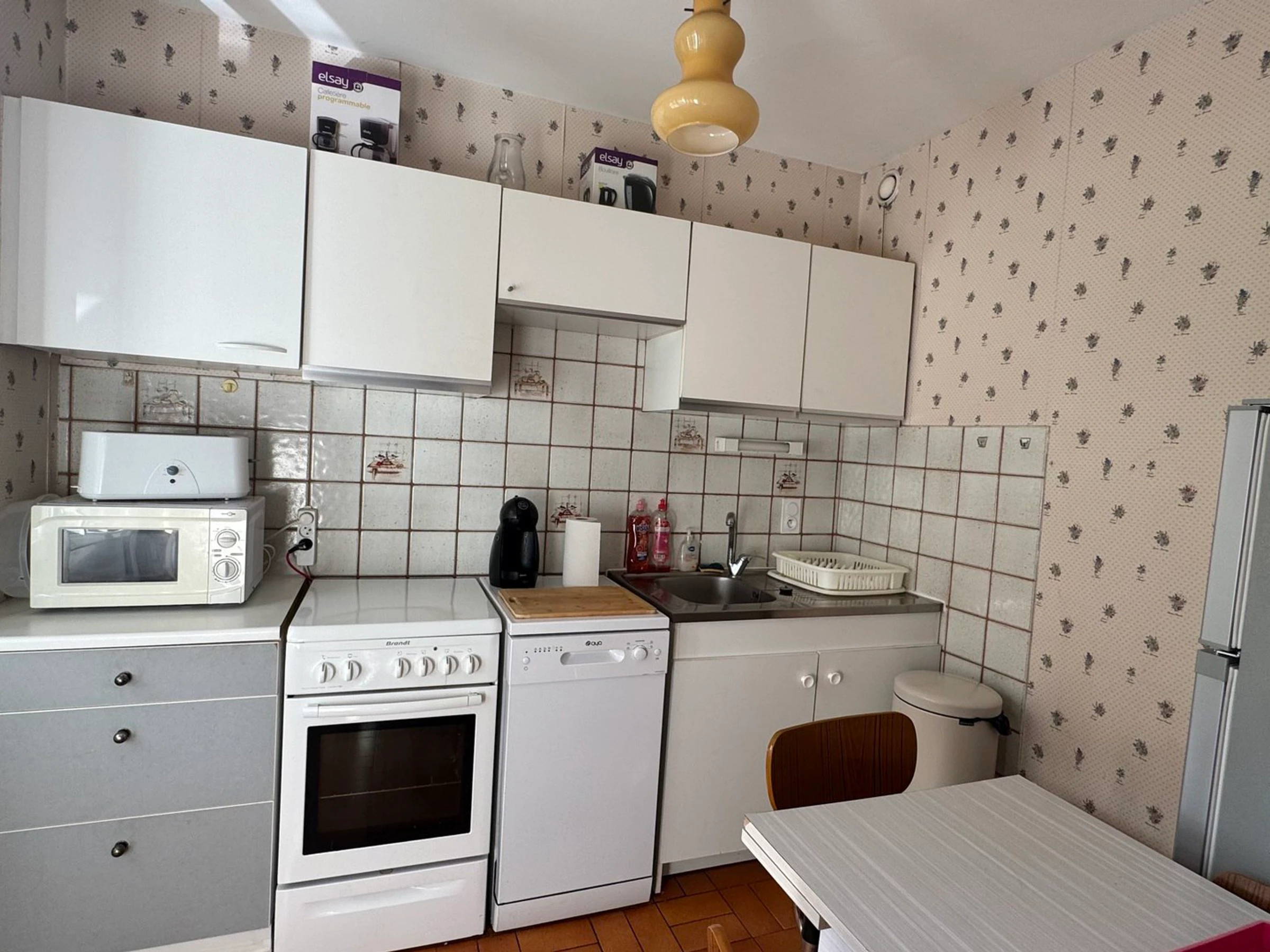 - CUISINE SEPAREE (carrelage – tapisserie et faïence) : meubles hauts et bas, table avec 3 chaises, évier 1 bac avec égouttoir, lave-vaisselle, cuisinière électrique 4 feux avec four, réfrigérateur (taille moyenne) avec congélateur, 2 cafetières (1 à capsule Dolce Gusto, 1 à filtre), bouilloire, grille-pain, micro-ondes, vaisselle et ustensiles divers.