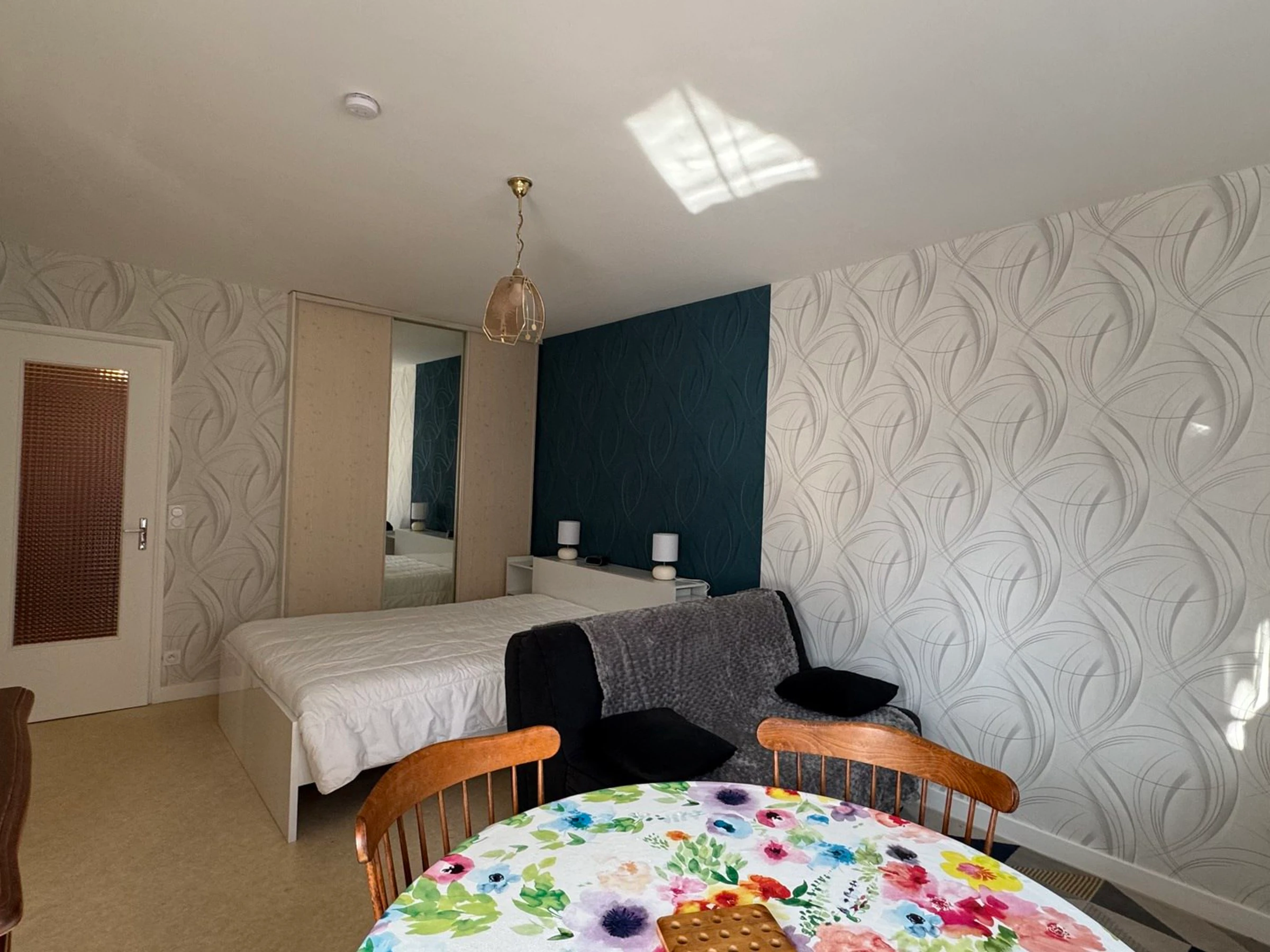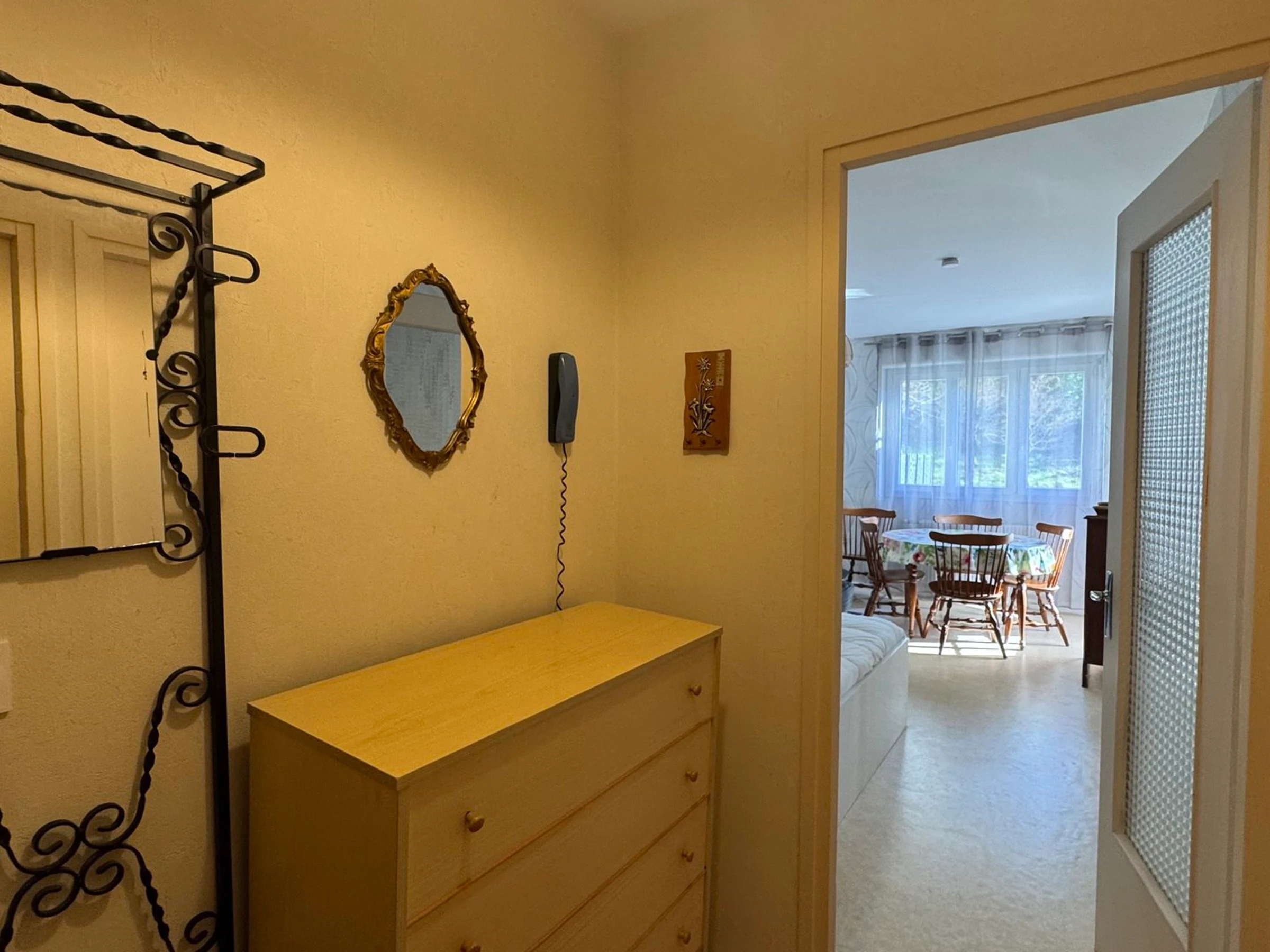 * Salon/séjour : canapé 2 places (convertible clic-clac), télévision, table avec 4 chaises, armoire penderie.