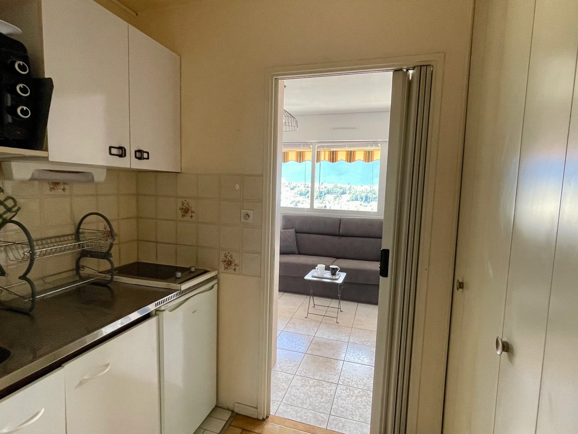 - HALL D’ENTREE AVEC KICHENETTE (carrelage – peinture et faïence): Wandgemälde aus Plakaten, Ober- und Unterschränke, Badezimmer mit 1 Badezimmer und Spüle, keramikkeramische Platte mit 2 Etagen und vier, kleiner Kühlschrank mit Gefrierfach, Mini-Four, Mikrowelle, Filterkaffeemaschine, Bouilloire, Geschirr und diverse Utensilien.