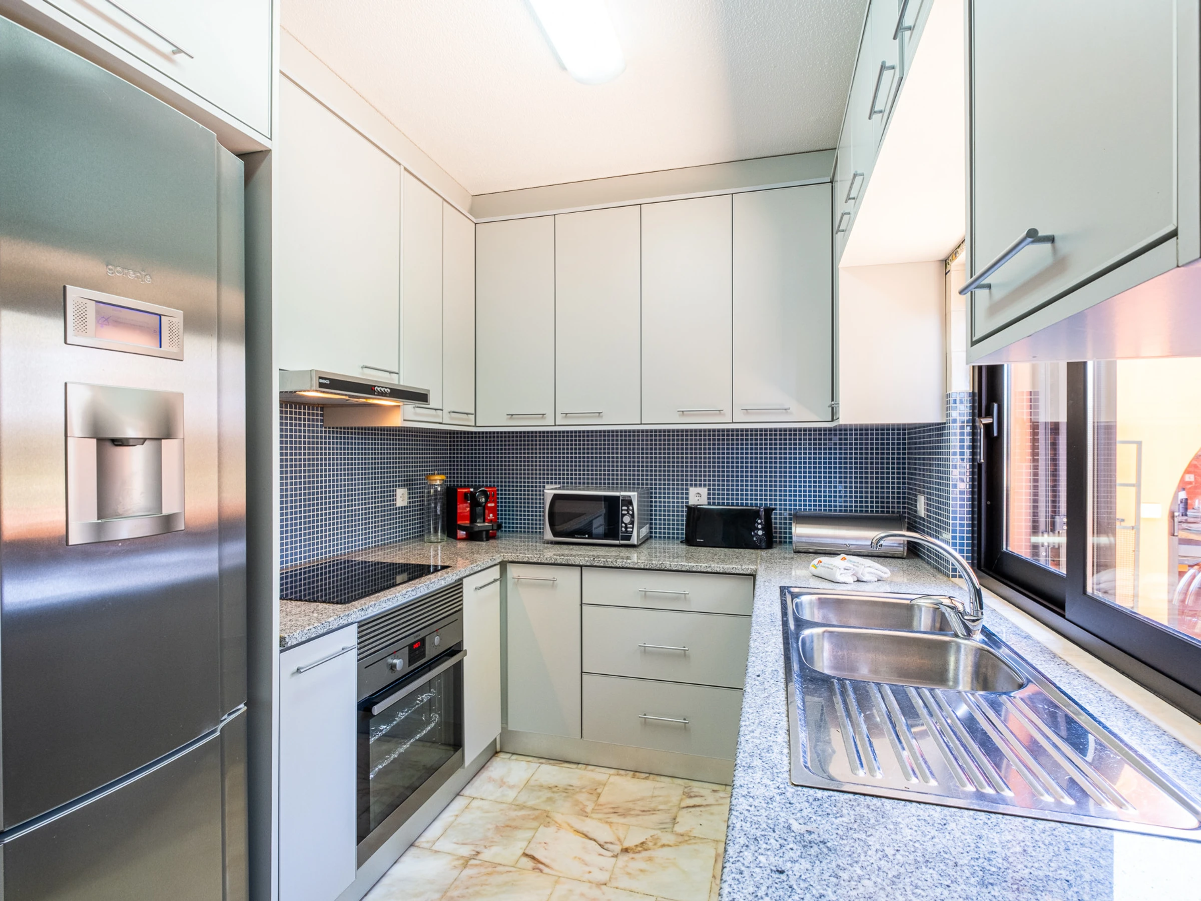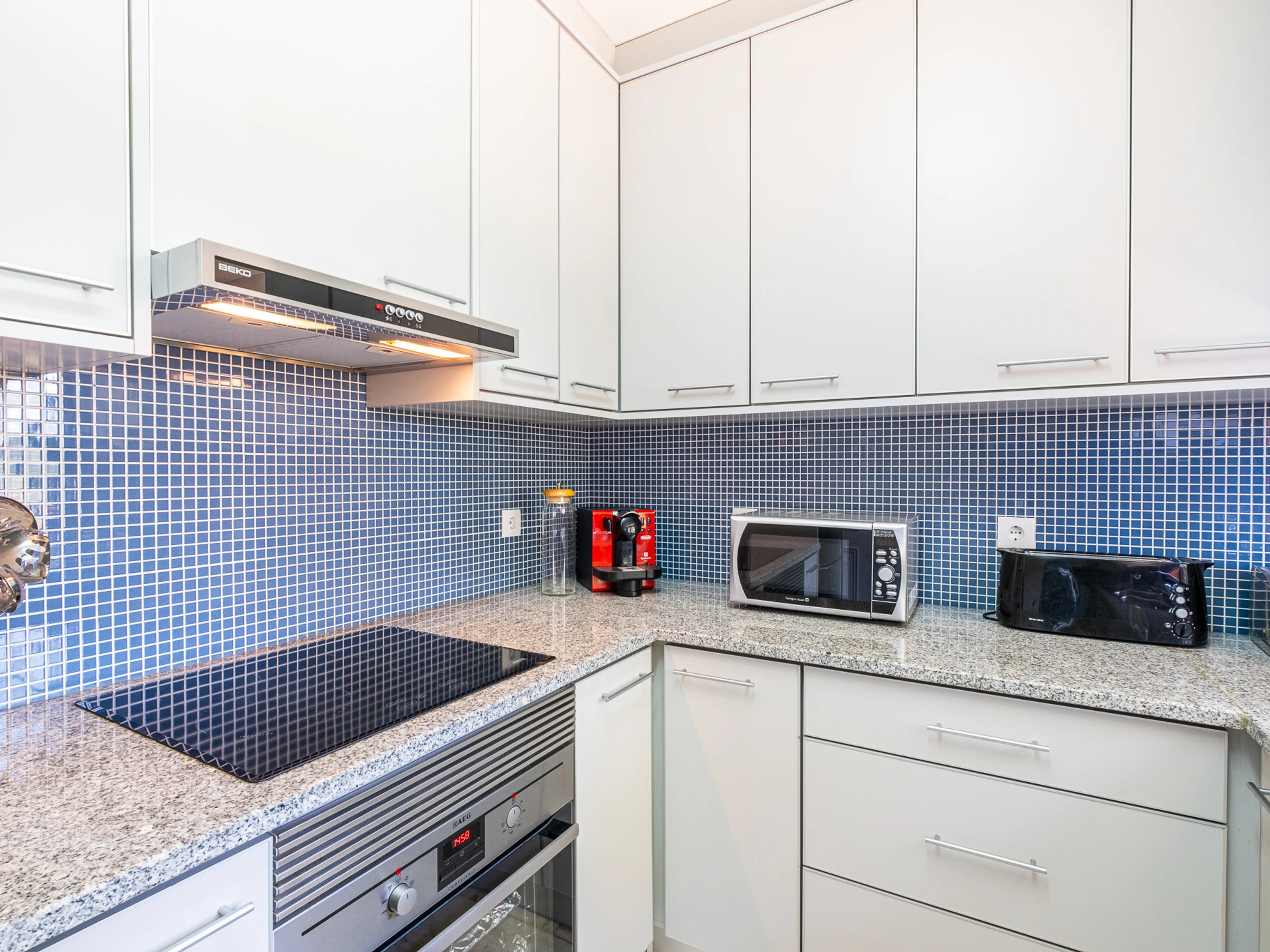 Dieses küche, ist ausgestattet in kühlschrank, mikrowelle, backofen, gefrierschrank, spülmaschine, geschirr/besteck, kochutensilien, kaffeemaschine, toaster und wasserkocher.