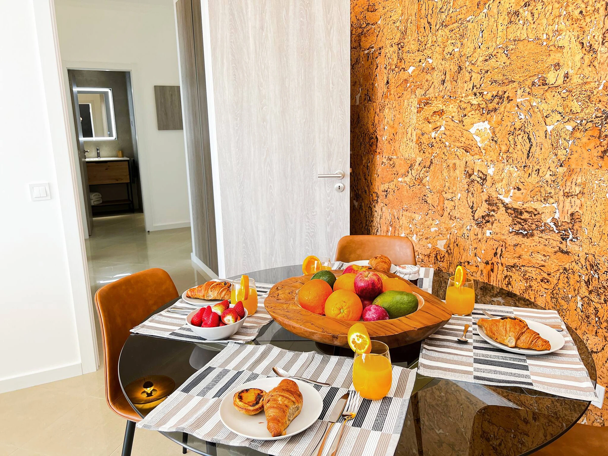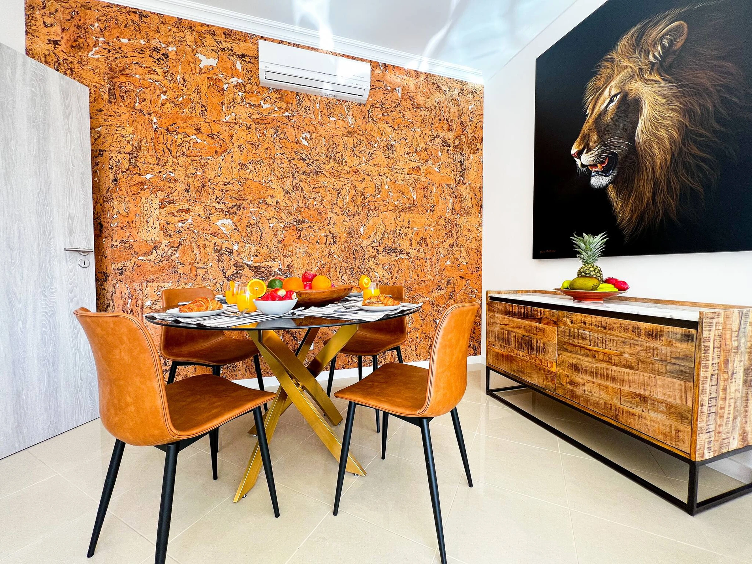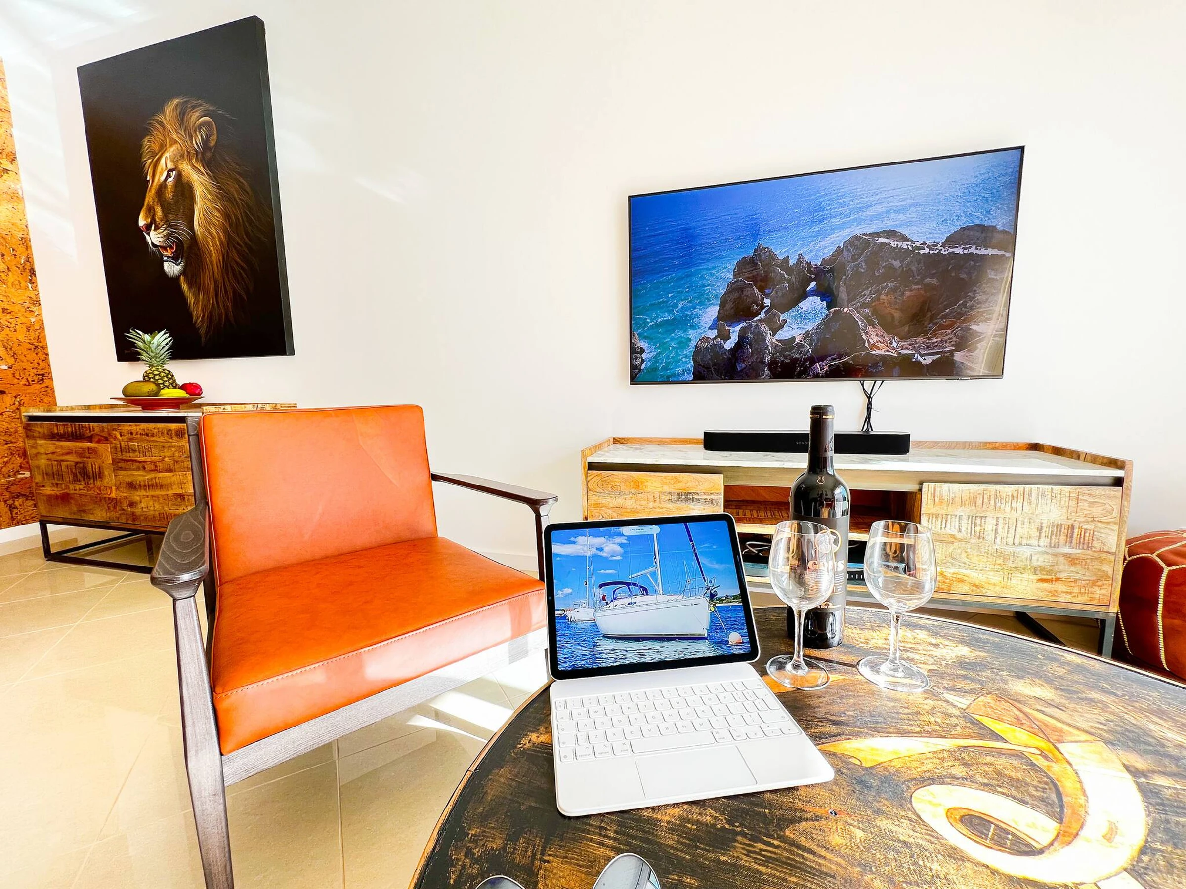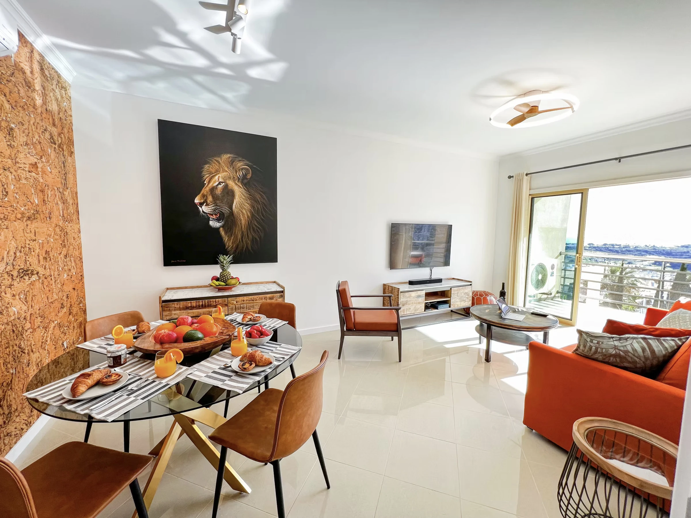 Die Wohnung bietet einen großen und geschmackvoll eingerichteten offenen Wohn- und Essbereich, einschließlich 55" 8K-Smart-TV, Soundbar und Terrassentüren, die zur geräumigen, vollständig möblierten Terrasse führen.