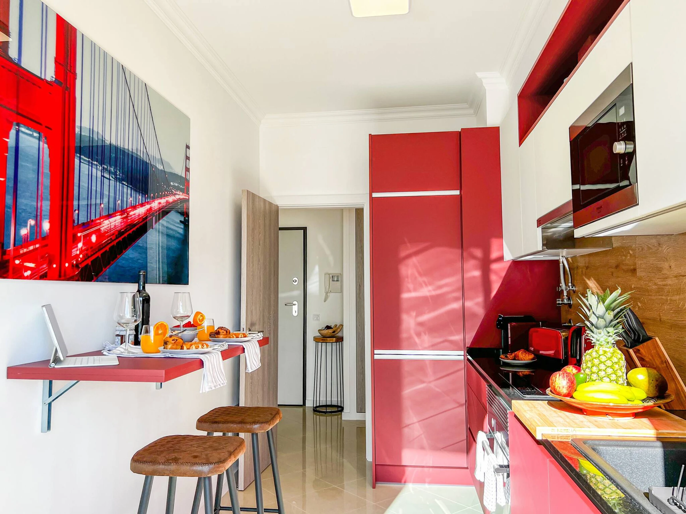 Die voll ausgestattete Küche, einschließlich integriertem Geschirrspüler und Waschmaschine, Frühstückstheke/Arbeitsstation und Terrassentüren, die zur Terrasse führen.
