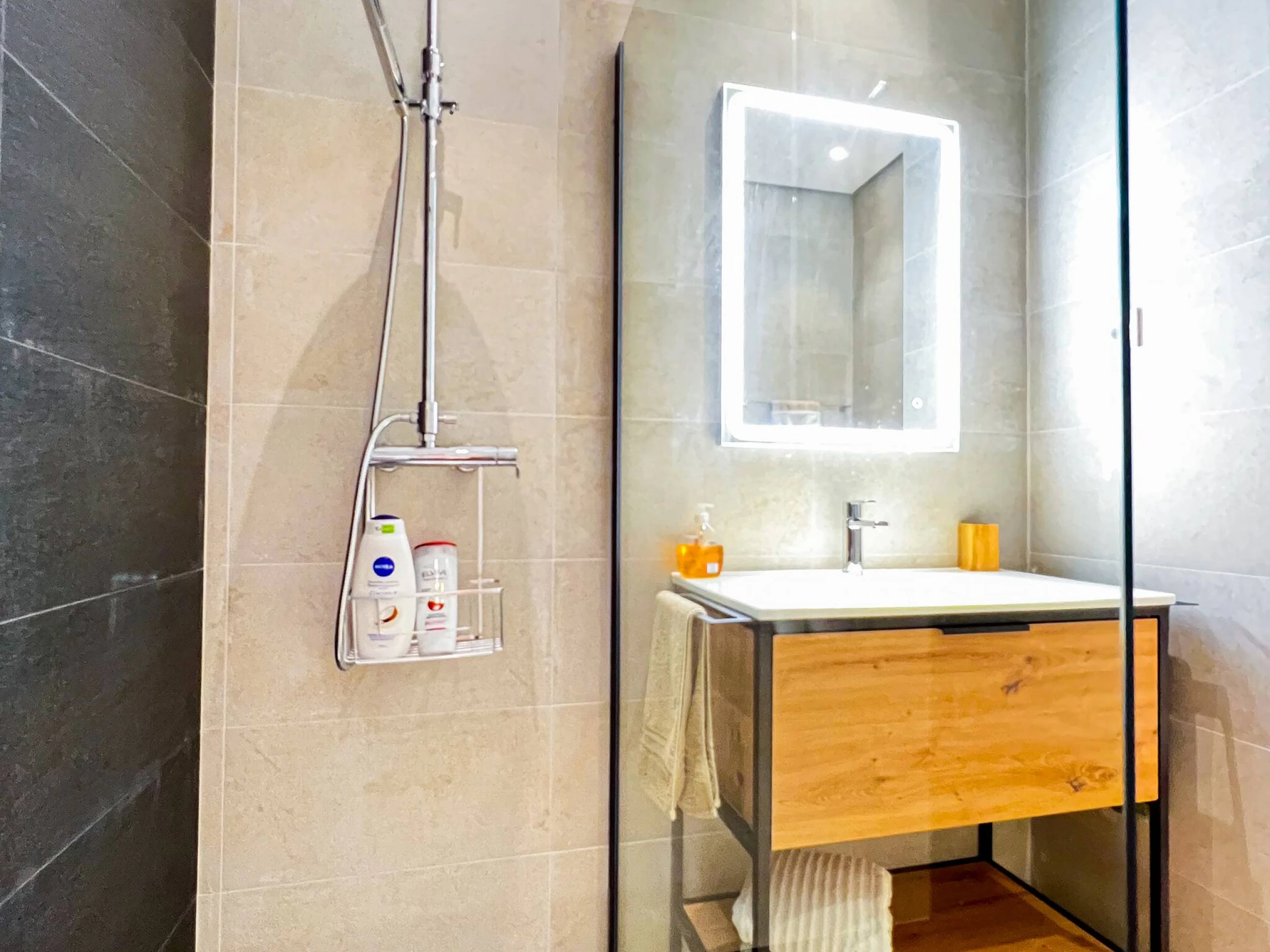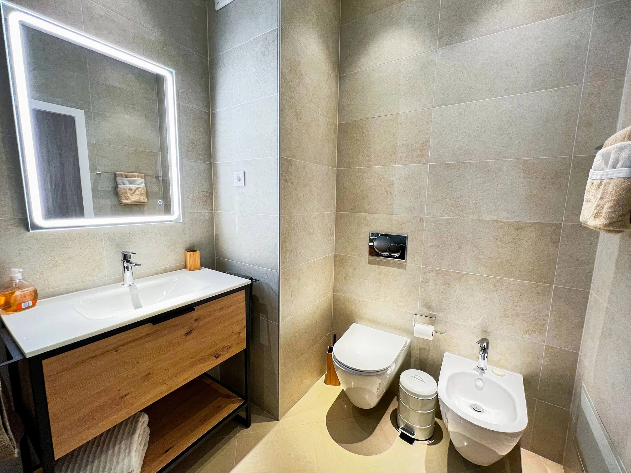 Das Badezimmer umfasst eine große begehbare Dusche, Waschbeckeneinheit, Toilette und Bidet.