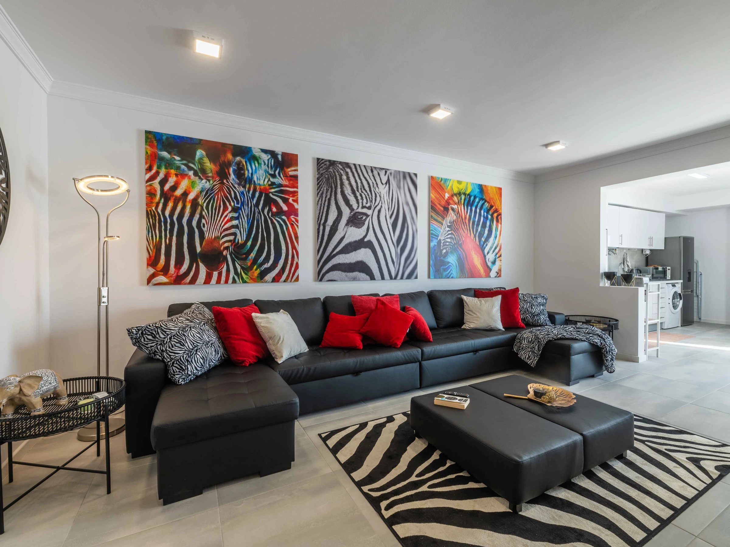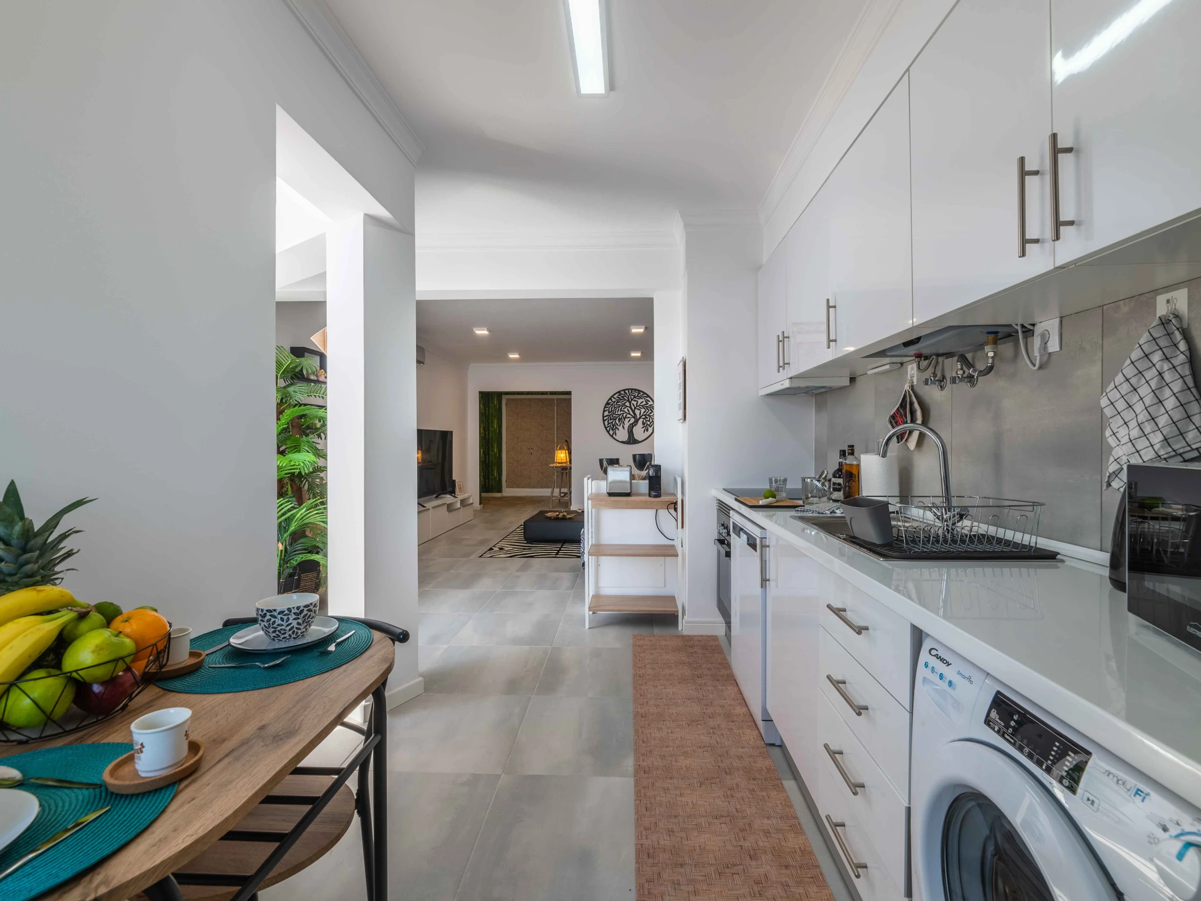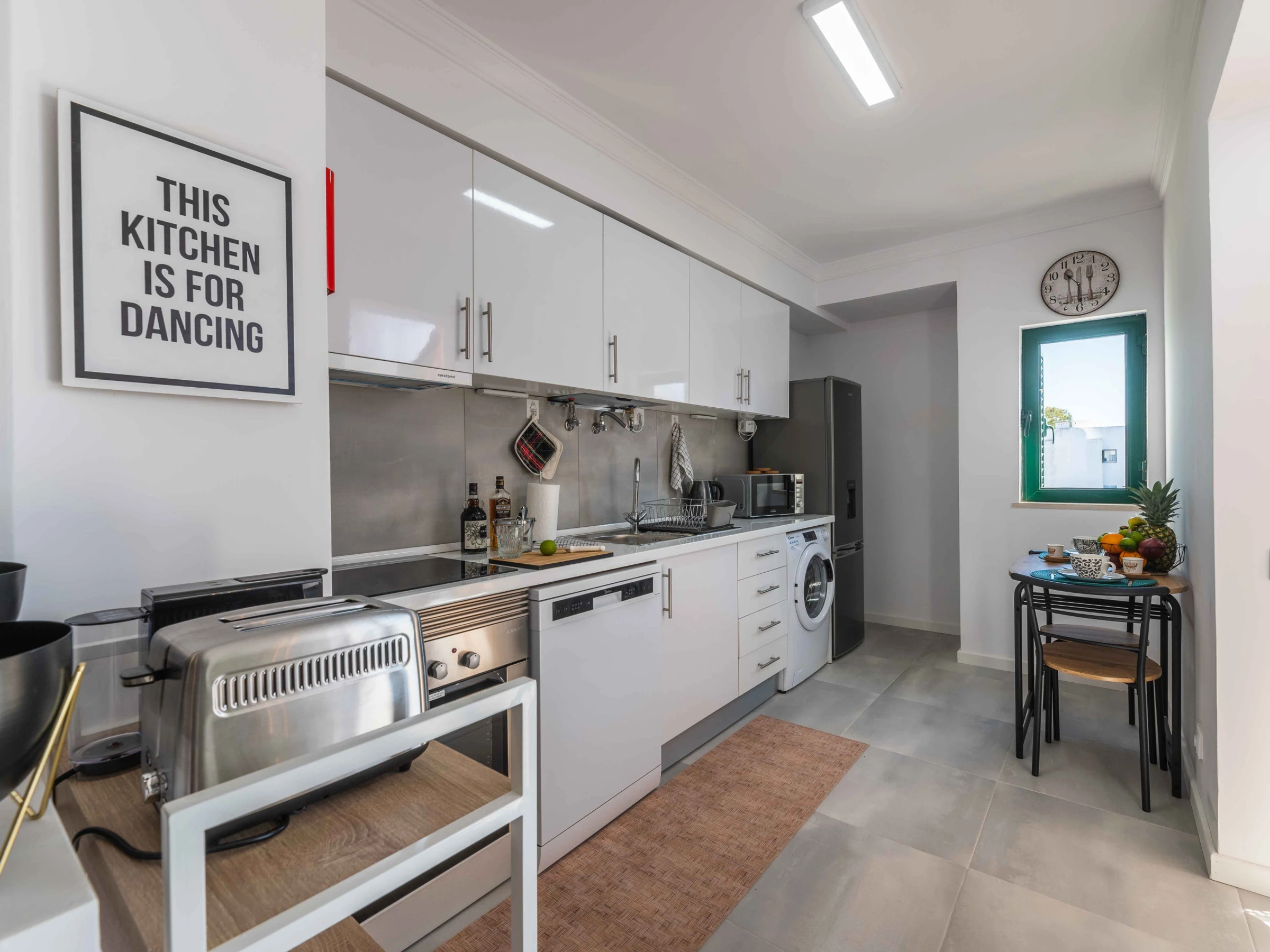 Dieses offene küche, mit ceranfeld, ist ausgestattet in kühlschrank, mikrowelle, backofen, gefrierschrank, spülmaschine, geschirr/besteck, kochutensilien, kaffeemaschine, toaster und wasserkocher.