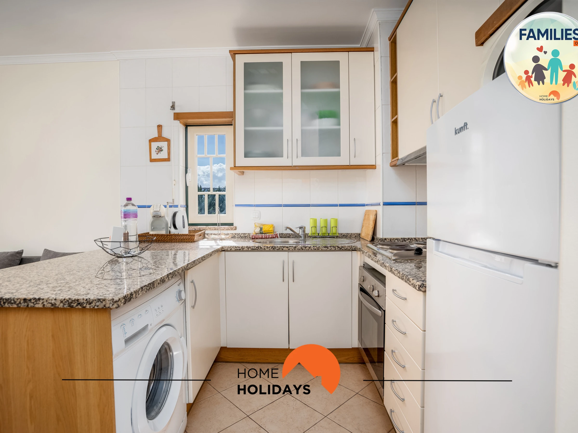 Dieses offene küche, mit gemixt: gas und elektrisch, ist ausgestattet in kühlschrank, mikrowelle, backofen, gefrierschrank, geschirr/besteck, kochutensilien, kaffeemaschine, toaster, wasserkocher, küchengeschirr, teller und schüsseln, herdplatte.