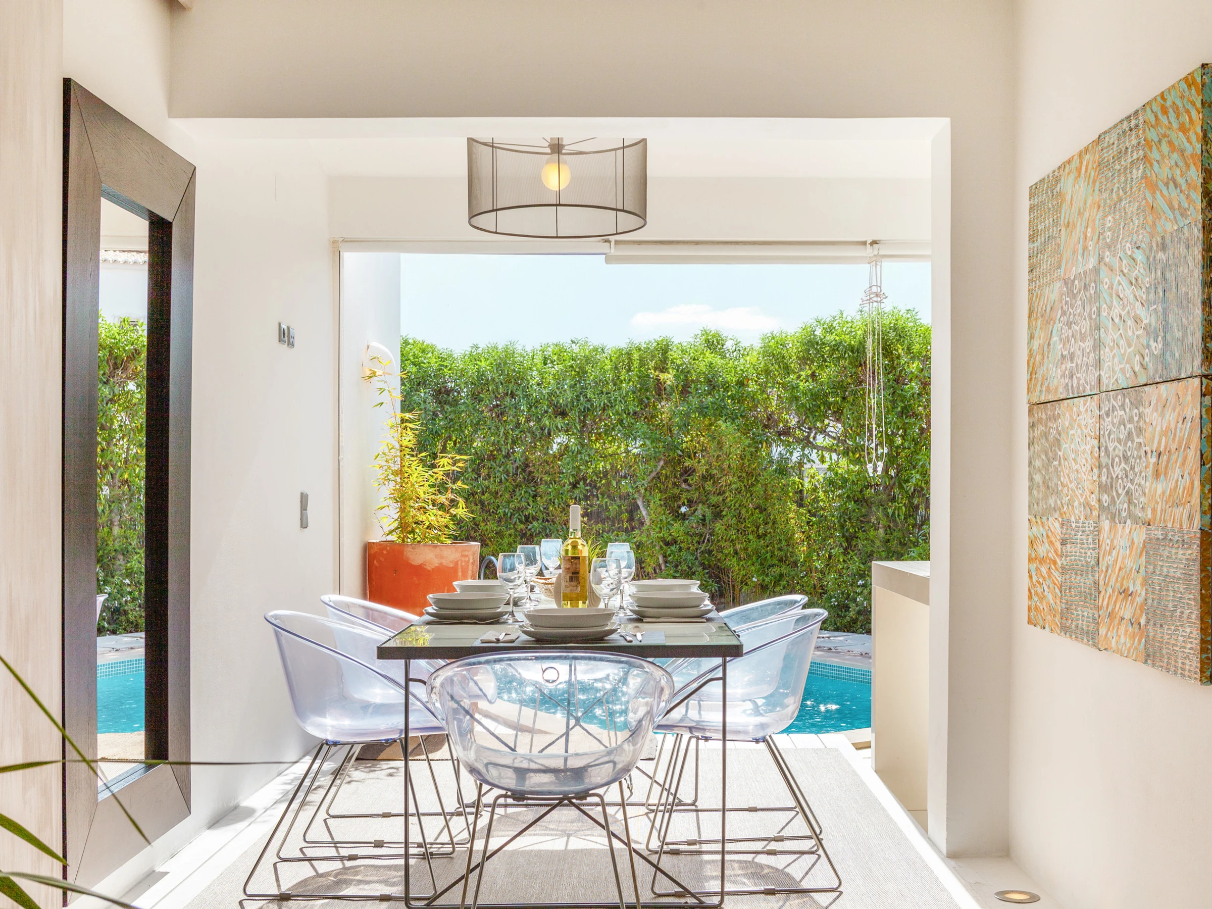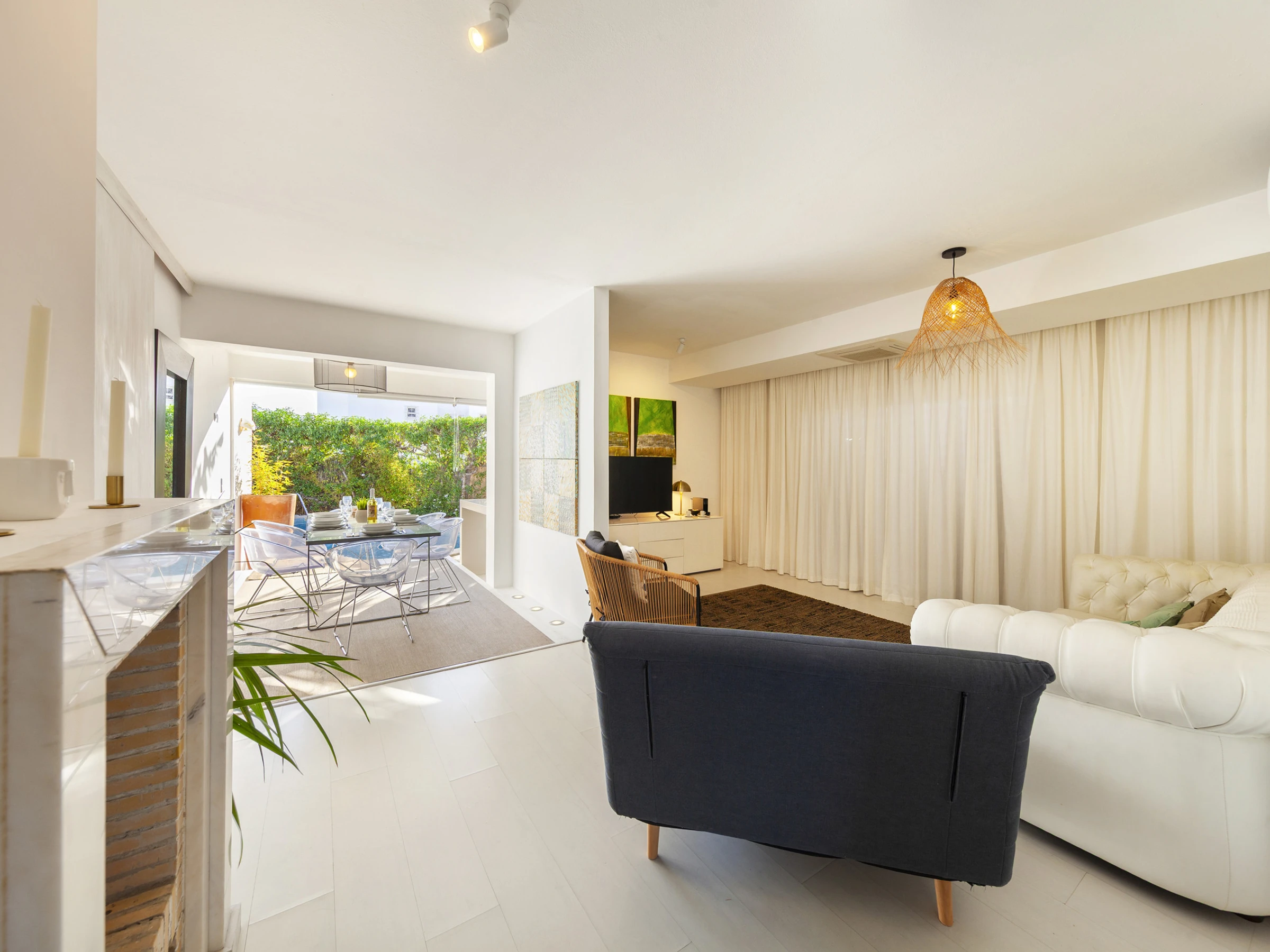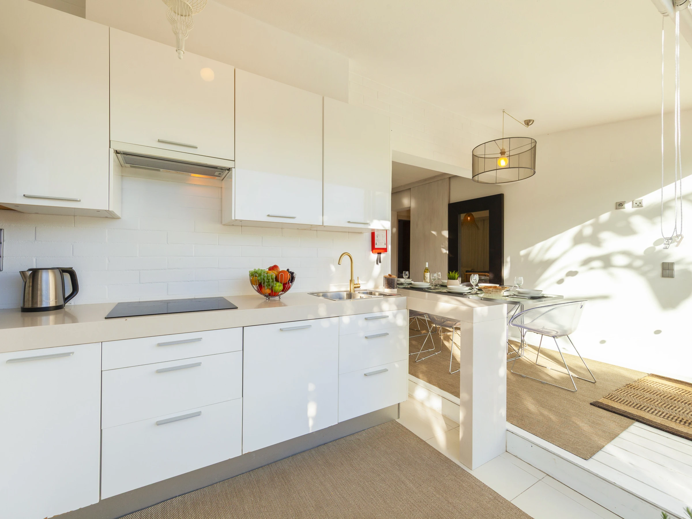 Die Wohnung verfügt über ein gemütliches Wohnzimmer und einen hellen Essbereich, beide in offener Raumgestaltung mit der Küche, was einen geräumigen und fließenden Raum schafft, der perfekt für Momente des Zusammenlebens und der Erholung ist. Der Essbereich hat direkten Zugang zur Terrasse und zum Swimmingpool, sodass man den Innen- und Außenbereich in völliger Harmonie genießen kann.