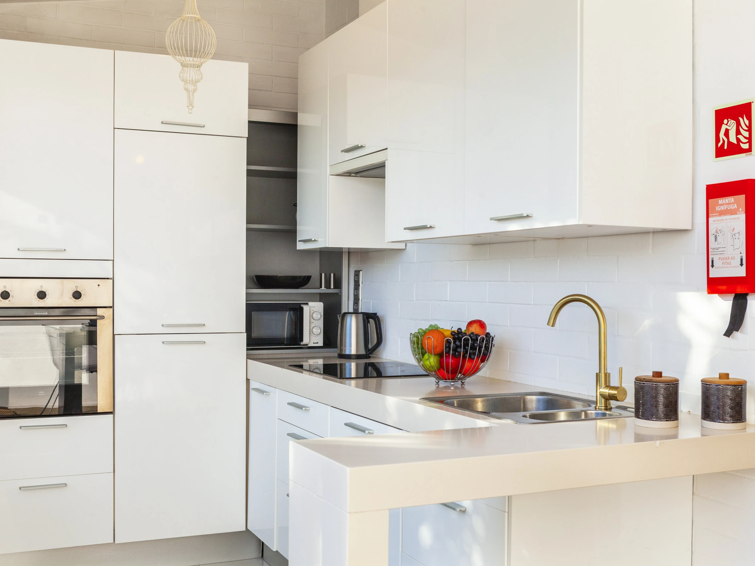 Die Küche im offenen Raum ist komplett ausgestattet und bietet alles, was man zum bequemen und praktischen Zubereiten von Mahlzeiten benötigt.