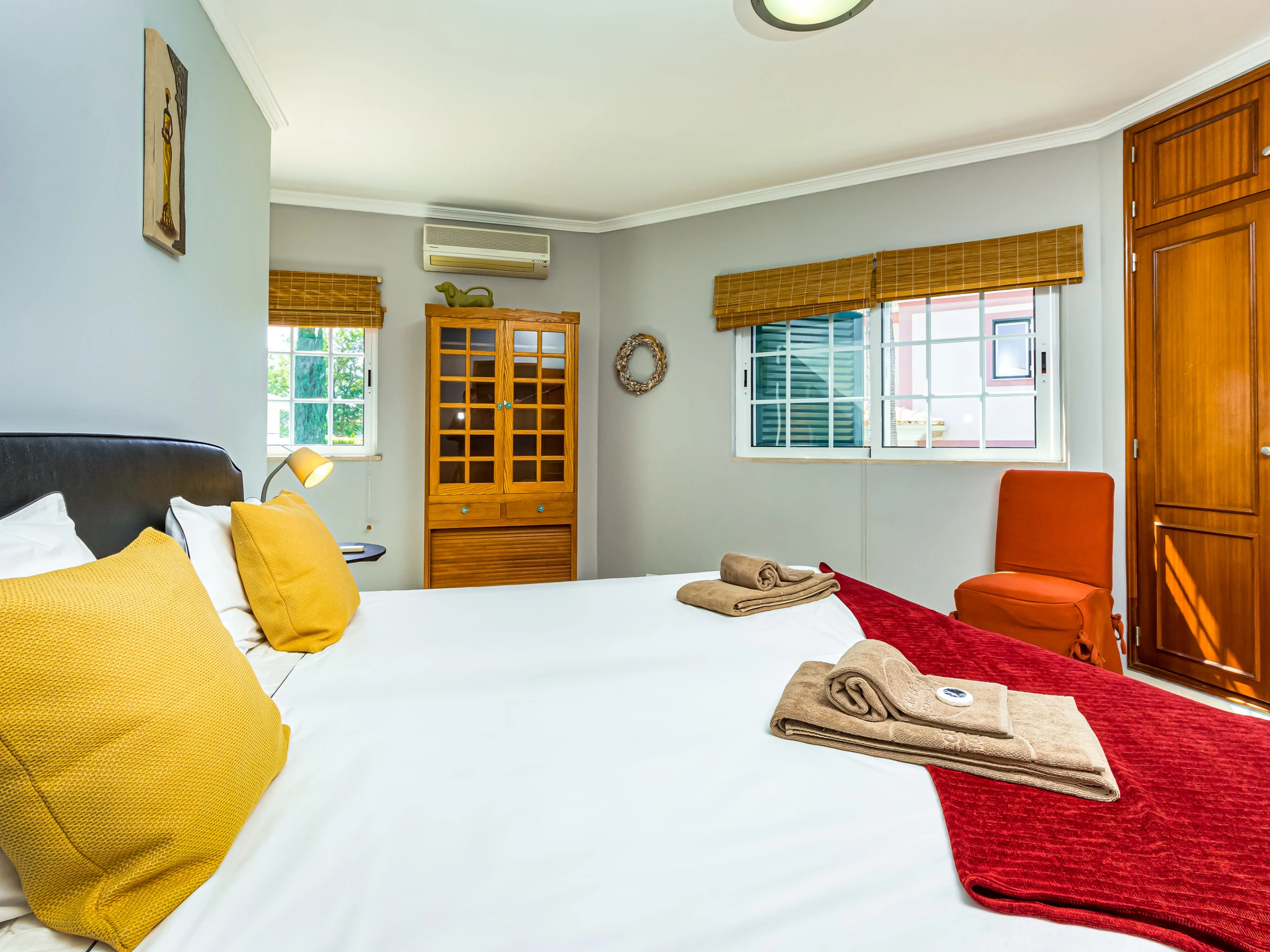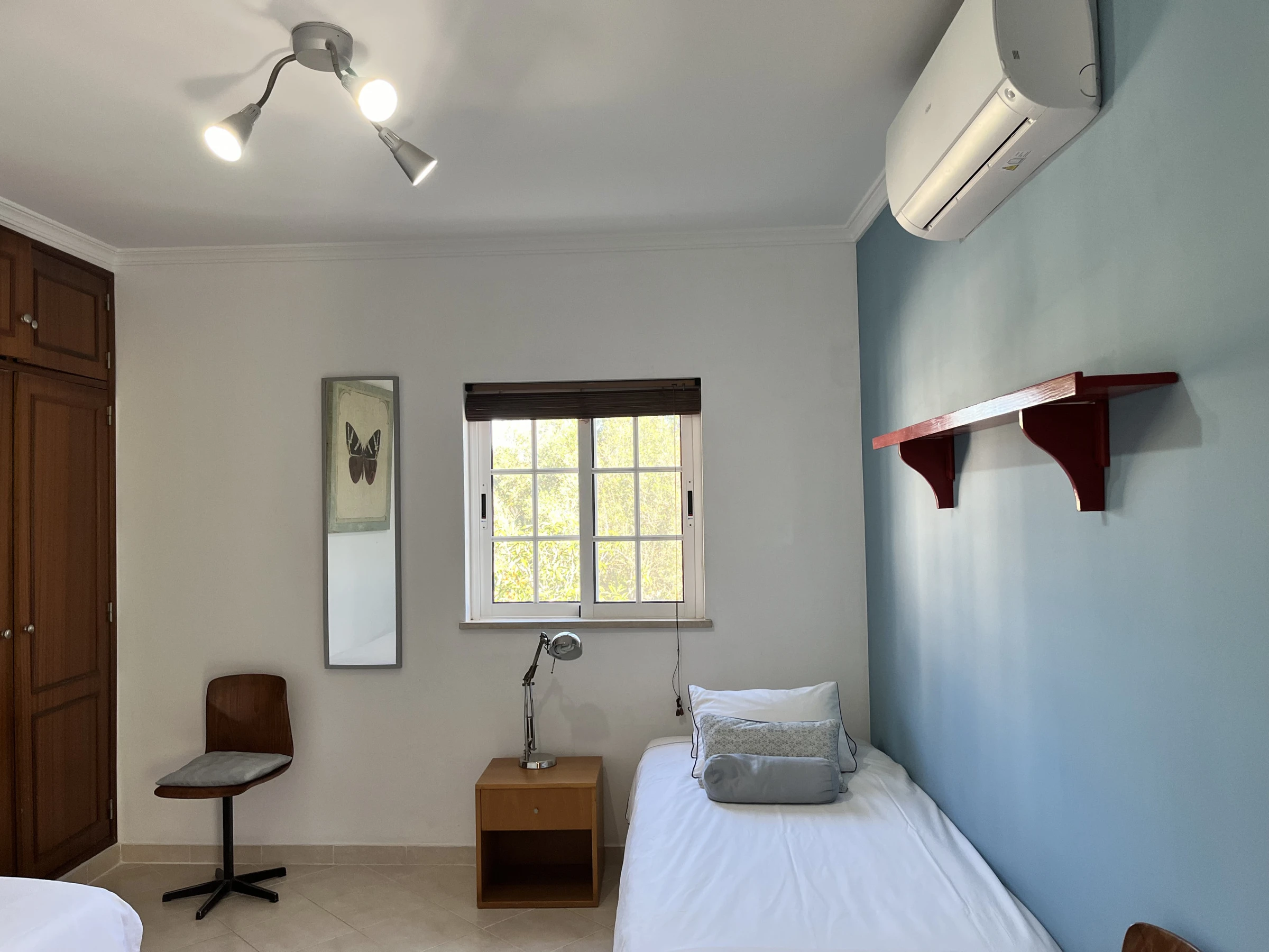 Ebenfalls im Erdgeschoss: ein Schlafzimmer mit zwei Einzelbetten, Kleiderschrank, Klimaanlage und Schiebetüren nach draußen.