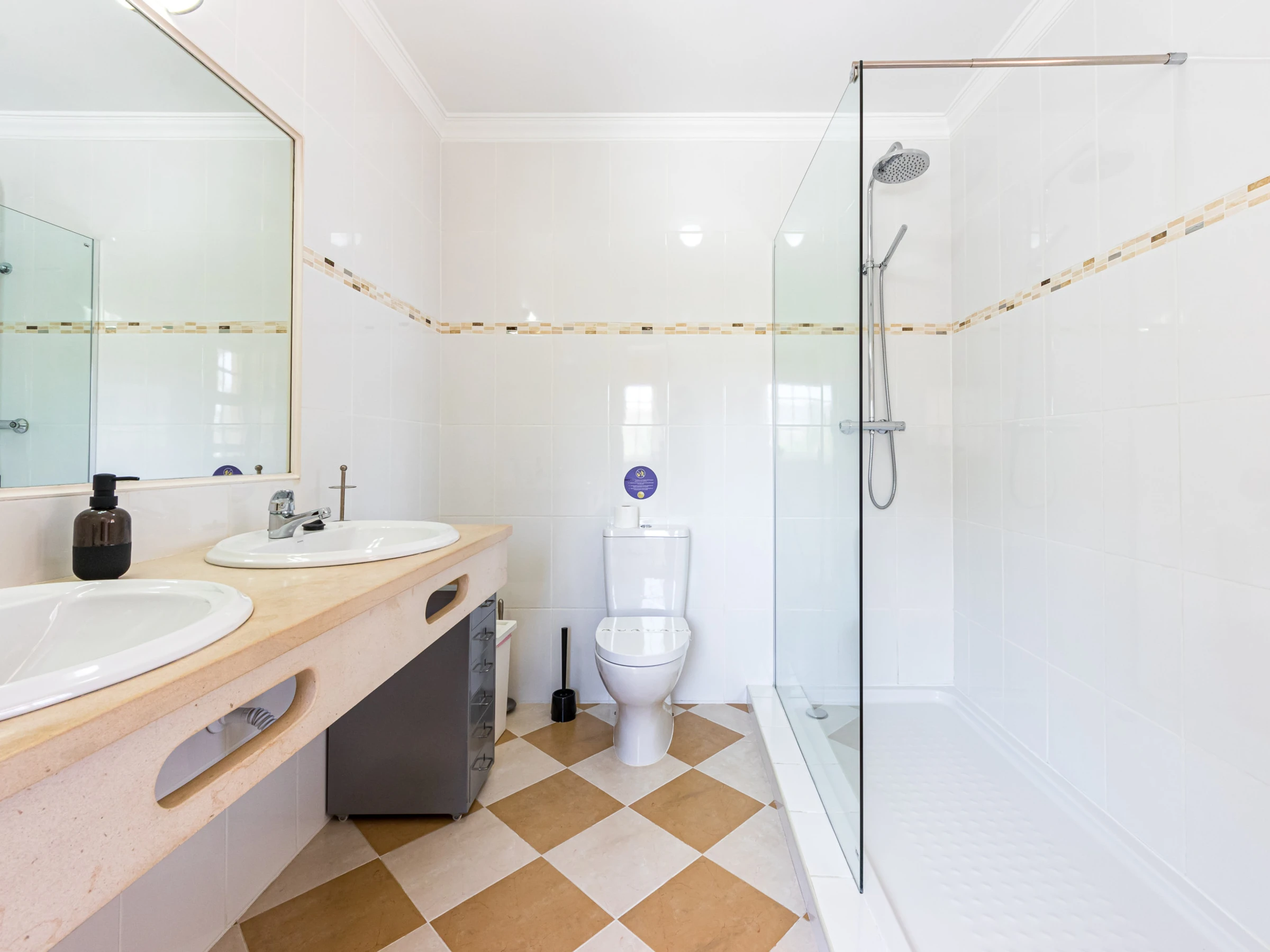 En-suite Duschbad mit begehbarer Dusche, Doppelwaschbecken und WC