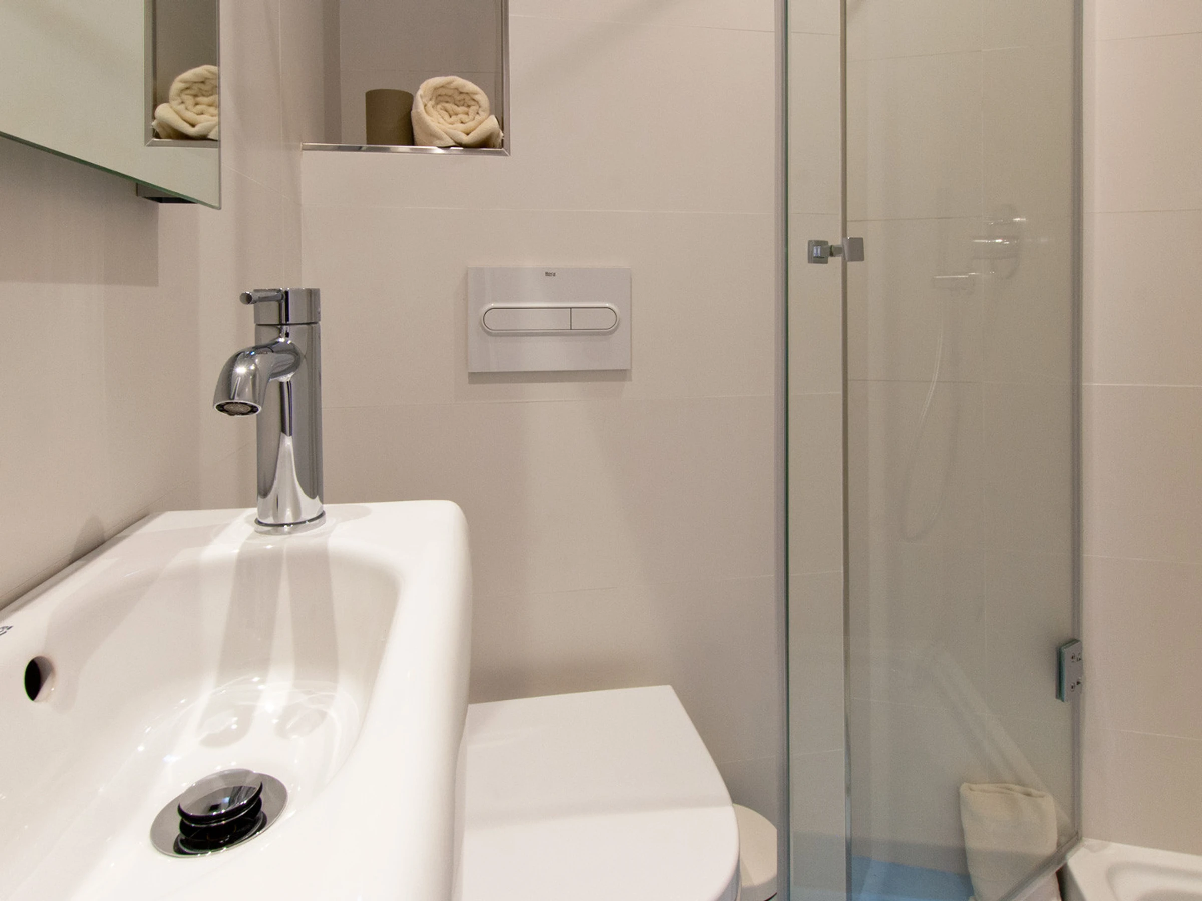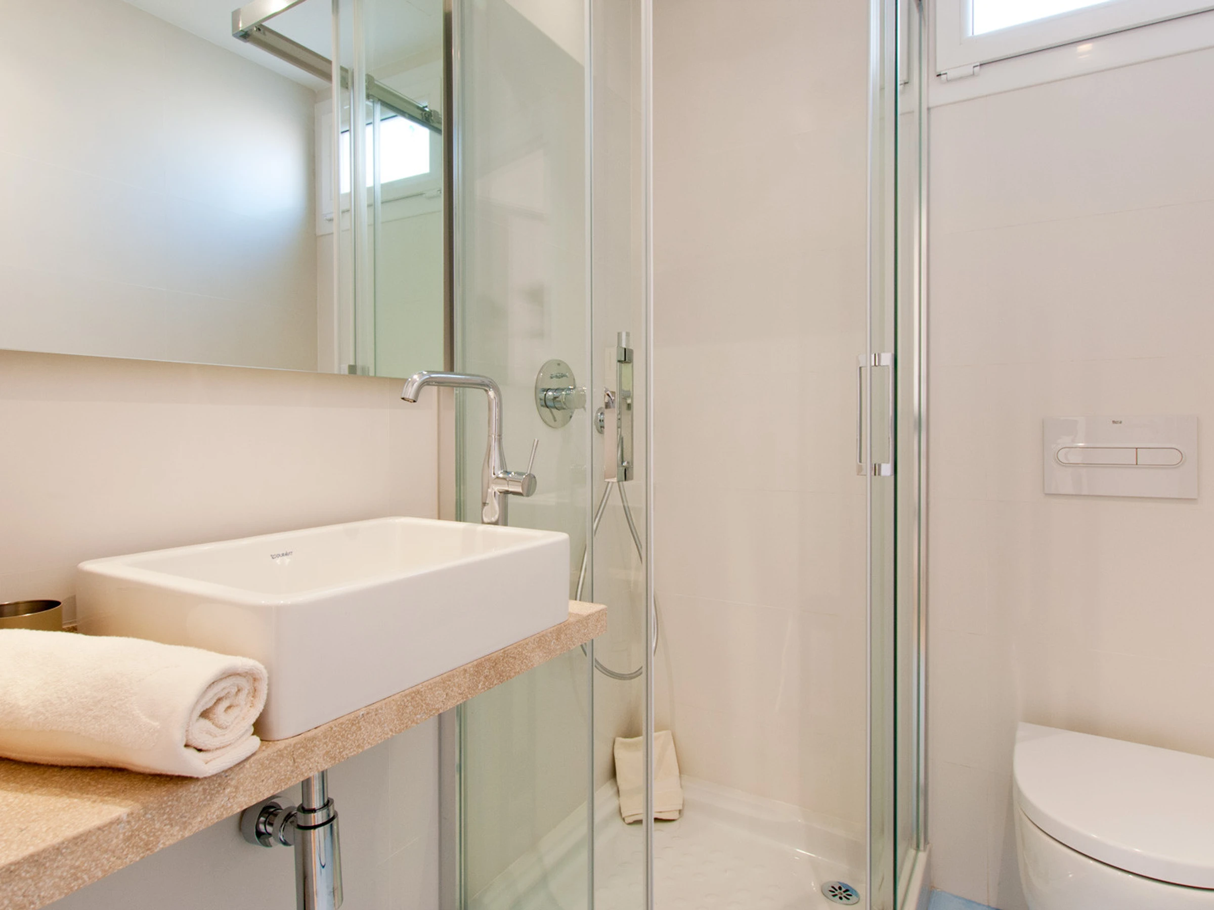 – Badezimmer 2: komplettes Badezimmer mit Dusche, Waschbecken und Toilette.