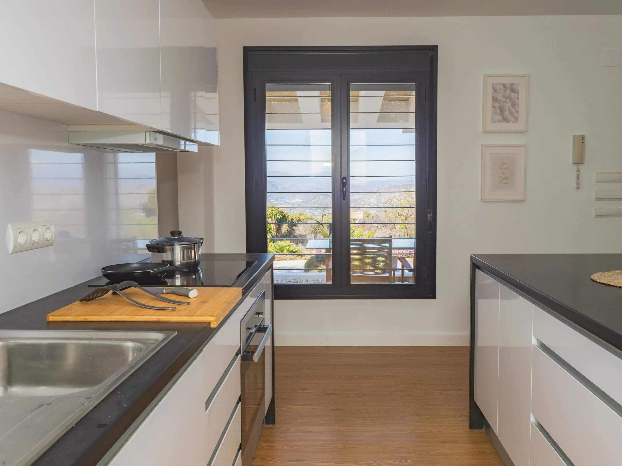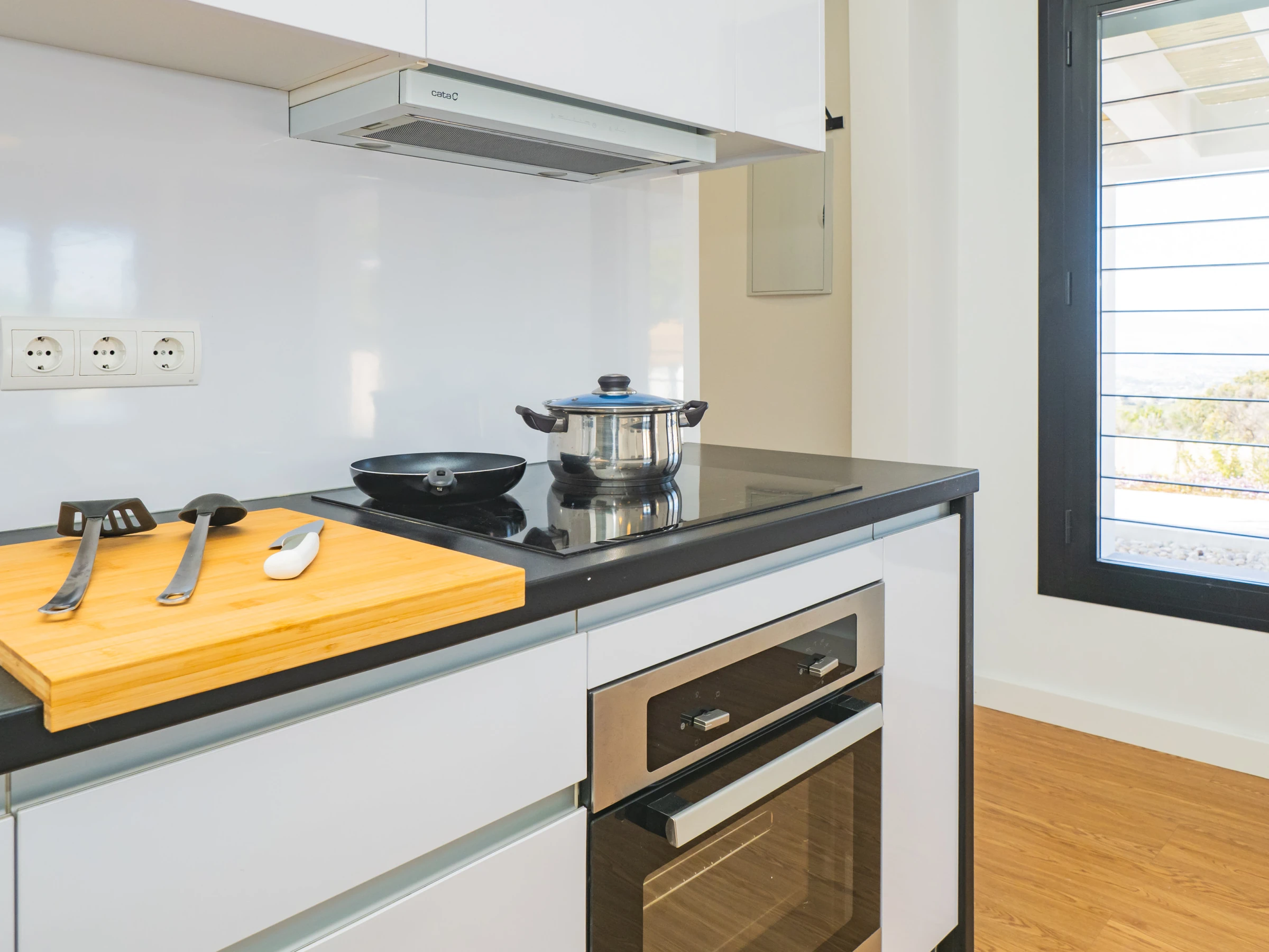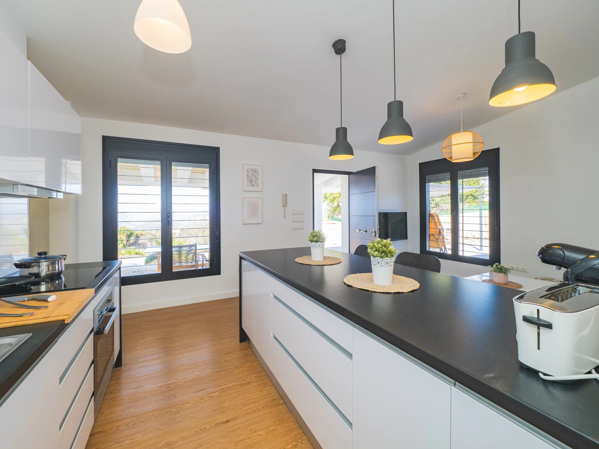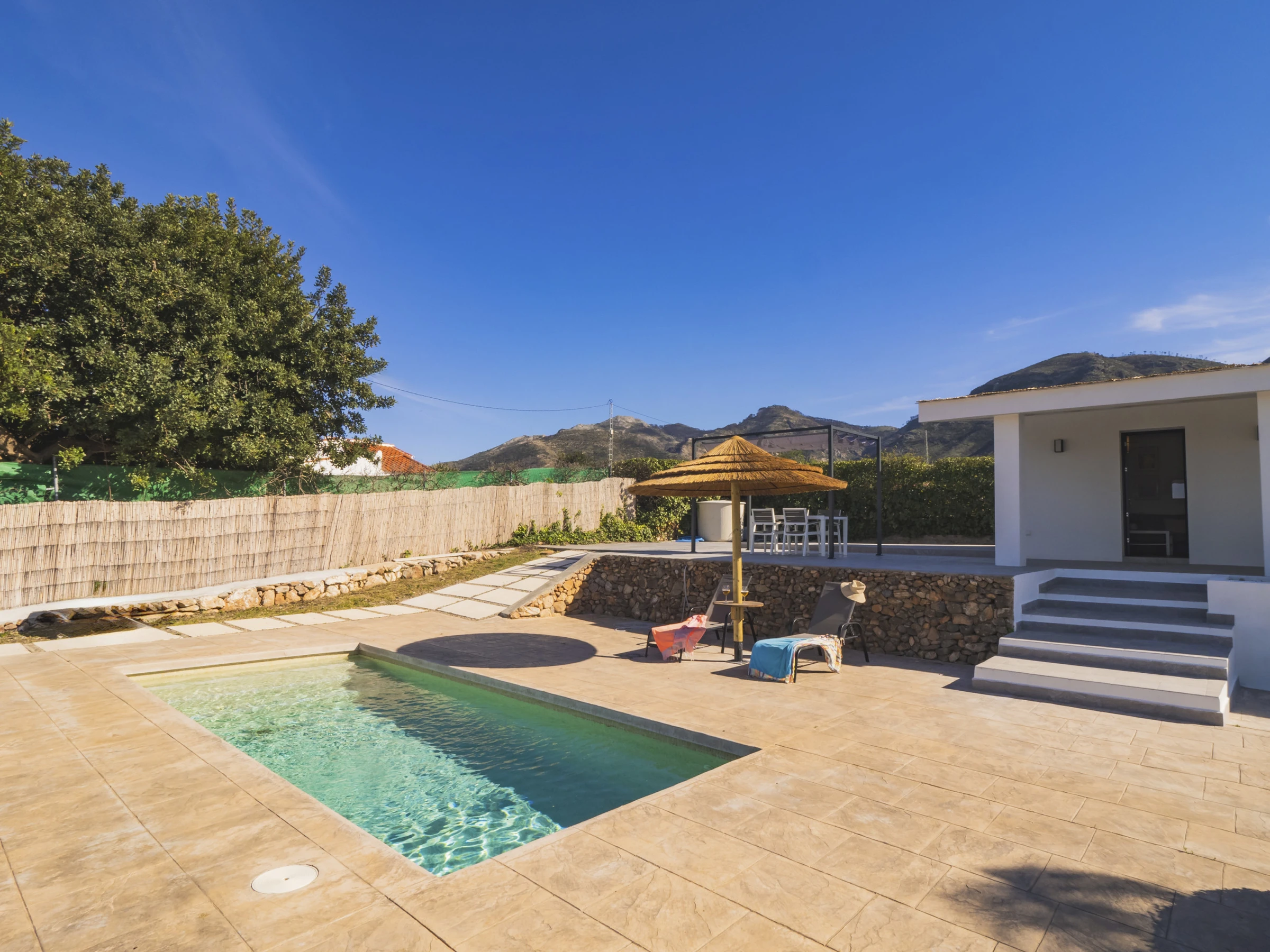 Genieße unvergessliche Momente im privaten Pool, perfekt für sonnige Tage, oder entspanne dich in den Liegestühlen und auf der Terrasse im Freien, die für deinen Komfort und deine Ruhe gestaltet sind. Im Inneren warten ein geräumiger Wohn-Essbereich mit gemütlichem Sofa und eine offene Küche, ausgestattet mit Kühl-Gefrierkombination, Bosch Tassimo Kaffeemaschine, Wasserkocher, Bügeleisen und sogar einem elektrischen Grill zum Kochen im Freien, um dich wie zu Hause fühlen zu lassen.