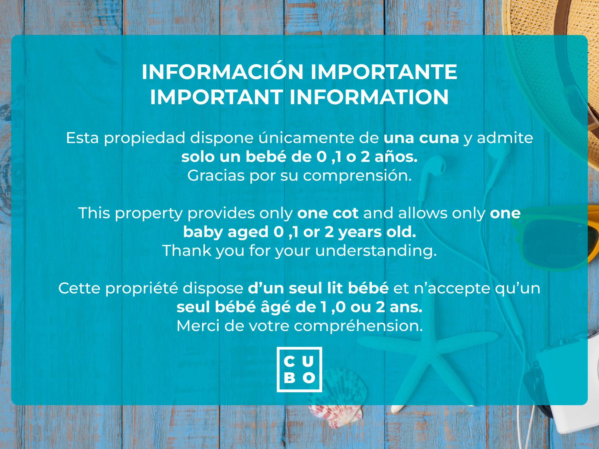 Wie wir es auch in allen anderen Immobilien unserer Marke CUBO'S HOLIDAY HOMES tun, verfügen alle unsere Unterkünfte über Handtuch- und Bettwäschesets. Wir bieten Kinderbetten und Hochstühle auf Anfrage für Babys von 0 bis 2 Jahren an. Und das Beste: Alles ist absolut KOSTENLOS.
