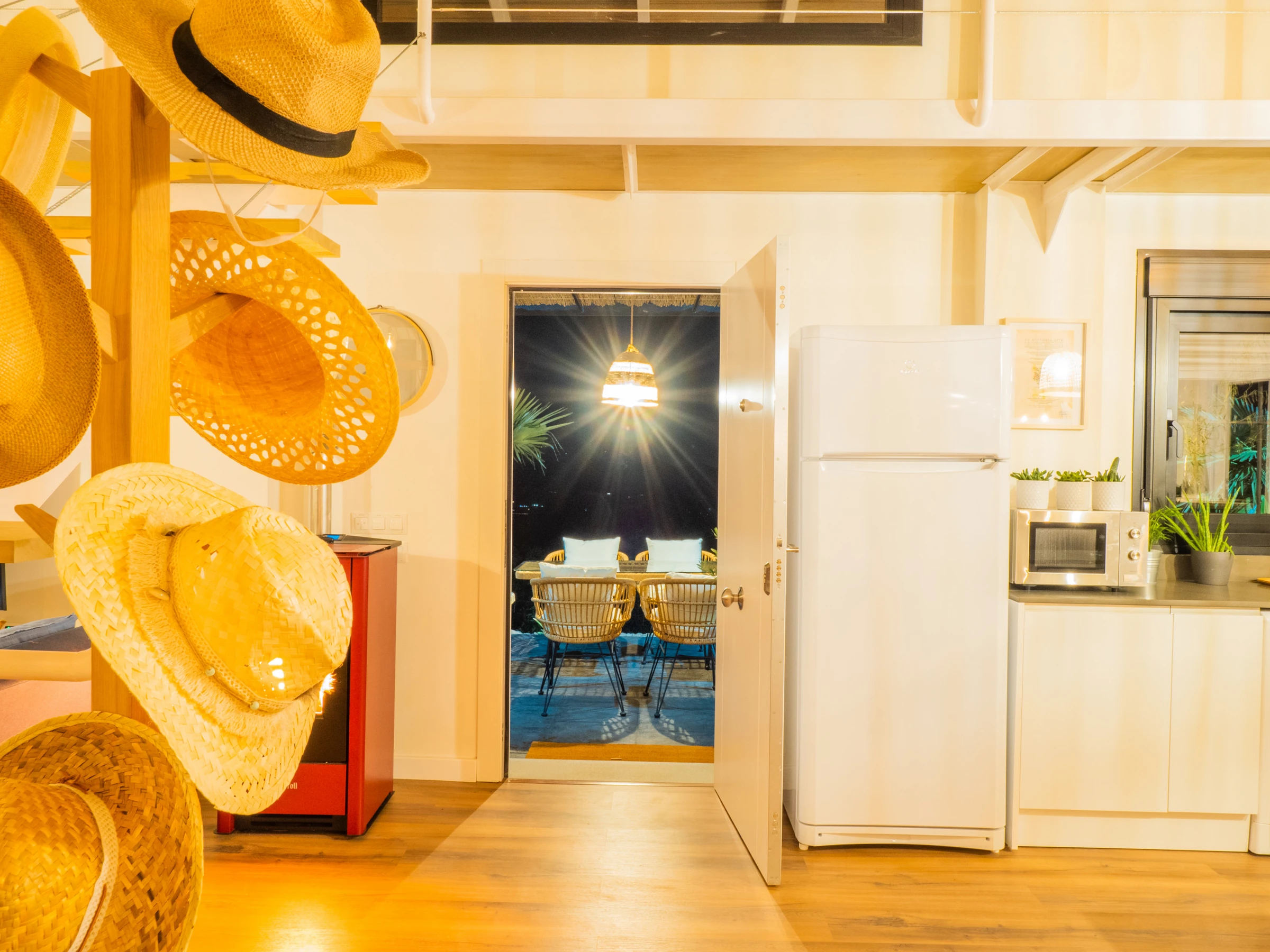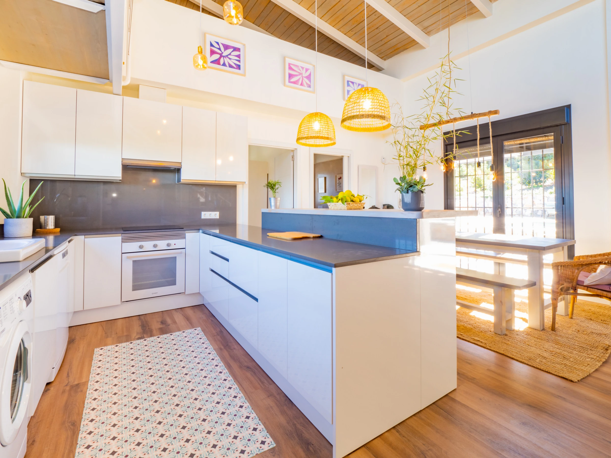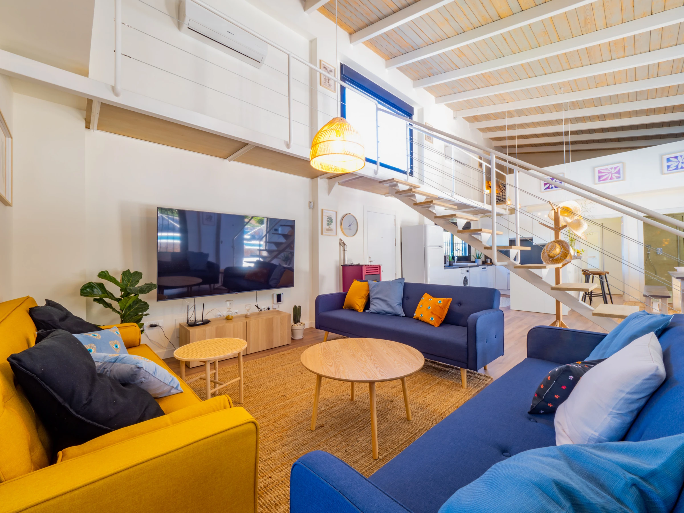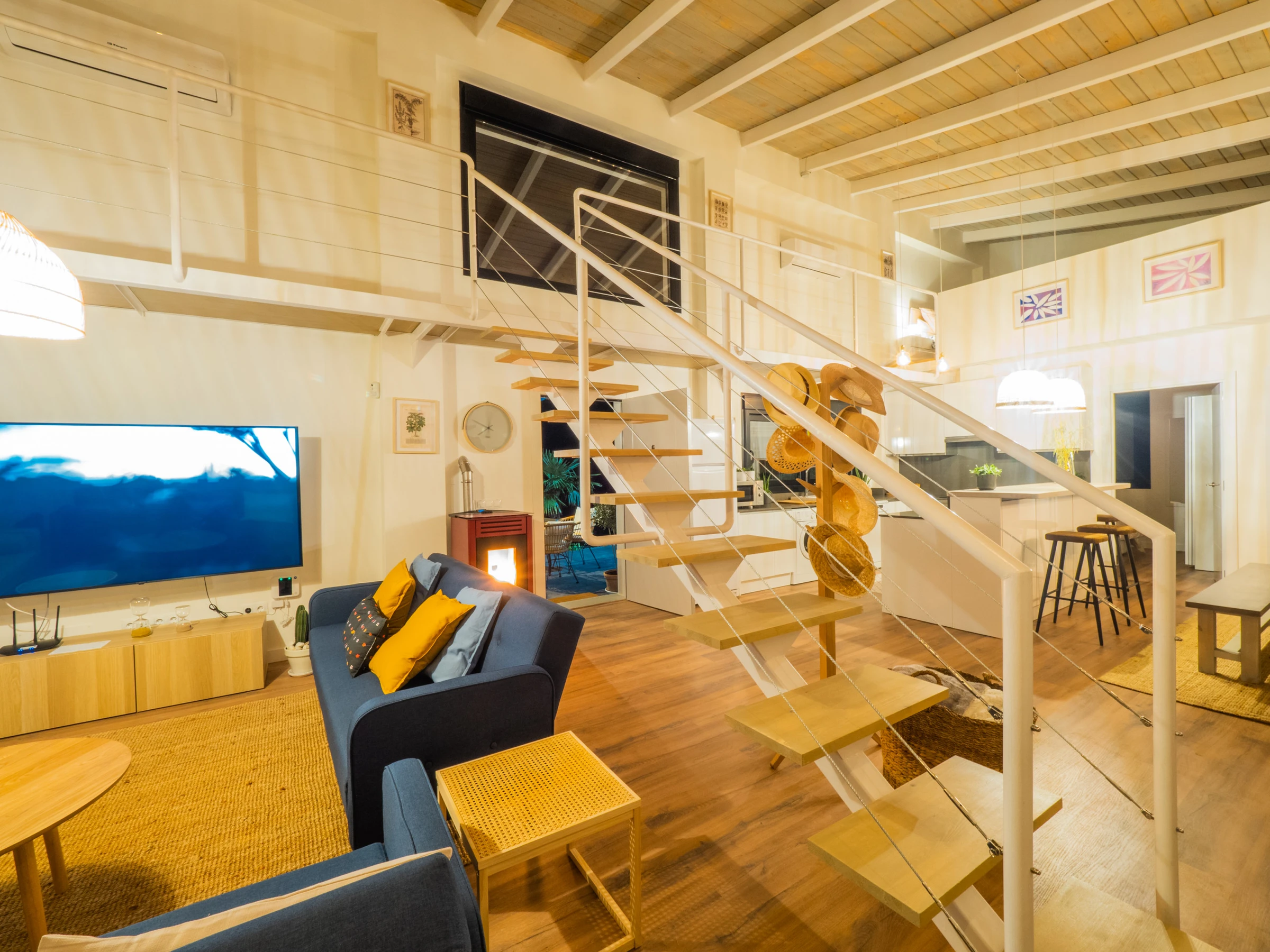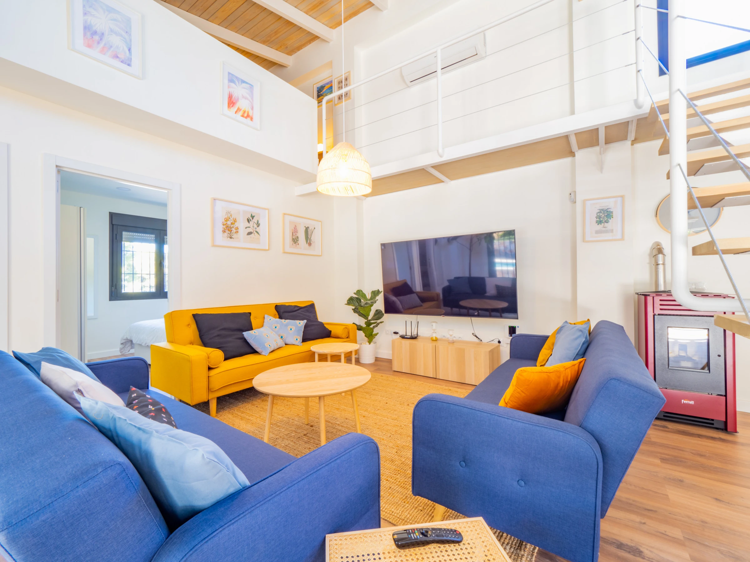 Der Innenraum von 150 m² ist offen, mit Küche, Esszimmer und Wohnzimmer, die miteinander verbunden sind, um das Zusammenleben zu erleichtern. Es verfügt über sechs Plätze in Jugendzimmern im Obergeschoss und zwei Schlafzimmer im Erdgeschoss, von denen jedes ein vollständiges Badezimmer mit Dusche hat. Die Einrichtung ist sorgfältig und funktional, mit Klimaanlage in allen Räumen, Pelletkamin, modernen Haushaltsgeräten und High-Speed-WLAN für Streaming auf dem Smart-TV 📺❄️🔥.