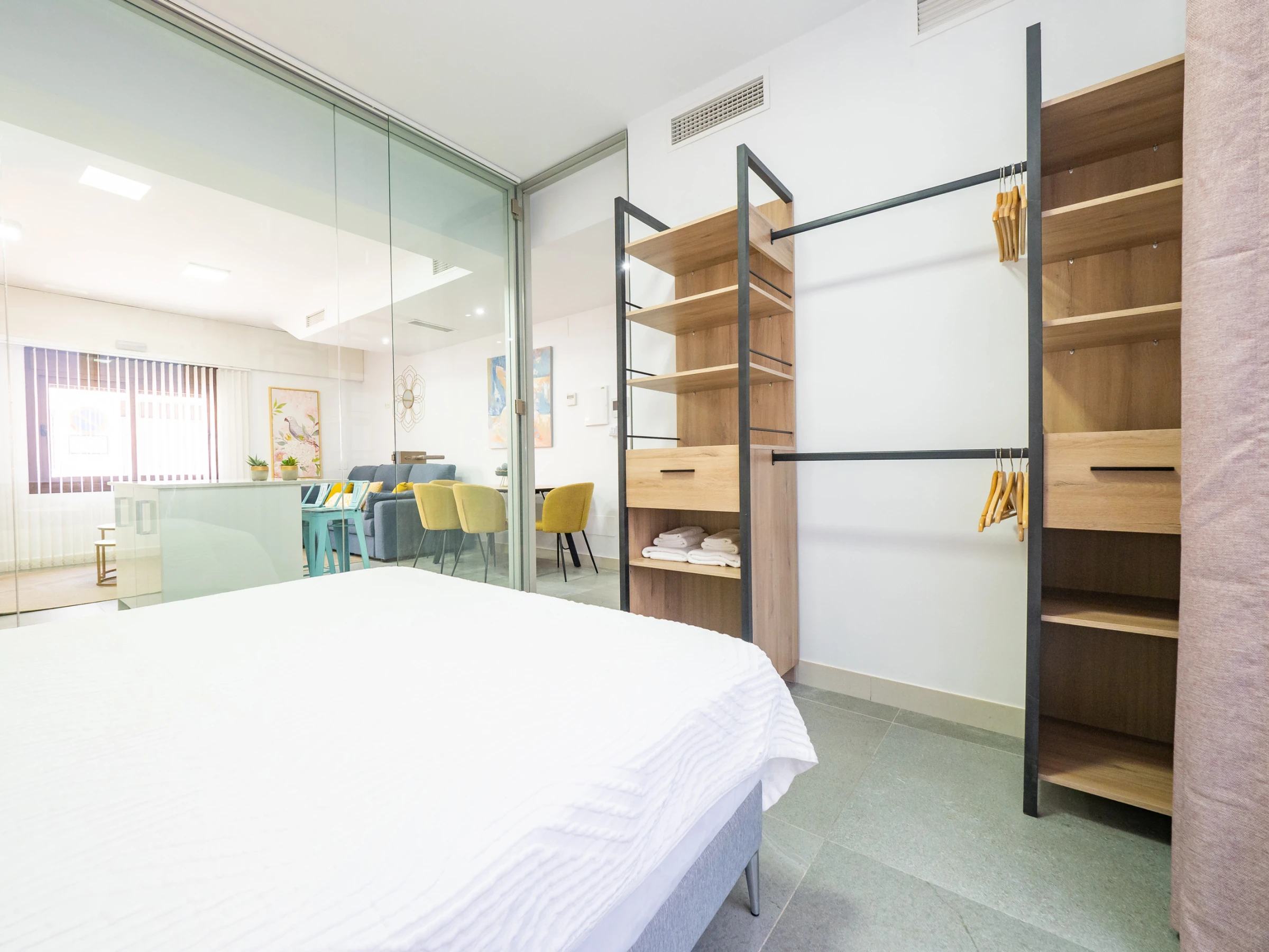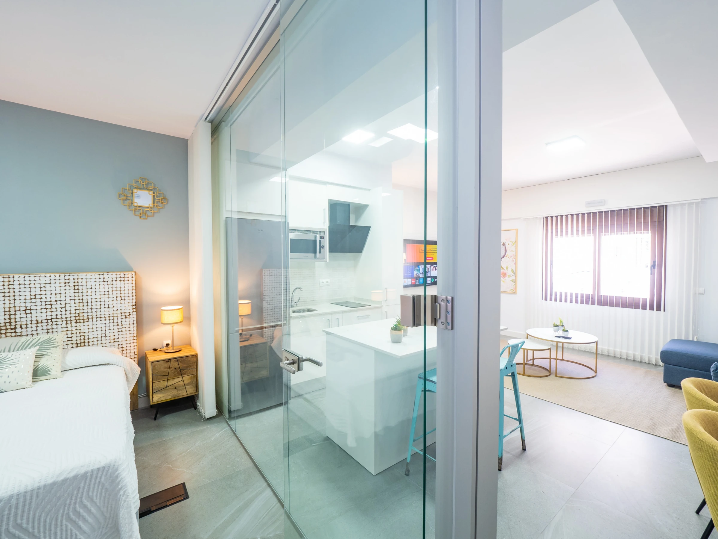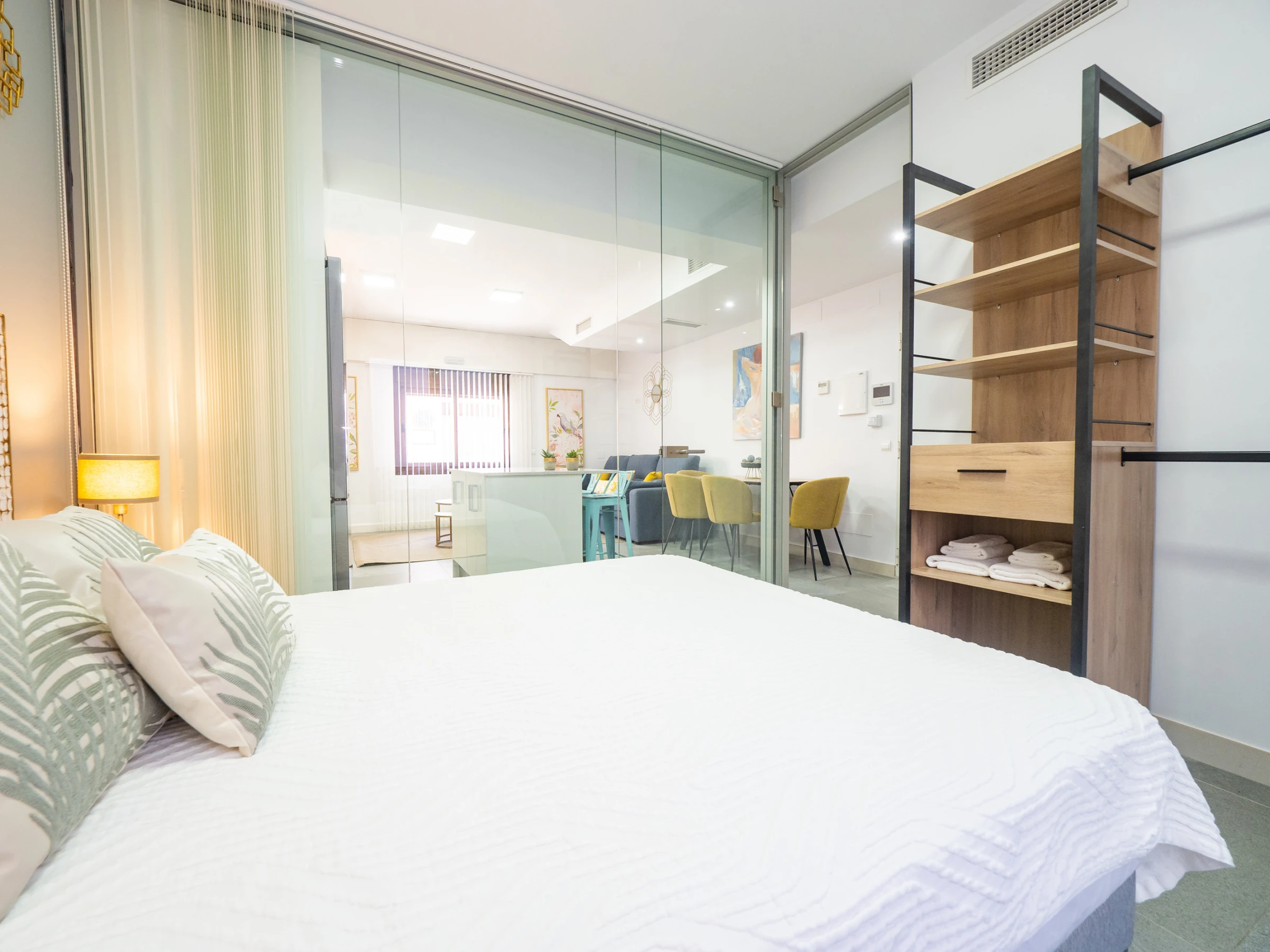 Der geräumige Speise- und Wohnbereich integriert eine moderne amerikanische Küche mit Glaskeramikkochfeld und allen notwendigen Haushaltsgeräten: Kühlschrank, Mikrowelle, Backofen, Gefrierschrank, Waschmaschine, Kaffeemaschine, Toaster, Wasserkocher und Entsafter. In diesem offenen Raum bietet ein Smart-TV Zugang zu Kanälen und Multimedia-Anwendungen für vollständige Unterhaltung während des Aufenthalts. Darüber hinaus bringt das Außenfenster natürliches Licht und verfügt über exklusive Vorhänge und einen automatischen Rollladen für maximale Privatsphäre.