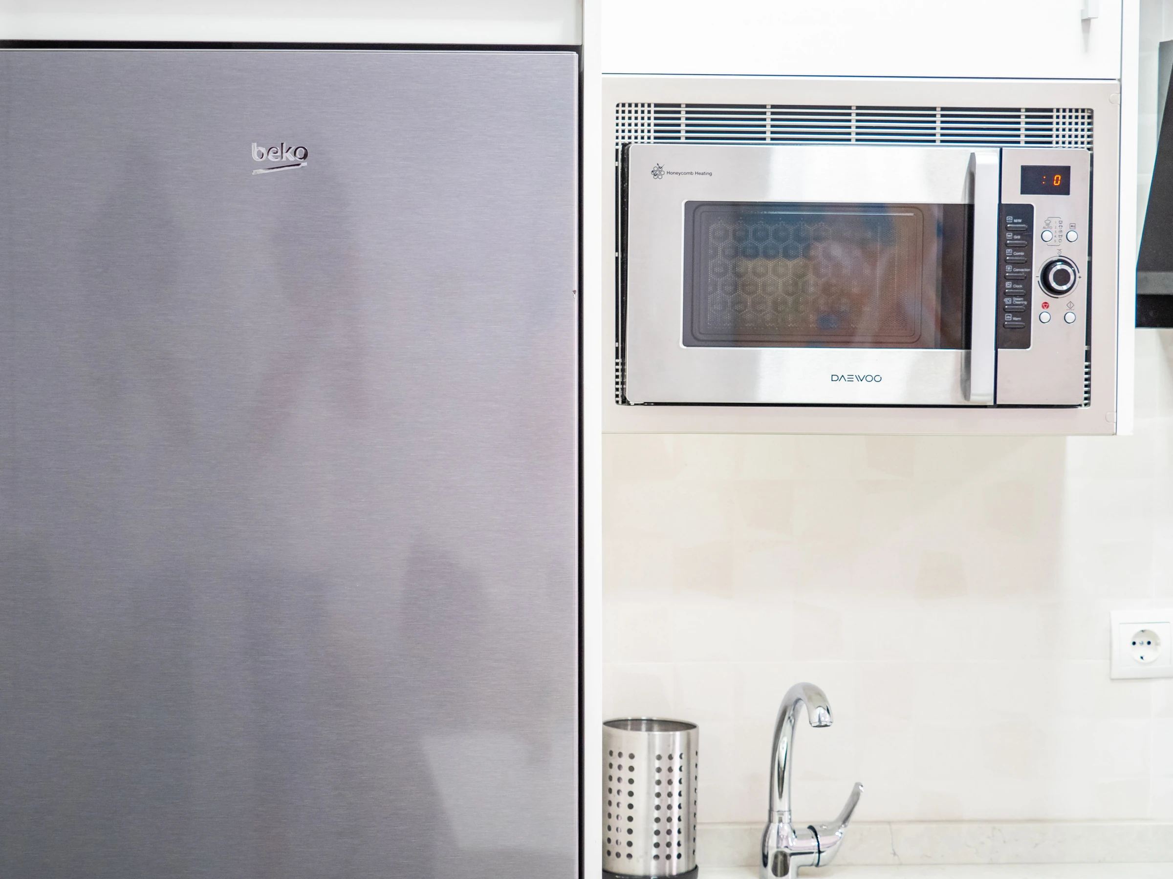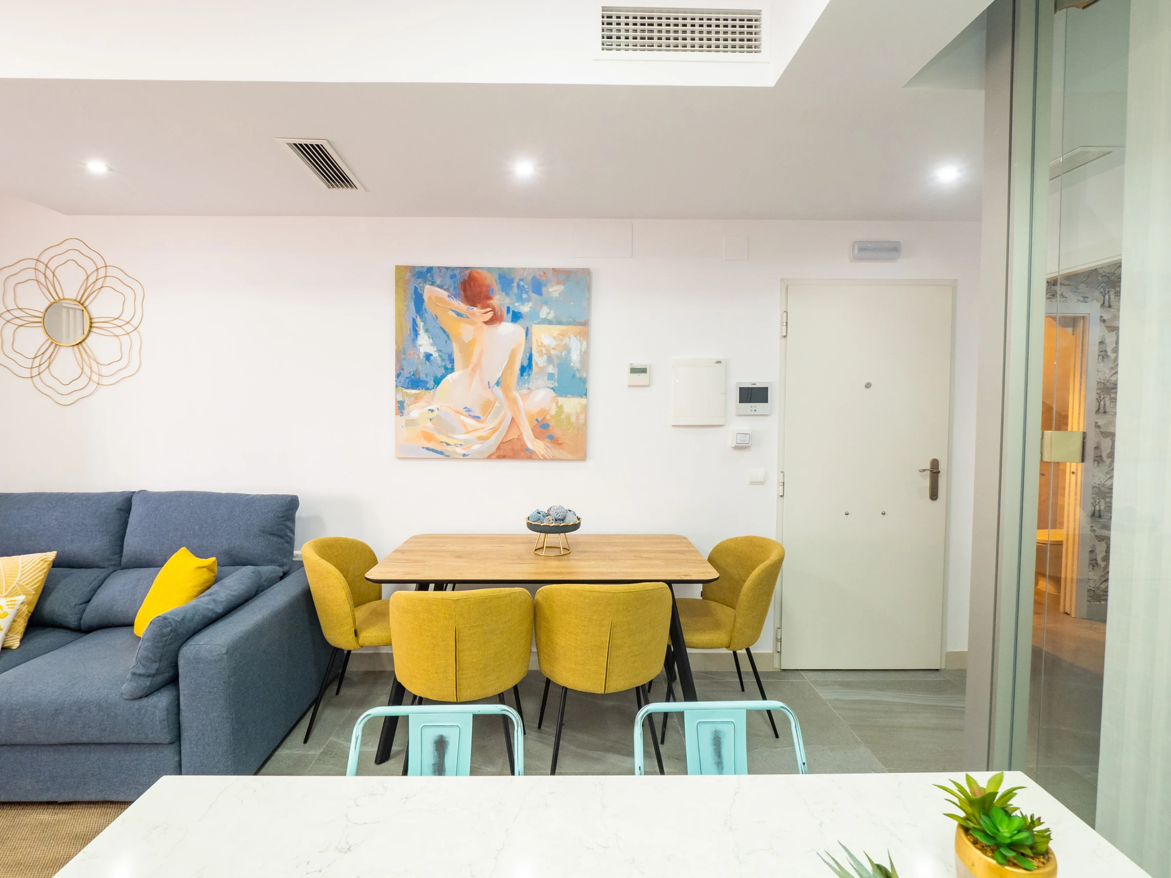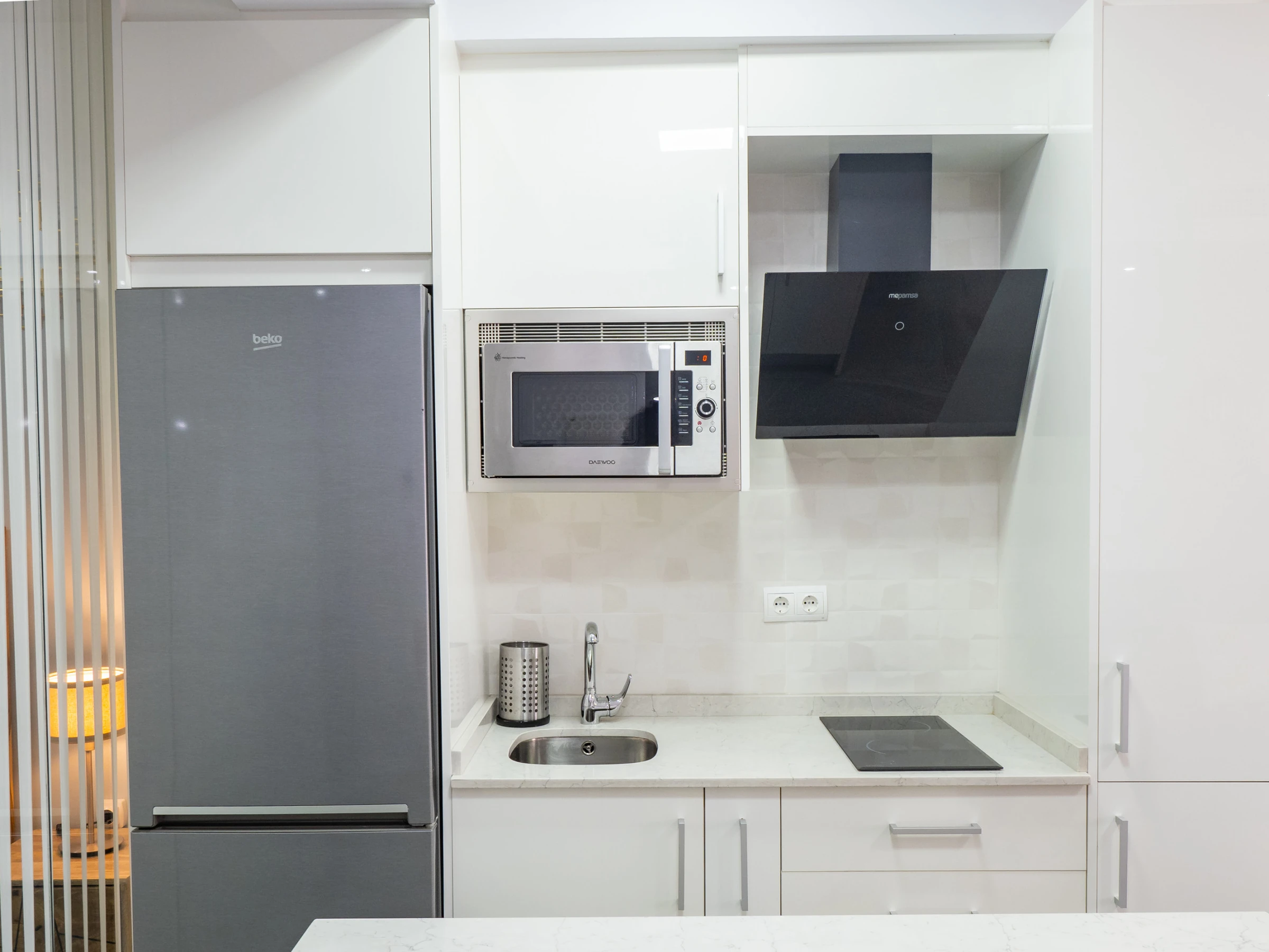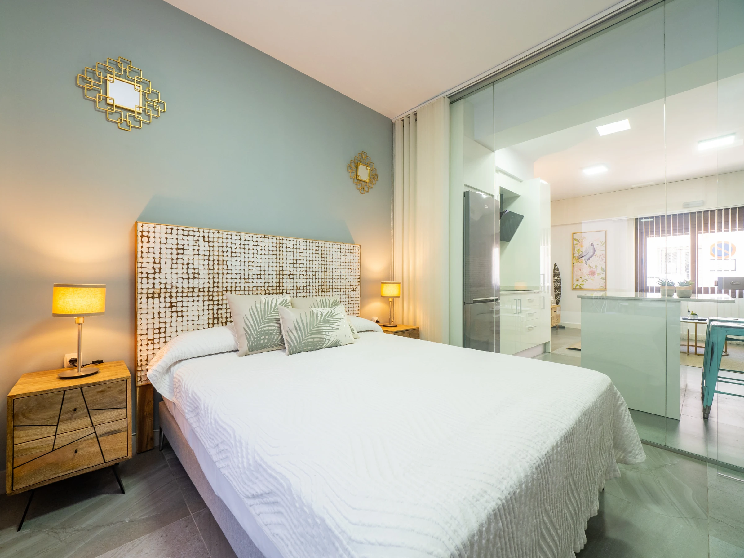 Der geräumige Speise- und Wohnbereich integriert eine moderne amerikanische Küche mit Glaskeramikkochfeld und allen notwendigen Haushaltsgeräten: Kühlschrank, Mikrowelle, Backofen, Gefrierschrank, Waschmaschine, Kaffeemaschine, Toaster, Wasserkocher und Entsafter. In diesem offenen Raum bietet ein Smart-TV Zugang zu Kanälen und Multimedia-Anwendungen für vollständige Unterhaltung während des Aufenthalts. Darüber hinaus bringt das Außenfenster natürliches Licht und verfügt über exklusive Vorhänge und einen automatischen Rollladen für maximale Privatsphäre.