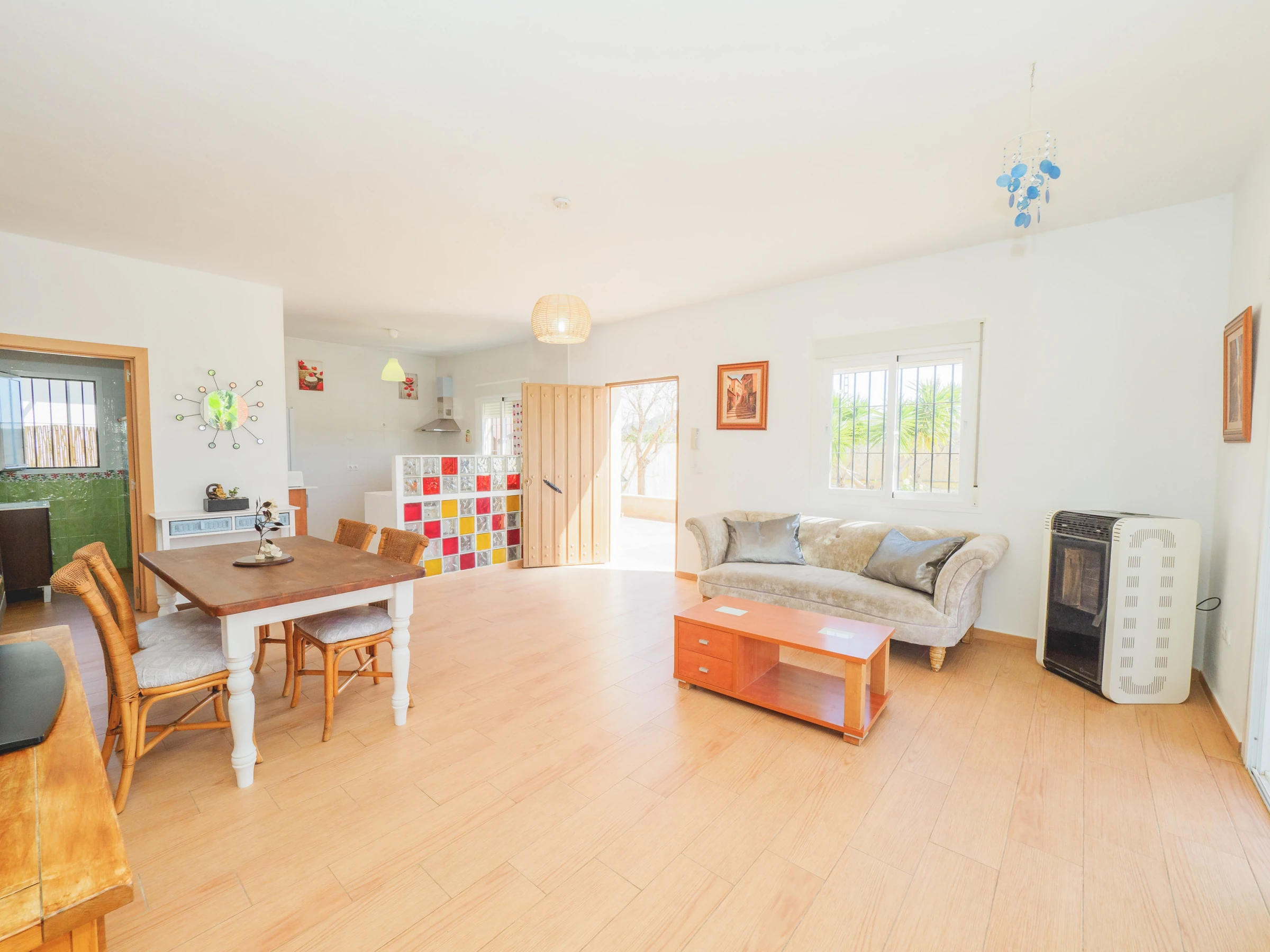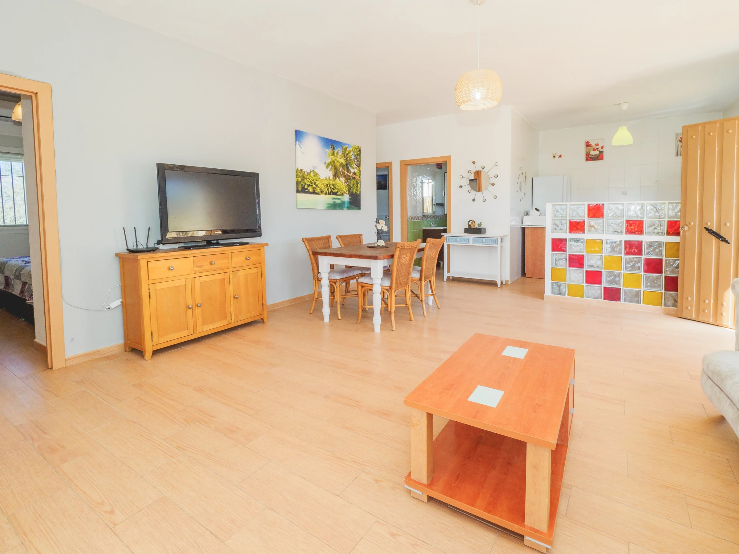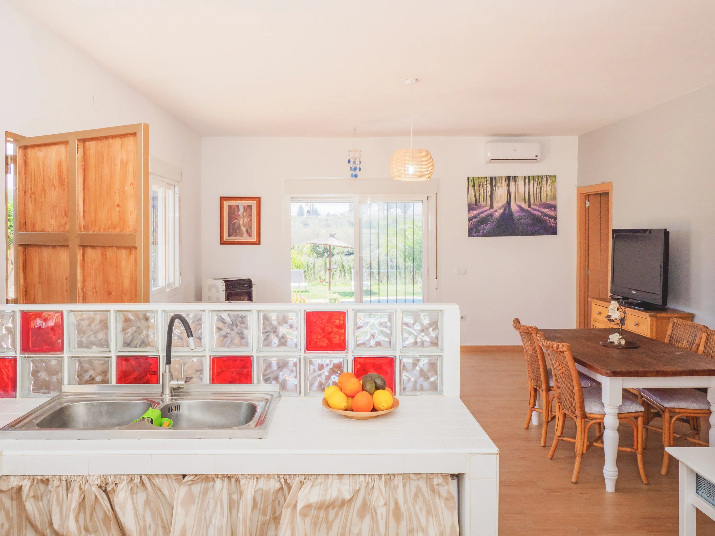 Die Hauptzone der Unterkunft, auf die man über zwei große Fenster zur Veranda oder durch eine Tür an der linken Seite der Unterkunft zugreifen kann. Dieser Bereich besteht aus dem Wohn-Esszimmer und der offenen Küche. Sie können hier kochen oder auf dem Sofa entspannen, während Sie fern sehen.