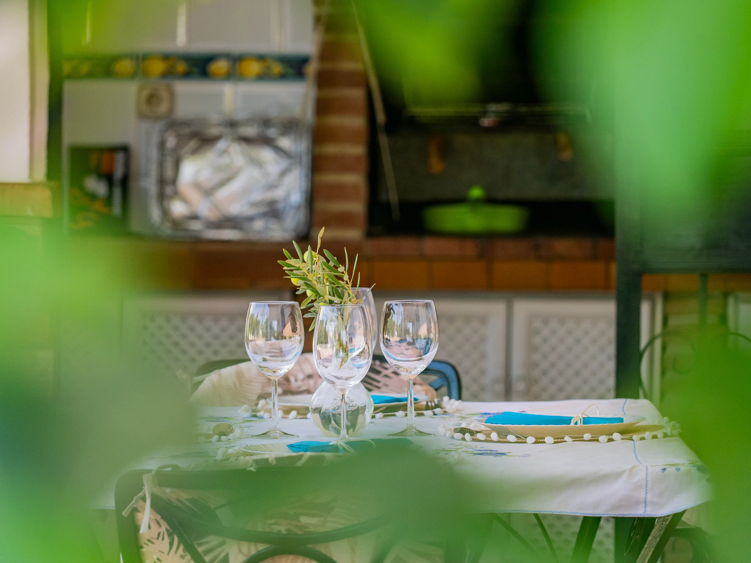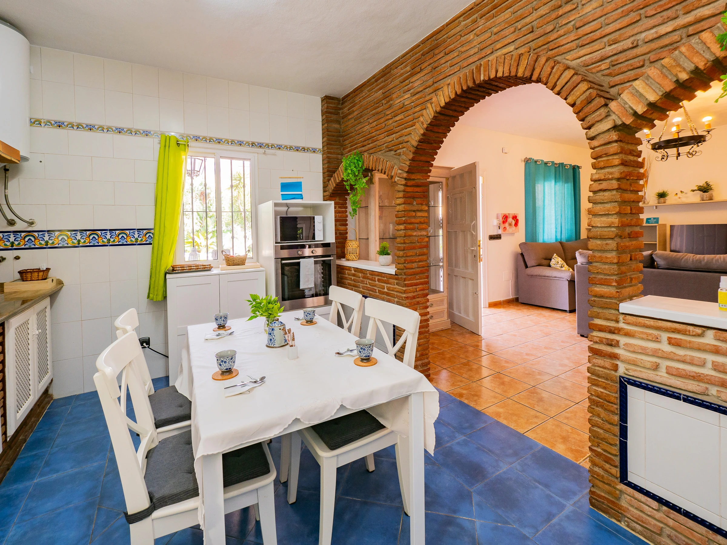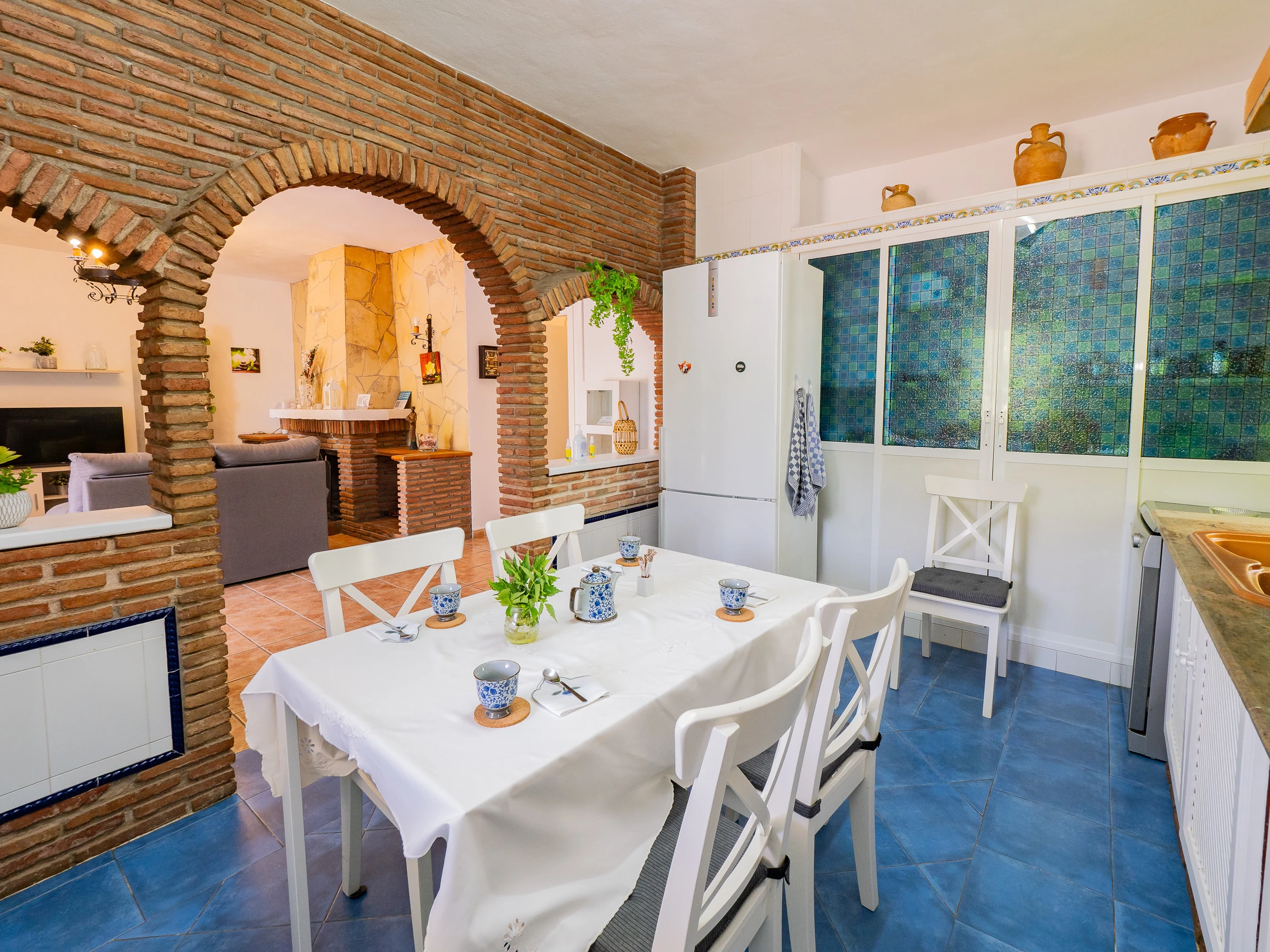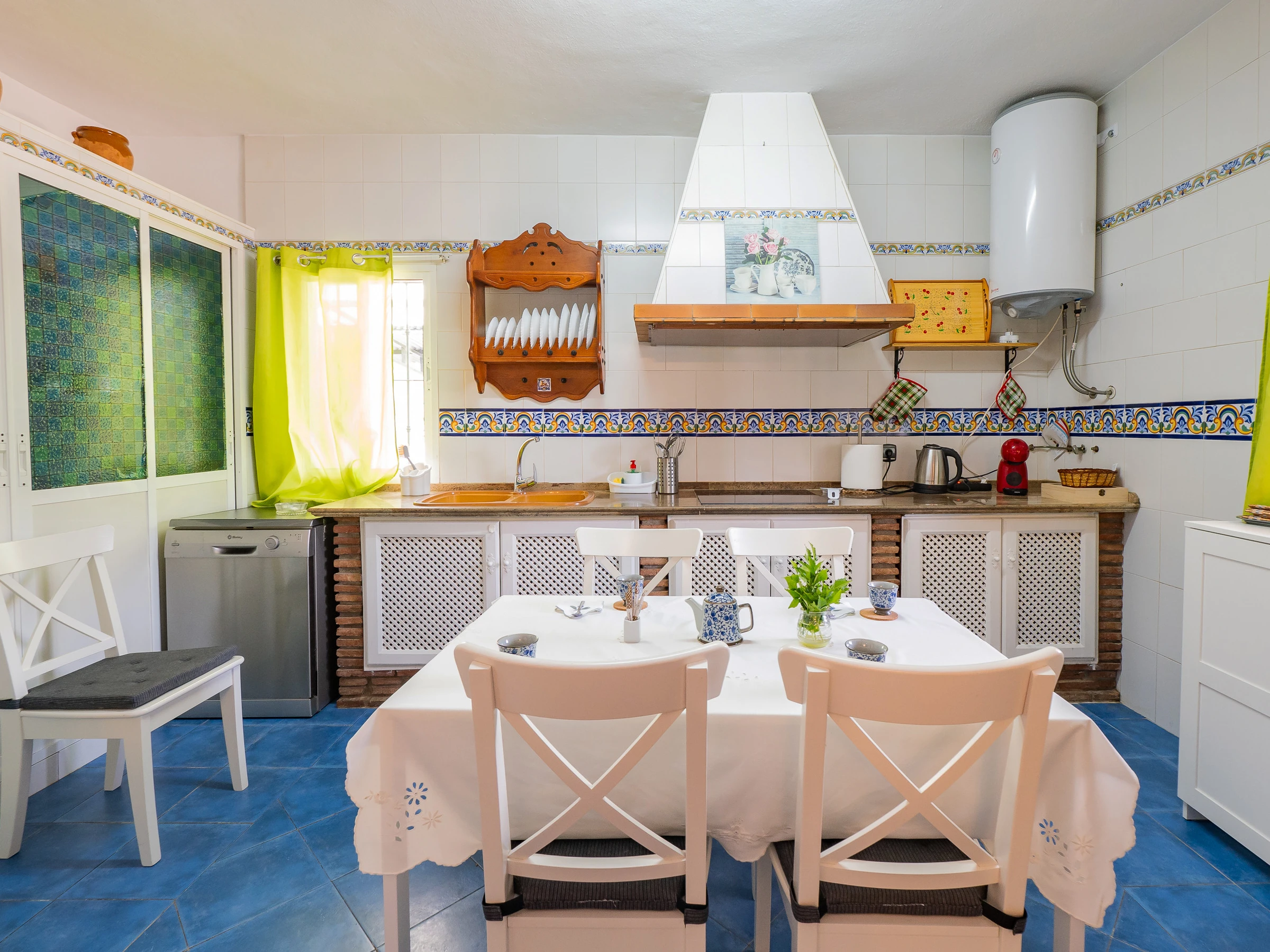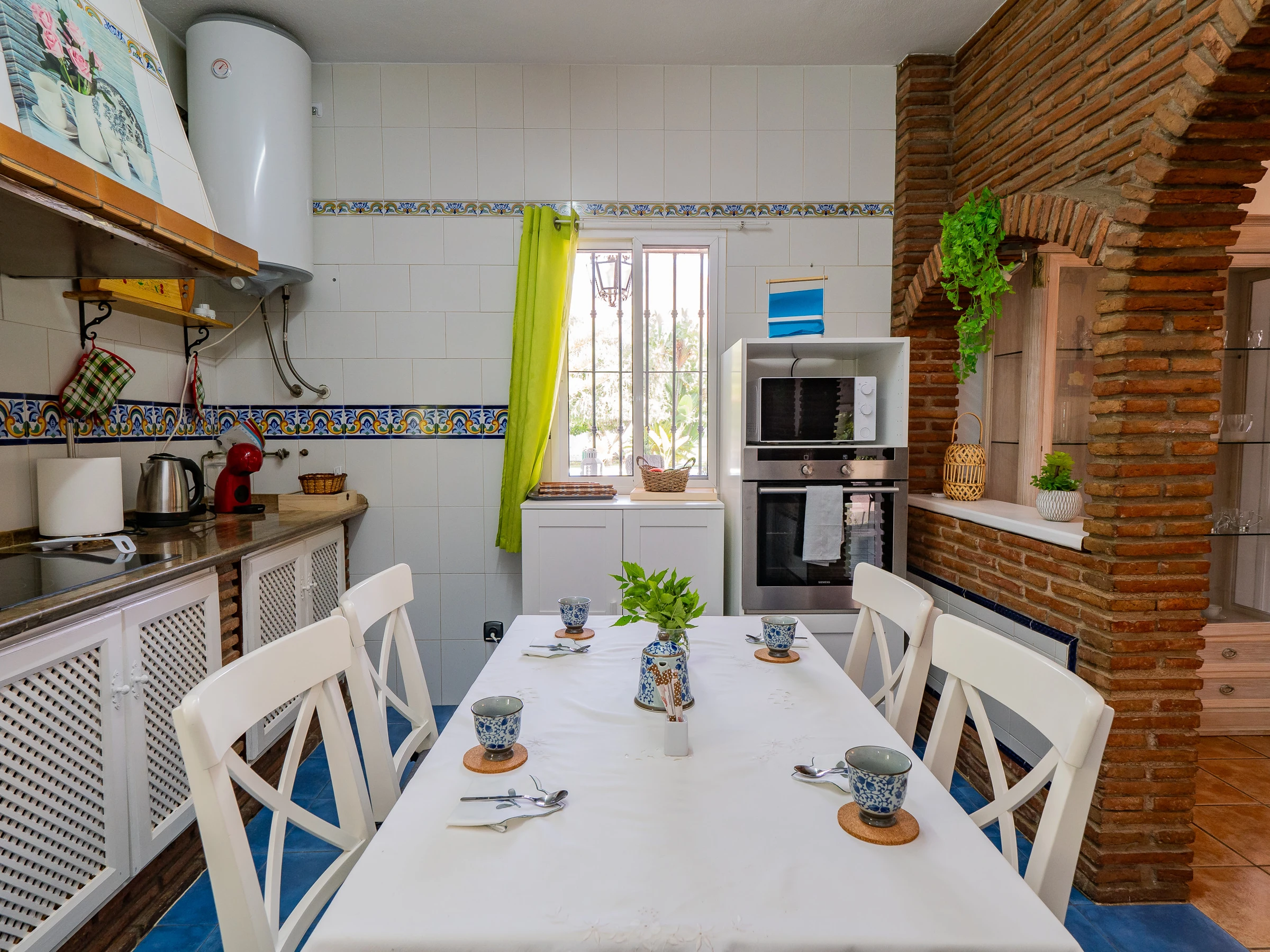 Die Küche, unabhängig, aber durch schöne Bögen verbunden, ist komplett ausgestattet mit Glaskeramikkochfeld, Kühlschrank, Mikrowelle, Backofen, Gefrierschrank, Waschmaschine, Geschirrspüler, Kaffeemaschine, Toaster, Wasserkocher und Entsafter, perfekt um jede Mahlzeit mit Leichtigkeit und Komfort zuzubereiten.