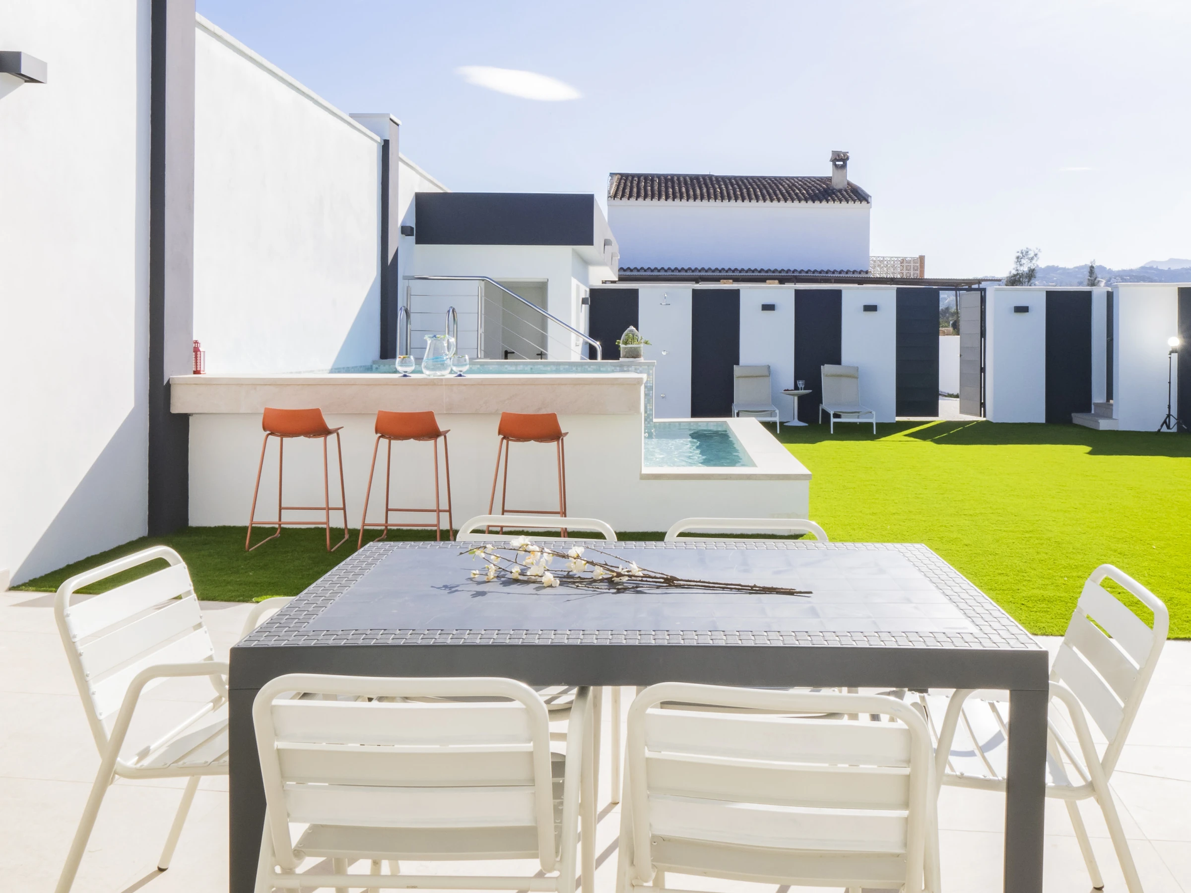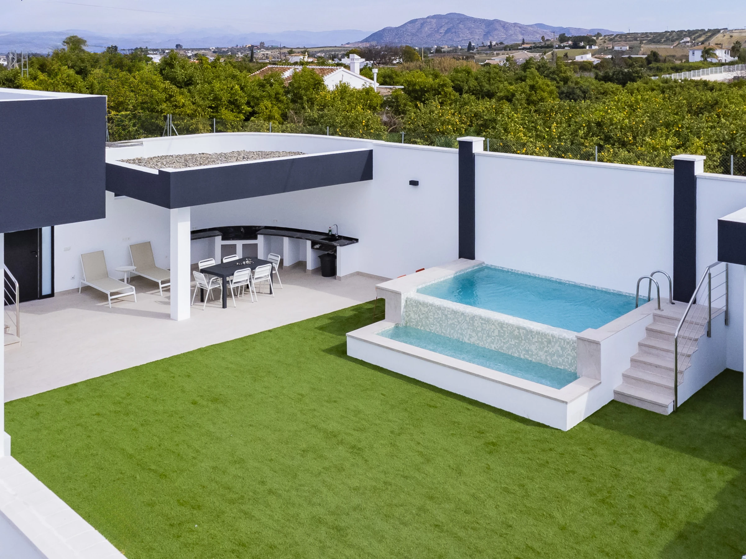 Genieße ein Ferienhaus für 12 Personen, das sich zwischen Coín und Alhaurín el Grande befindet, mit einfachem Zugang zu Supermärkten, Einkaufszentren und hervorragenden Straßenverbindungen, um die wunderschöne Region Málaga und ihre Küste zu erkunden. Diese Immobilie ist ideal für zwei Familien, die Urlaub zusammen verbringen möchten, ohne ihre Unabhängigkeit zu verlieren, da sie zwei Wohnungen umfasst, die durch eine Außentreppe verbunden sind, und zwei Außenbereiche mit eigenen Pools.