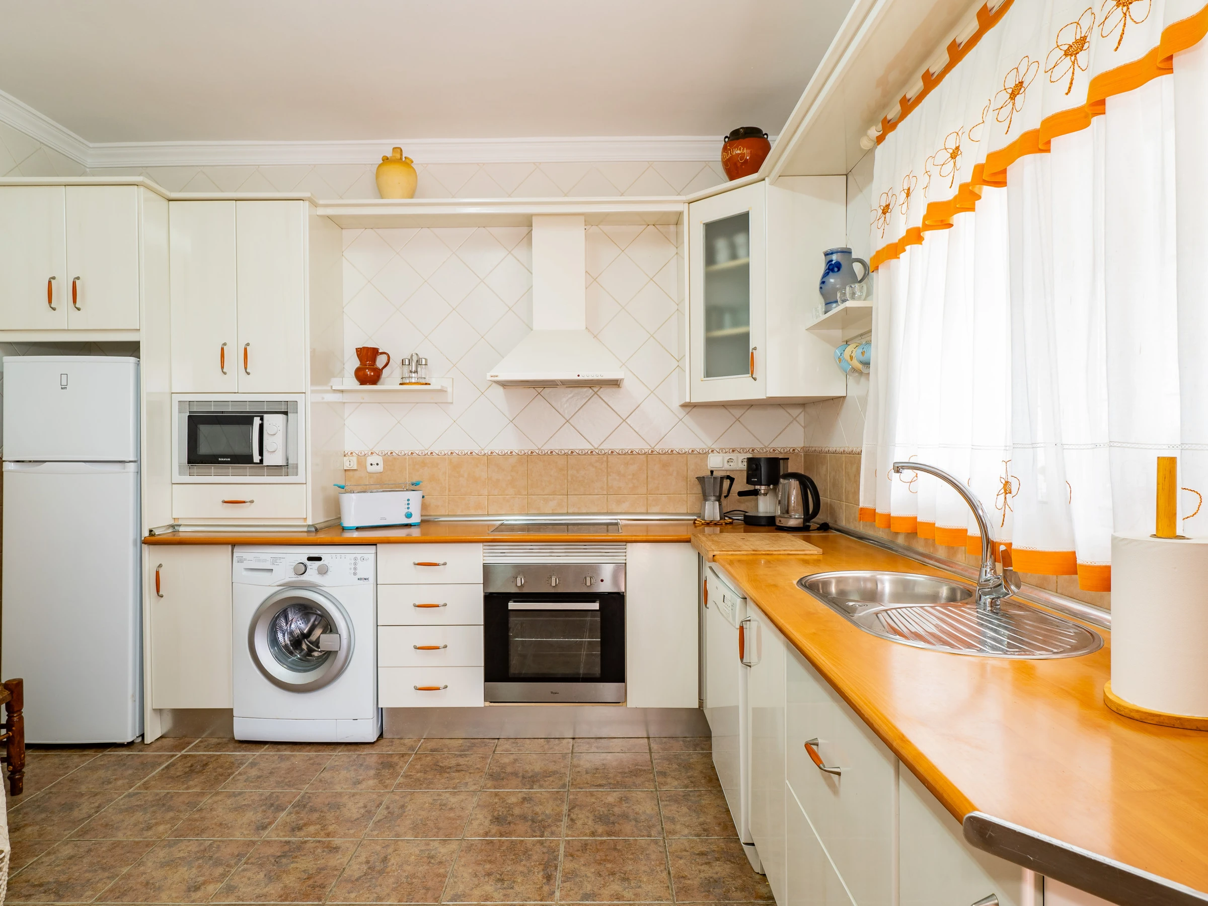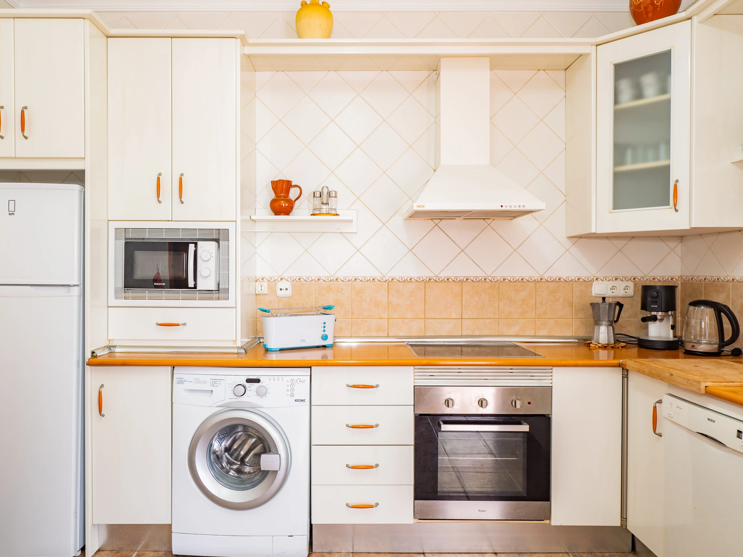 Die Einbauküche ist komplett ausgestattet, um das Kochen einfach und bequem zu machen: Glaskeramikkochfeld, Kühlschrank, Gefrierschrank, Mikrowelle, Backofen, Geschirrspüler, Kaffeemaschine, Toaster, Wasserkocher und Entsafter, zusätzlich zu Küchenutensilien und Geschirr. 🍳☕🍴