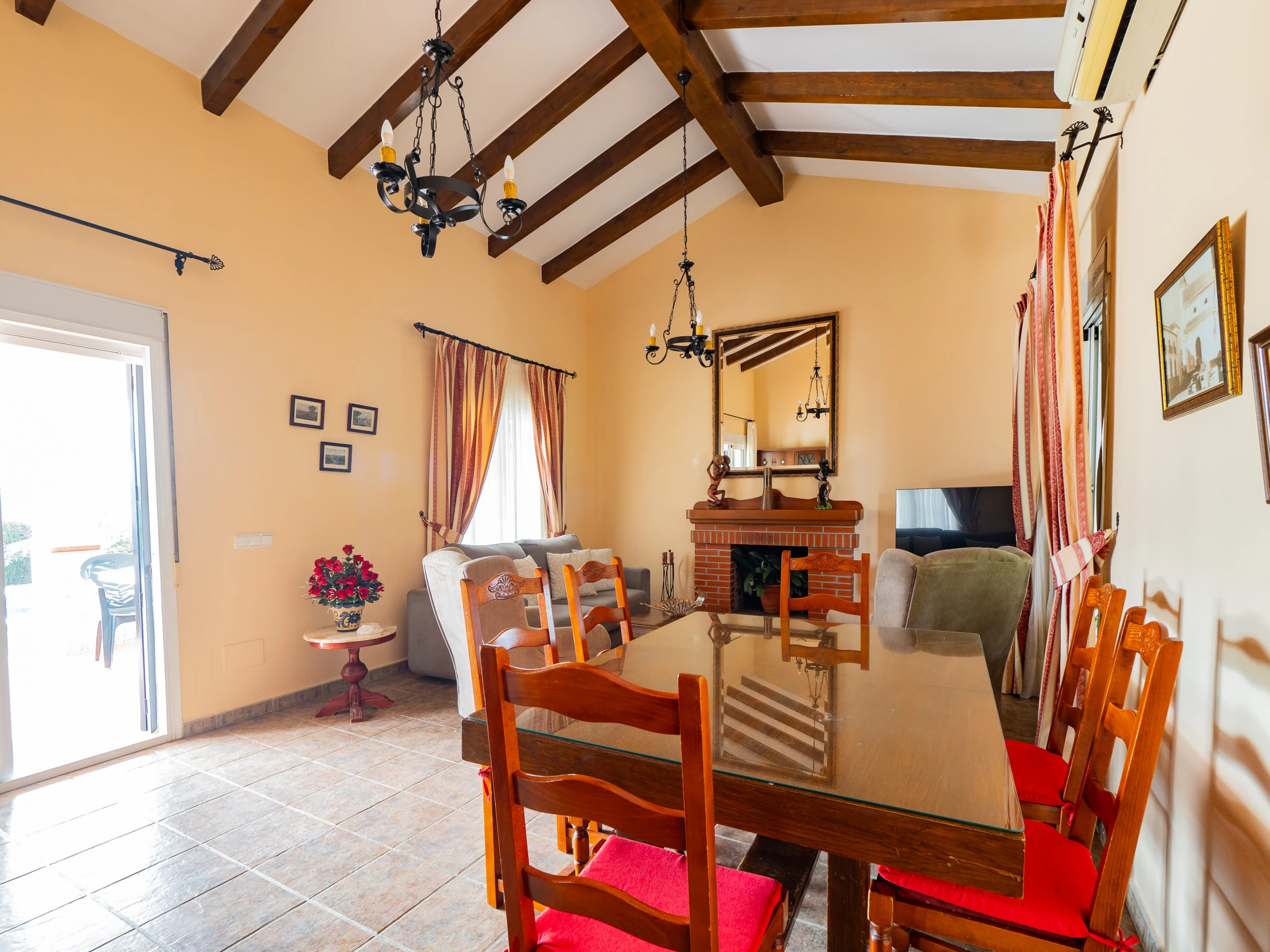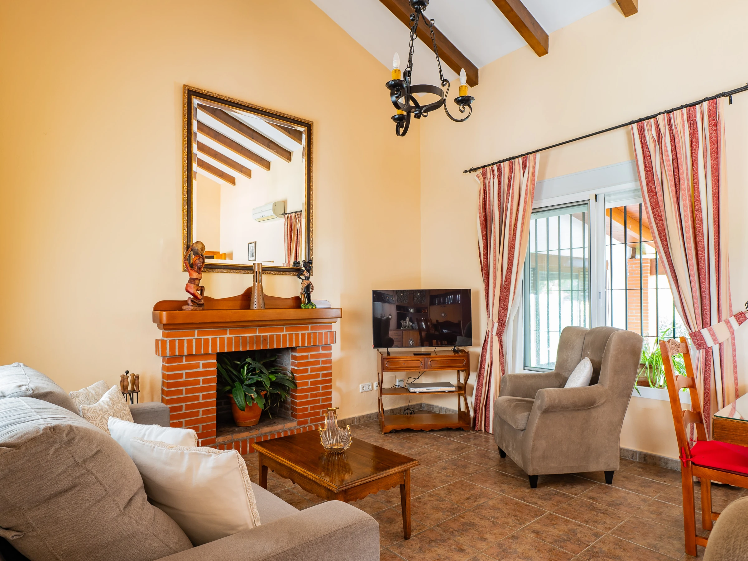 Der Wohn-Essbereich ist gemütlich und funktional, ausgestattet mit Sofa, Sesseln, Esstisch und Smart-TV für Momente der Familienentspannung. Obwohl der Kamin nicht zur Nutzung freigegeben ist, verfügt das Haus über eine Klimaanlage mit Wärmepumpe, um in jeder Jahreszeit eine angenehme Temperatur zu halten. ❄️🔥📺