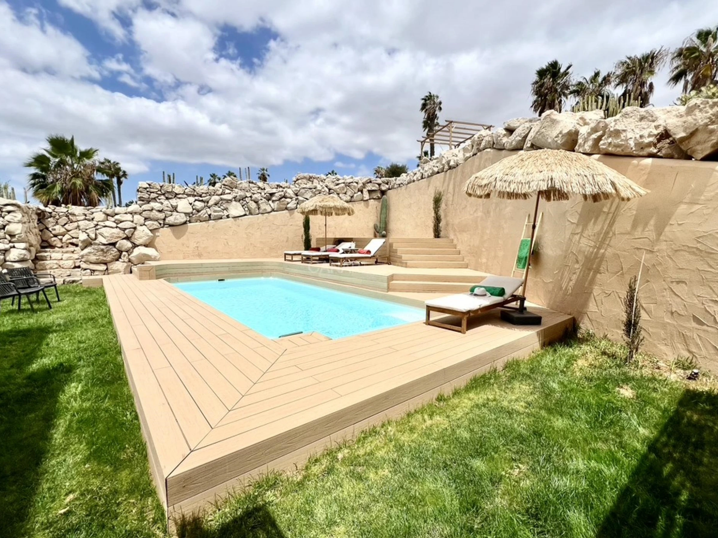 Neben dem Pool: Ideal zum Entspannen, mit Liegen und Sonnenschirmen.