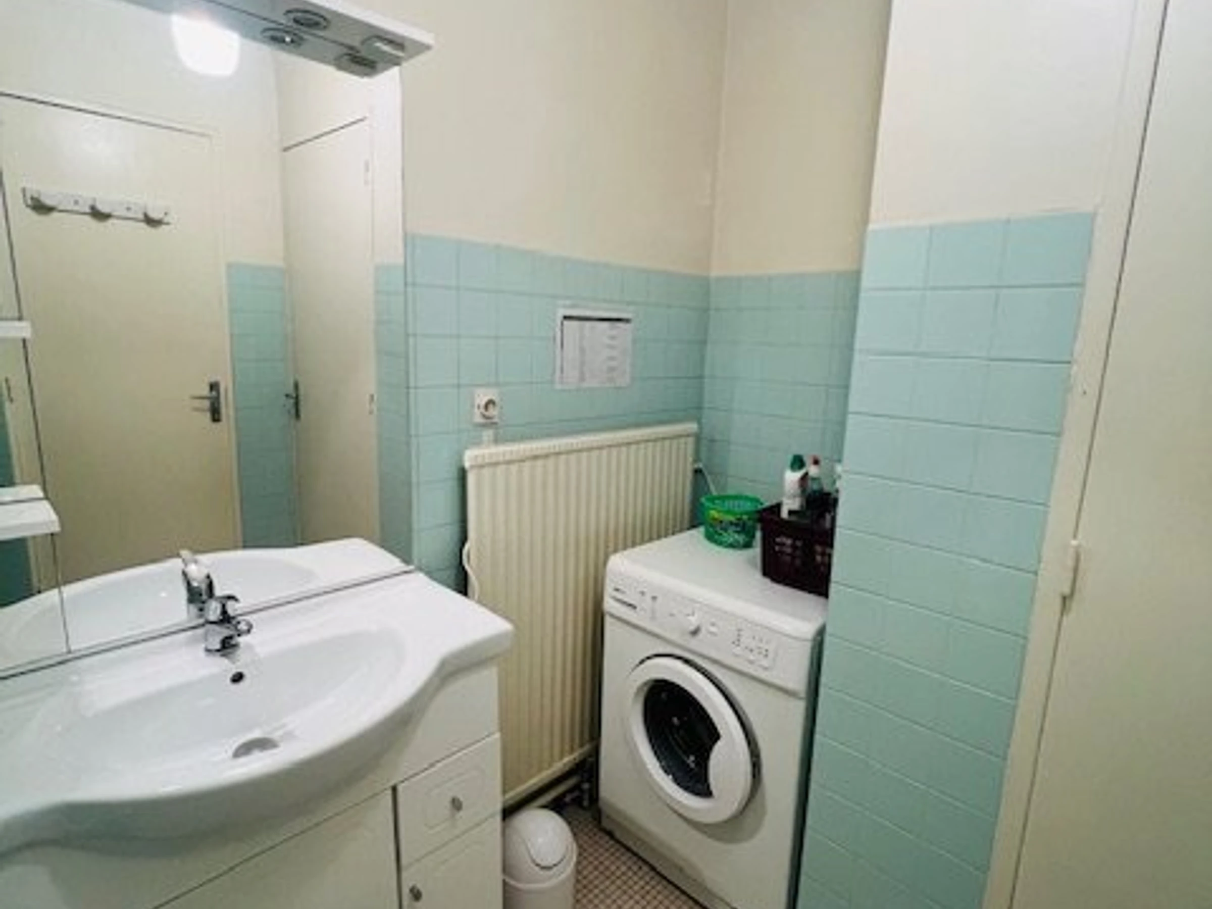 BADEZIMMER: Badewanne, Waschbecken, großer Abstellschrank, Waschmaschine.