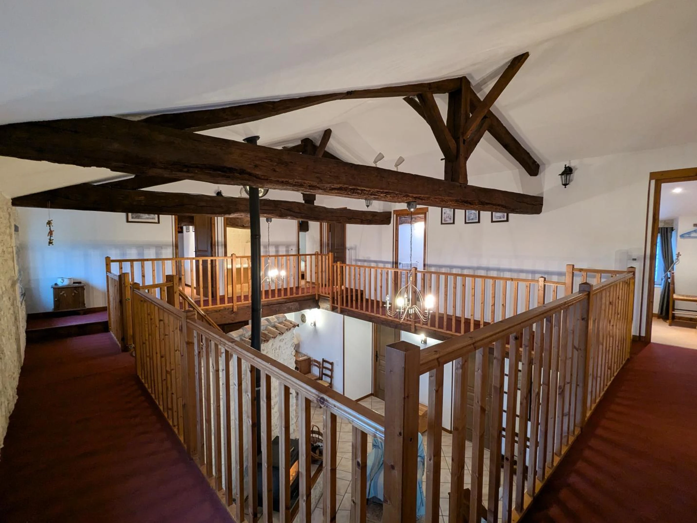 Erdgeschoss: großes Wohnzimmer von 104 m² mit 2 Sitzecken vor einem Holzofen, einem Tischfußball, einem Essbereich und einer Küche, einem Duschraum mit WC, Abstellraum.