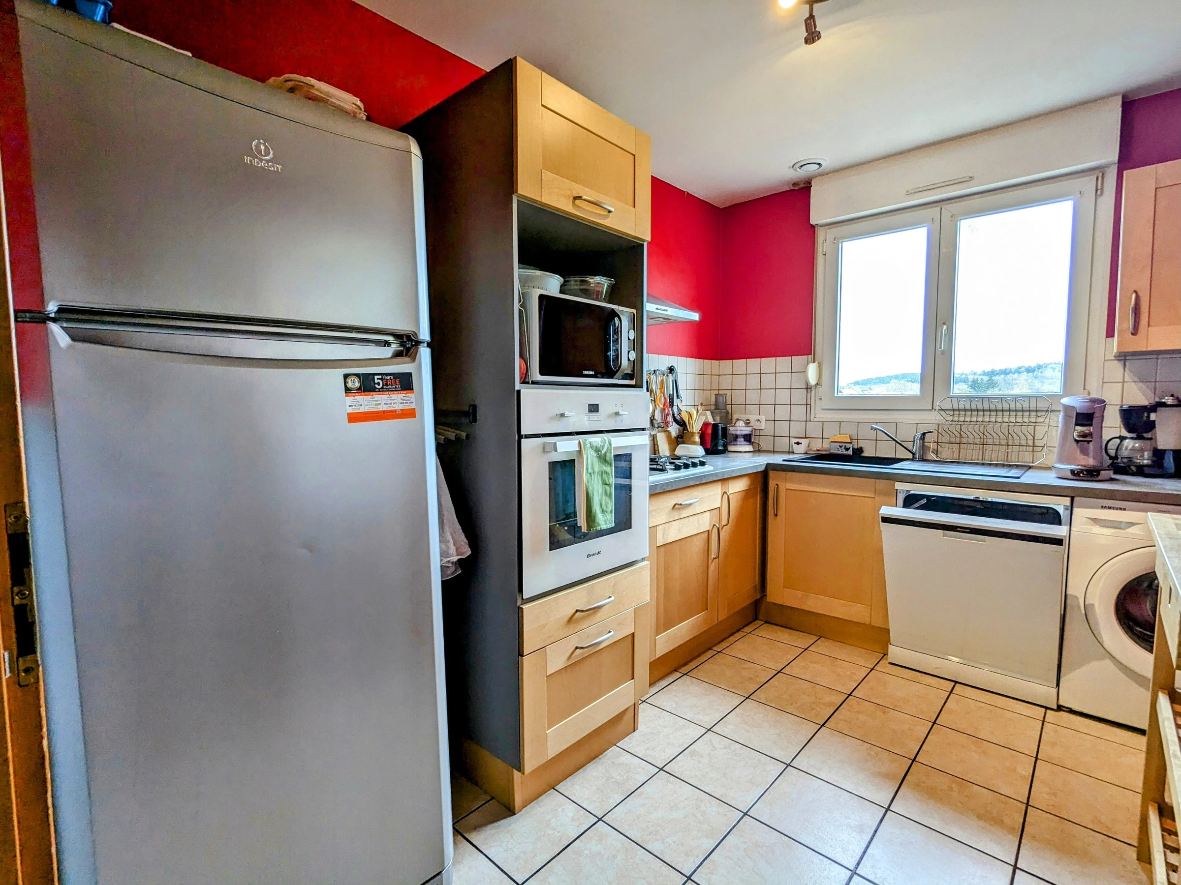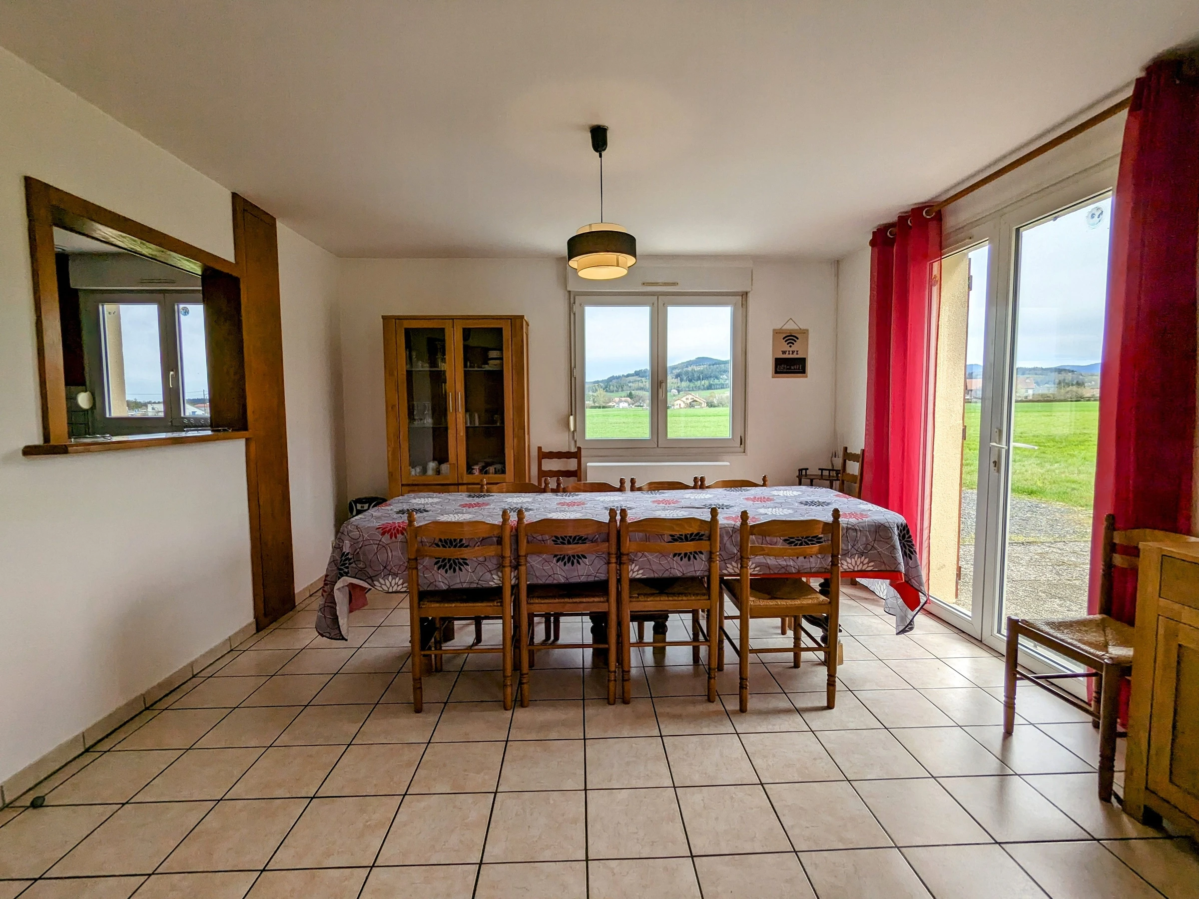 Erdgeschoss für Personen mit eingeschränkter Mobilität zugänglich: Eingang, zum Wohnzimmer halboffene Küche, Wohnzimmer mit Kamin.
