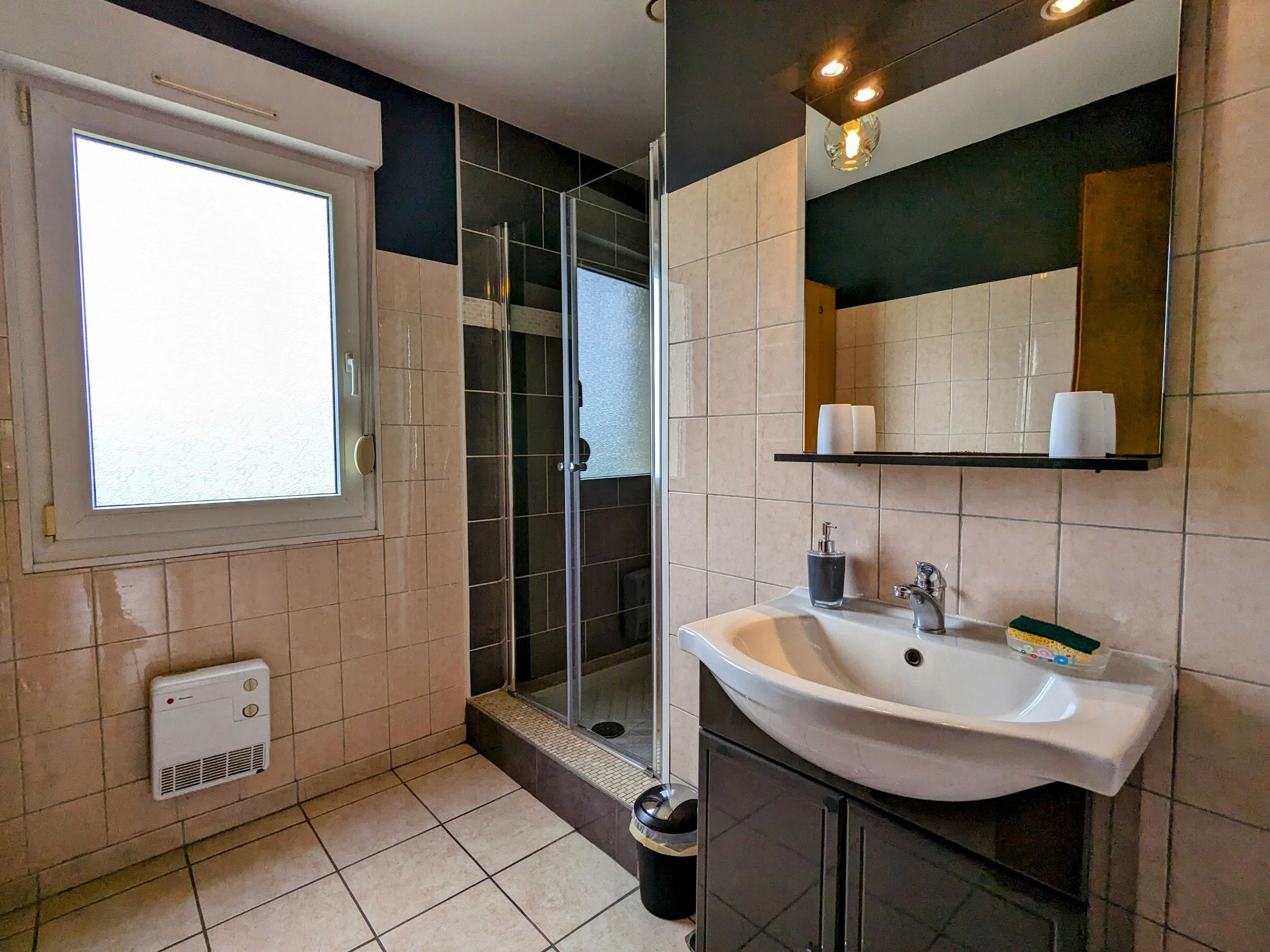 1 separates WC. 1 Schlafzimmer (1 Doppelbett) und ein Badezimmer mit Badewanne, Dusche und erhöhtem WC;