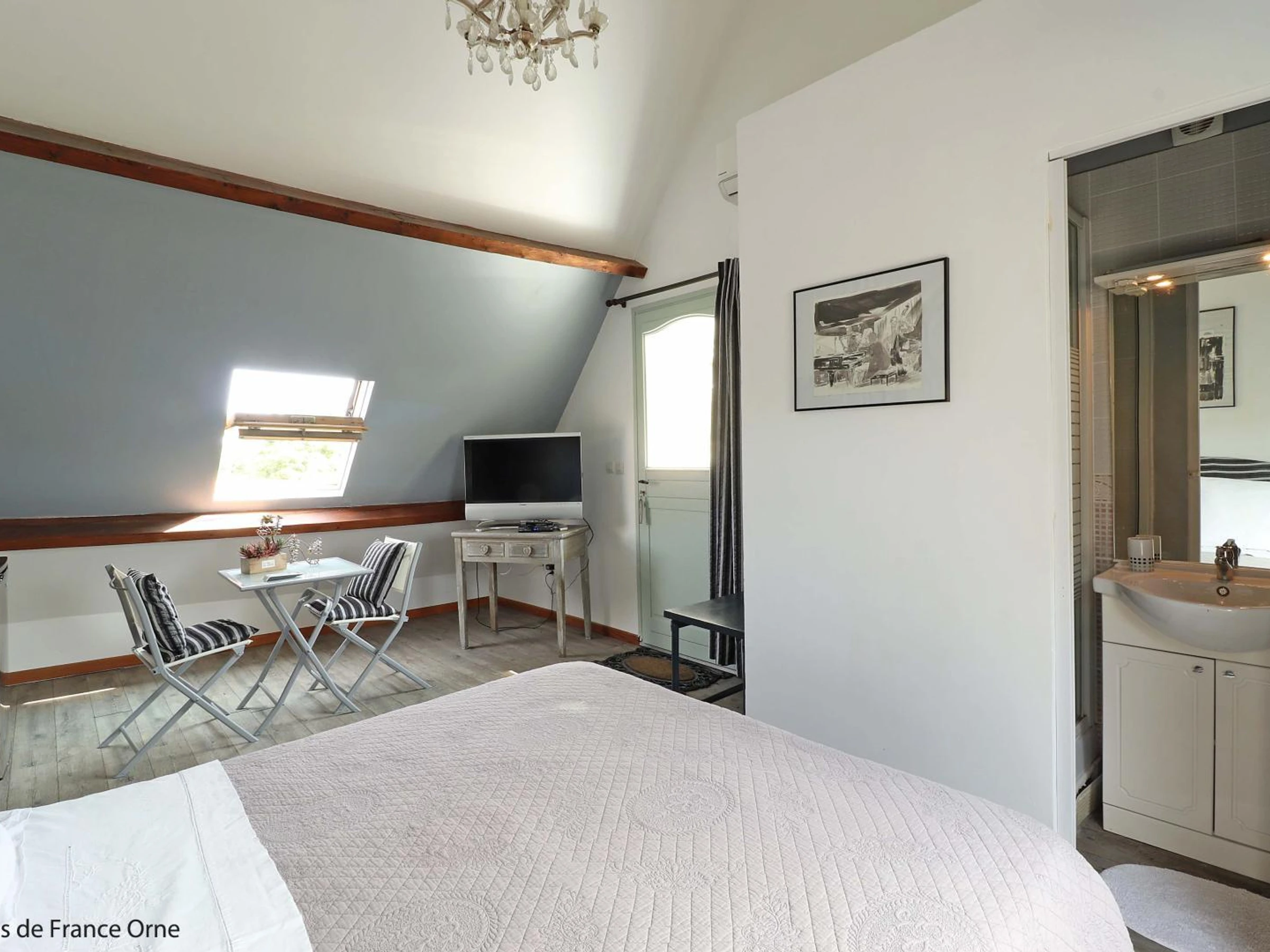 Erster Stock über Außentreppe: Schlafzimmer (Doppelbett 160 cm, TV) mit eigenem Duschbad und WC.
