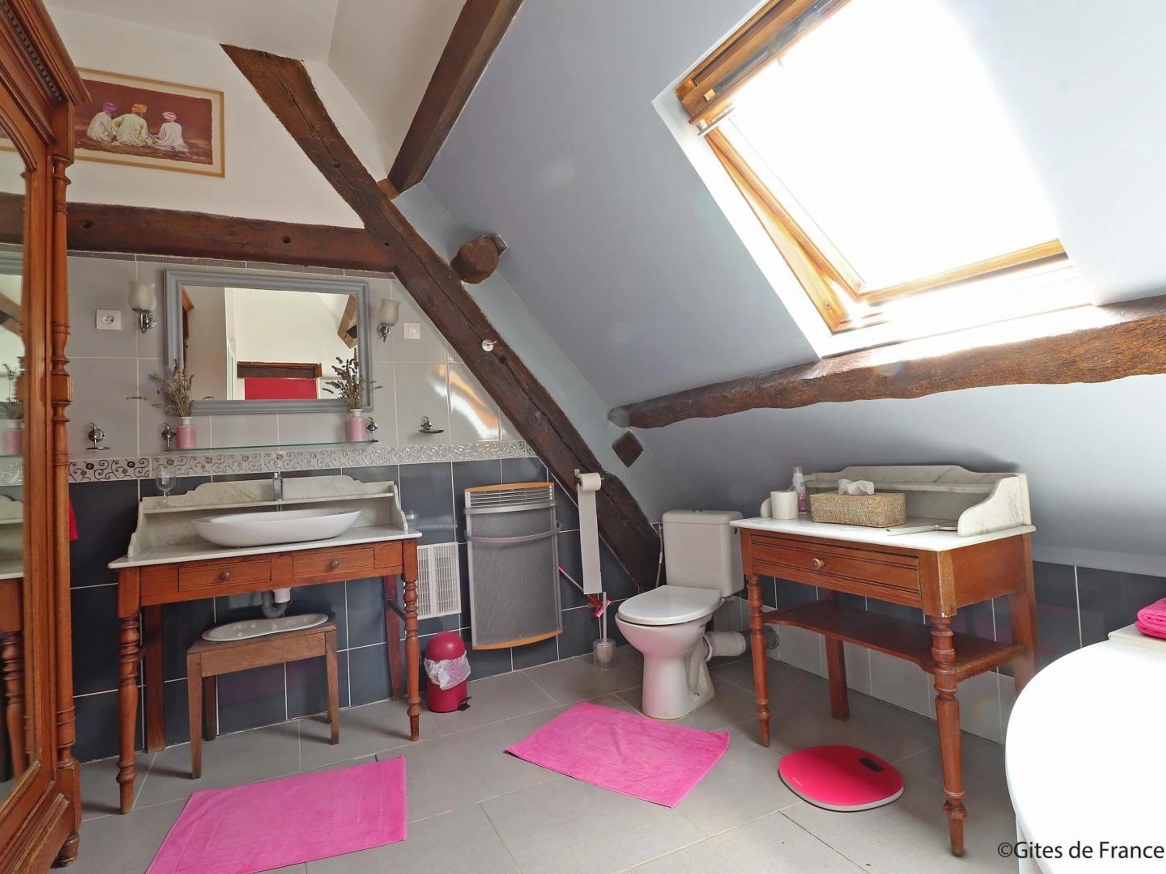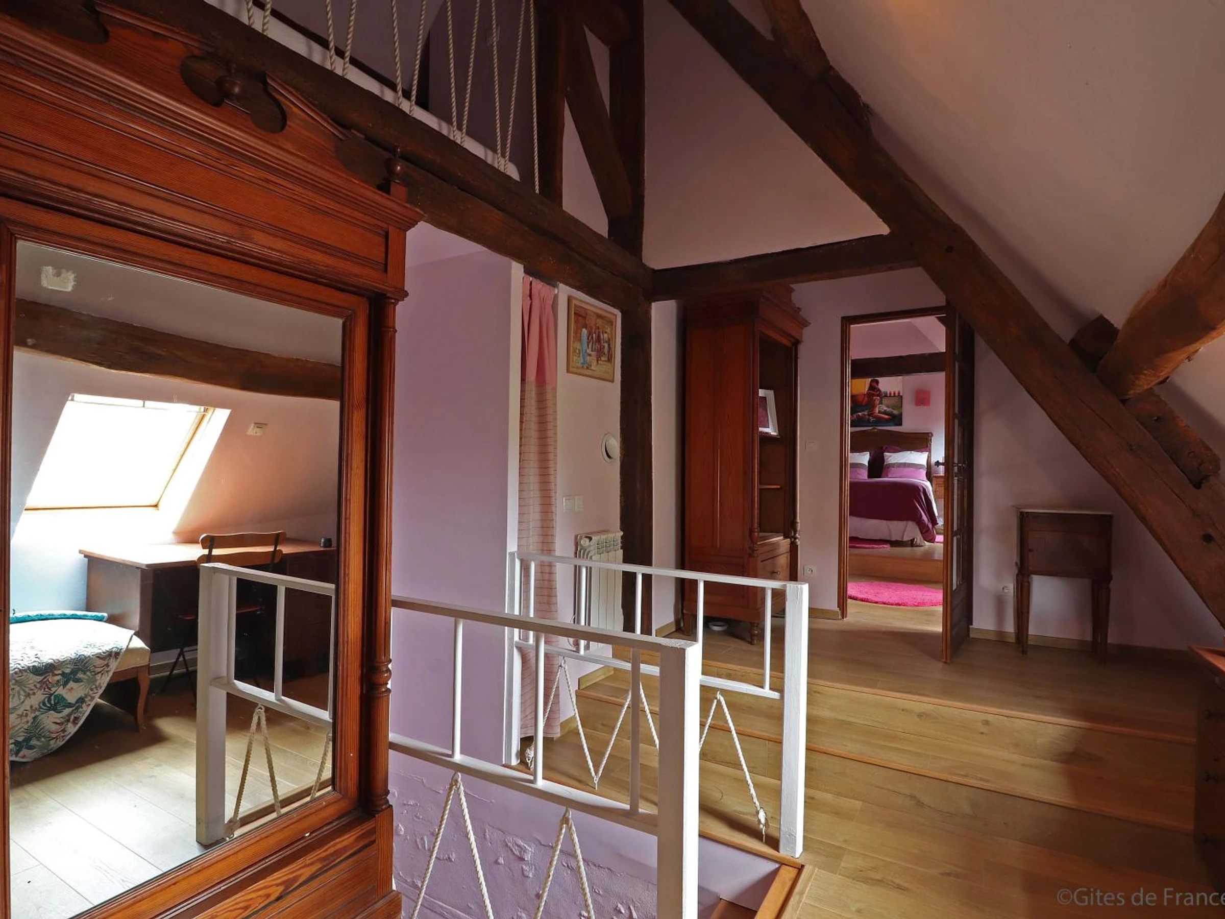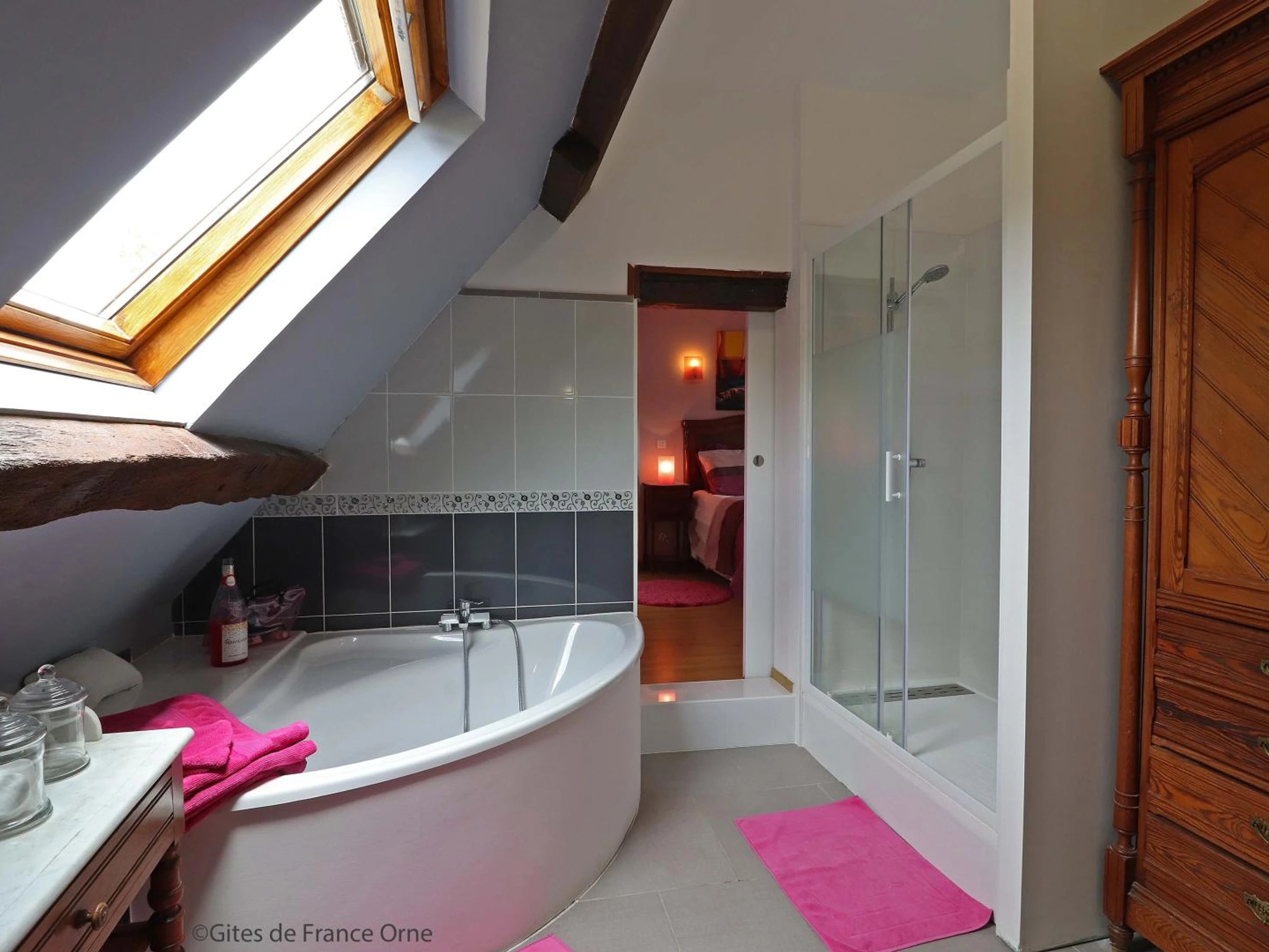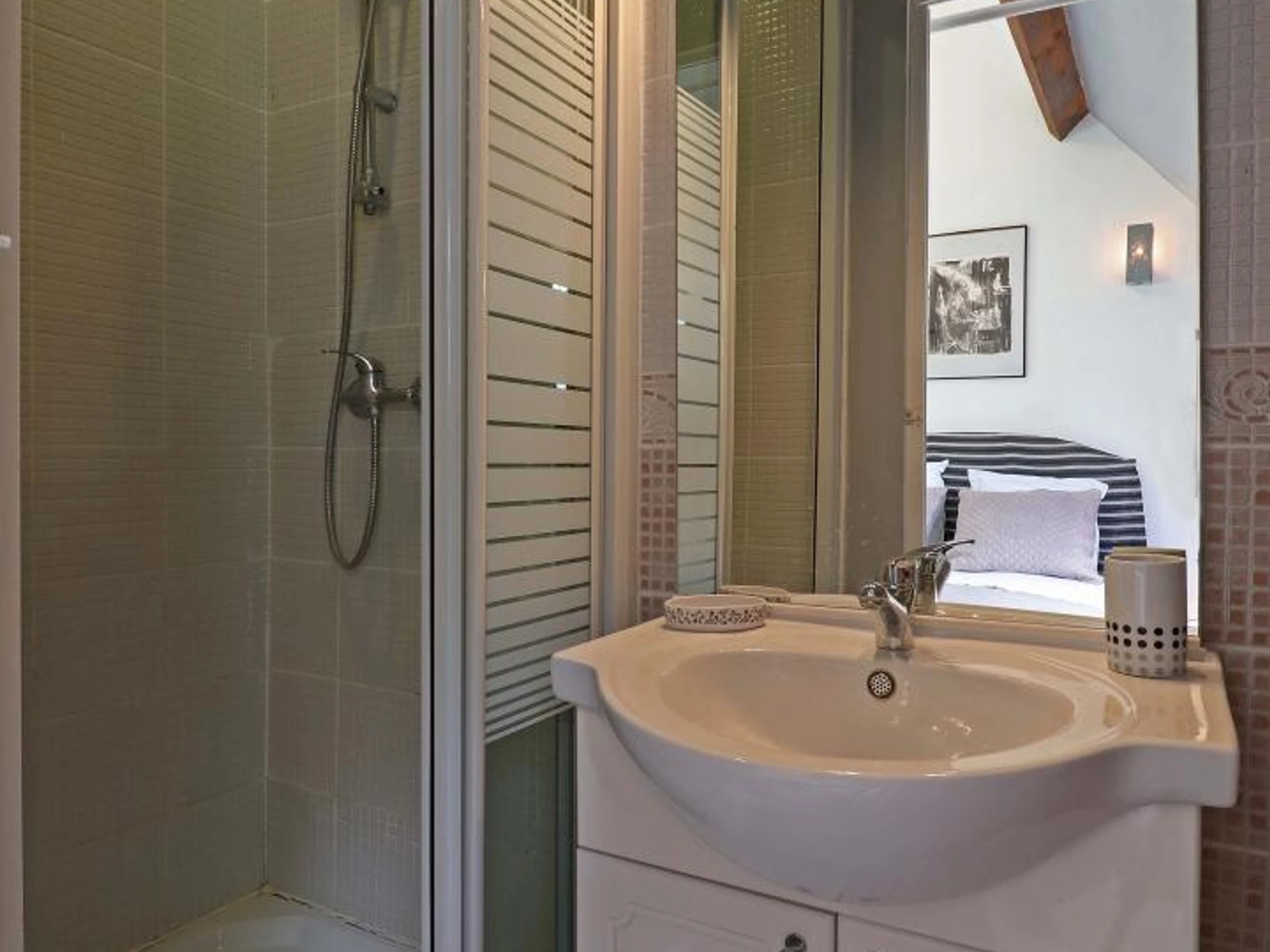 Erster Stock: Schlafzimmer (Doppelbett 160 cm, Einzelbett, TV) mit eigenem Spa-Bad und WC. Schlafzimmer (Doppelbett 160 cm, Einzelbett, TV) mit eigenem Bad (Dusche und Eckbadewanne) und WC.