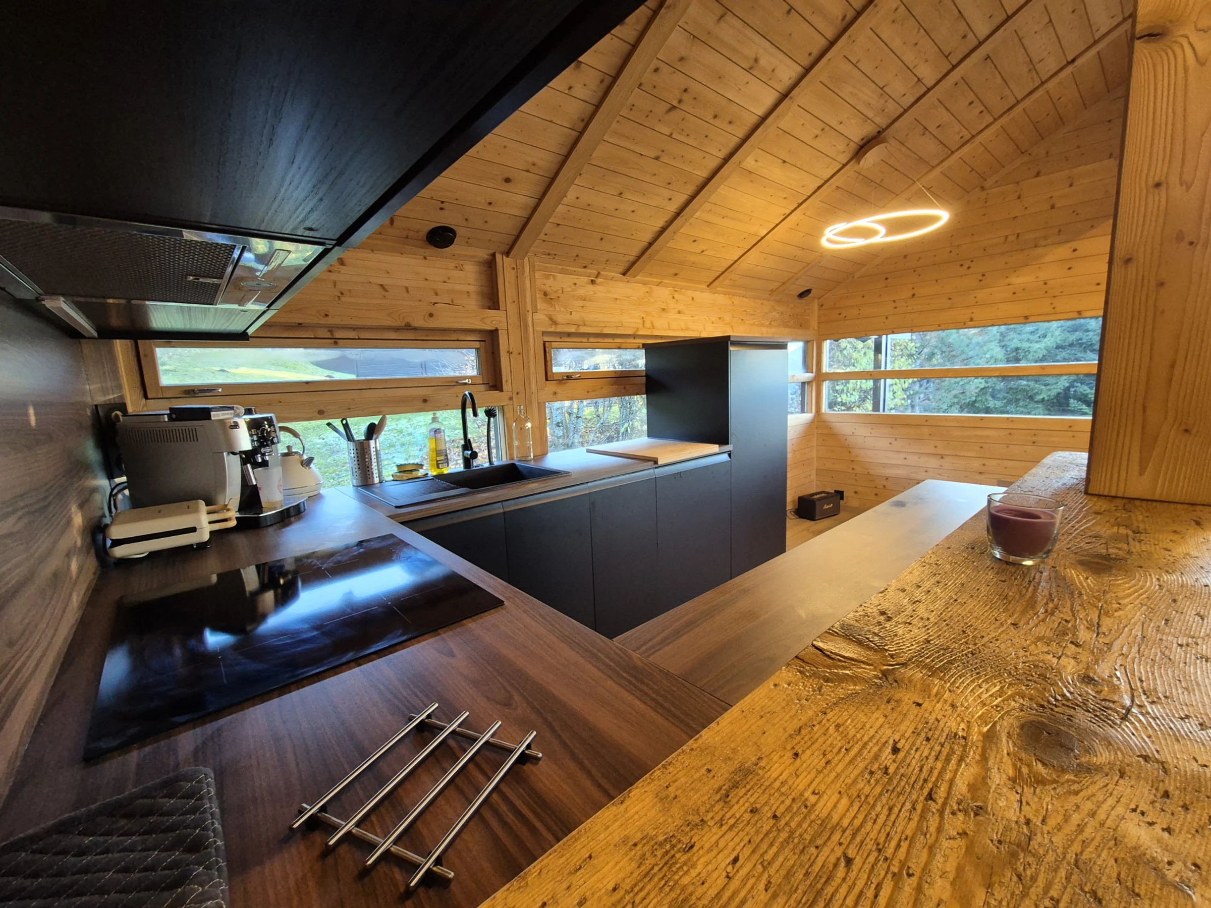 Offene Einbauküche/Wohnzimmer, Kaffeevollautomat, Geschirrspüler, großer Kühlschrank mit Gefrierfach, 4 Induktionskochfelder, Wasserkocher, Mikrowelle, Toaster