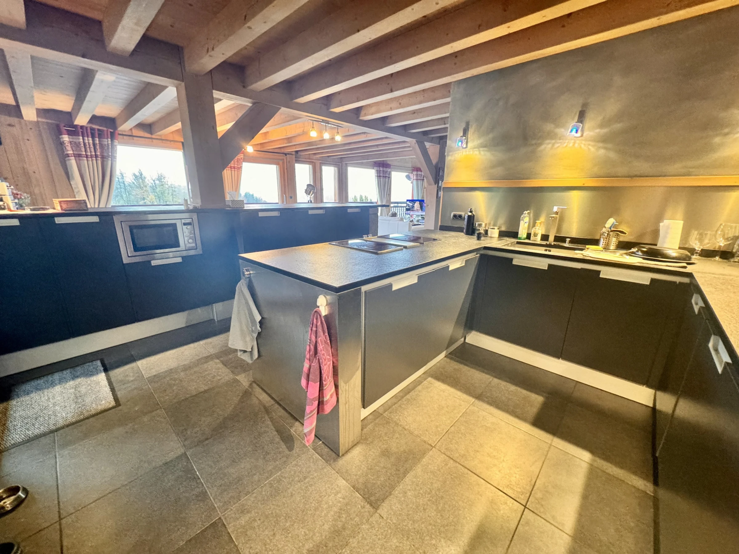 Offene Einbauküche/Wohnzimmer, Filterkaffeemaschine, Nespresso-Kaffeemaschine, Geschirrspüler, Fondue-Set, mittelgroßer Kühlschrank mit Gefrierfach, Gefrierschrank, Induktionskochfeld, Wasserkocher, Mikrowelle, Einbaubackofen, Raclettegrill, Toaster