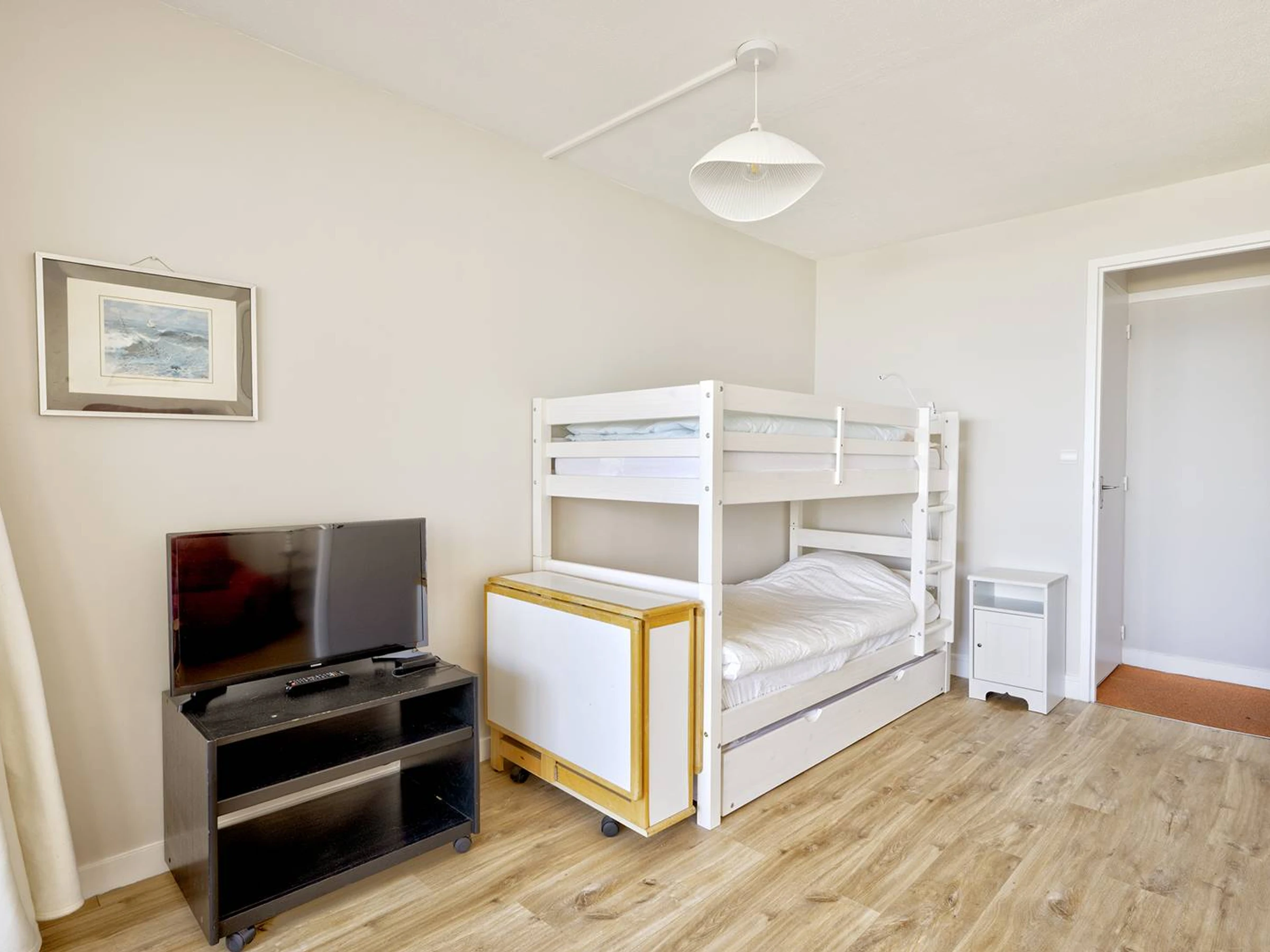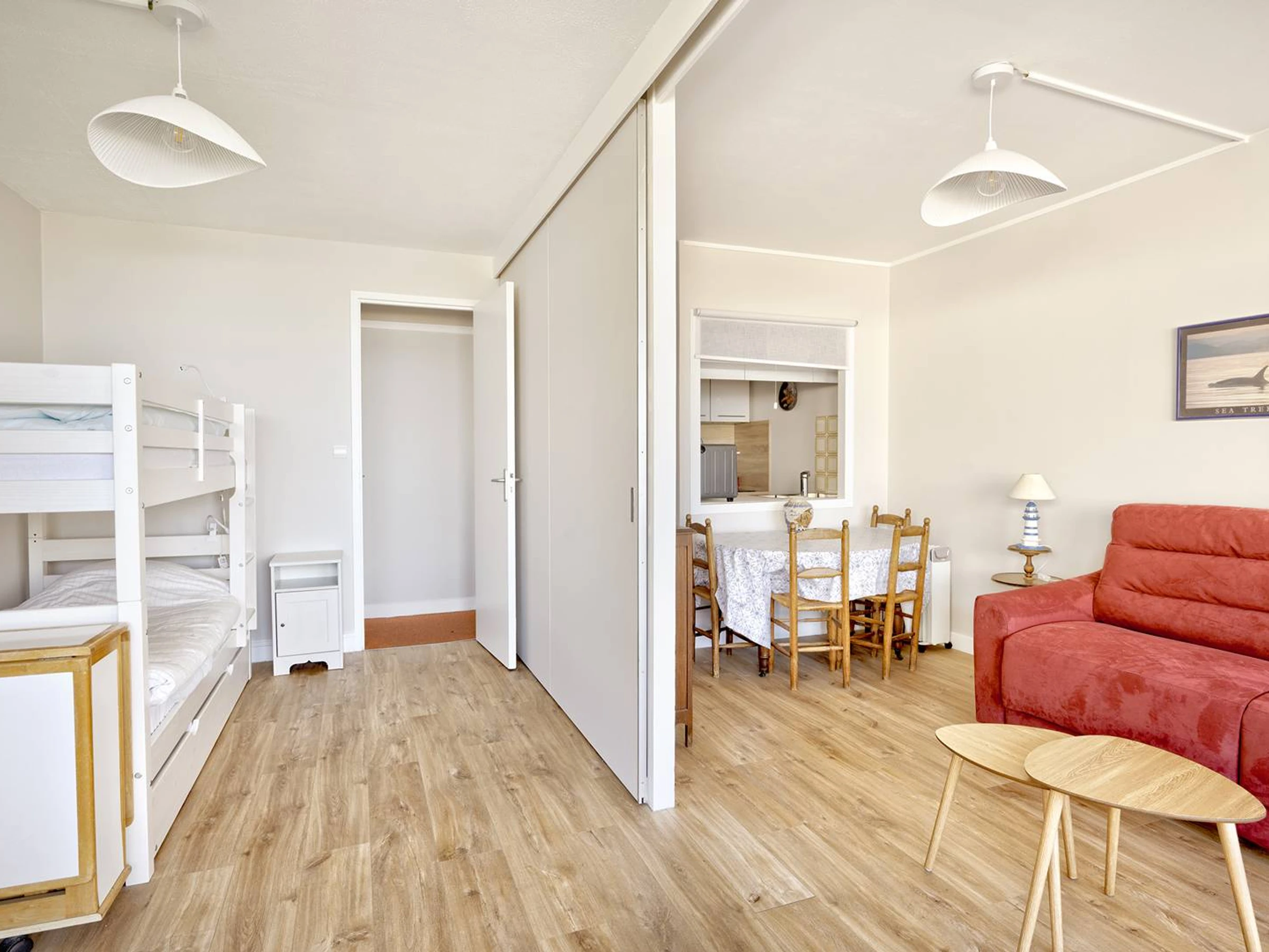 Der Grundriss umfasst einen Eingangsbereich mit Einbauschränken, ein separates WC, ein Badezimmer mit Waschmaschine und eine funktionale und voll ausgestattete Küche (Kühlschrank mit Gefrierfach, Induktionskochfeld, Mikrowelle, Minibackofen, Geschirrspüler, Nespresso-Maschine). Das geräumige und helle Wohnzimmer ist dank einer abnehmbaren Trennwand modular gestaltbar. Es ist unterteilt in ein Schlafzimmer mit zwei Etagenbetten (80 cm) und einem Ausziehbett (80 cm), ausgestattet mit einem Fernseher, und ein Wohn-/Esszimmer mit einem Schlafsofa (140 cm). Dieses Zimmer öffnet sich zu einem ca. 10 m² großen Nordbalkon, der zum Entspannen oder gemeinsamen Essen im Freien möbliert ist.