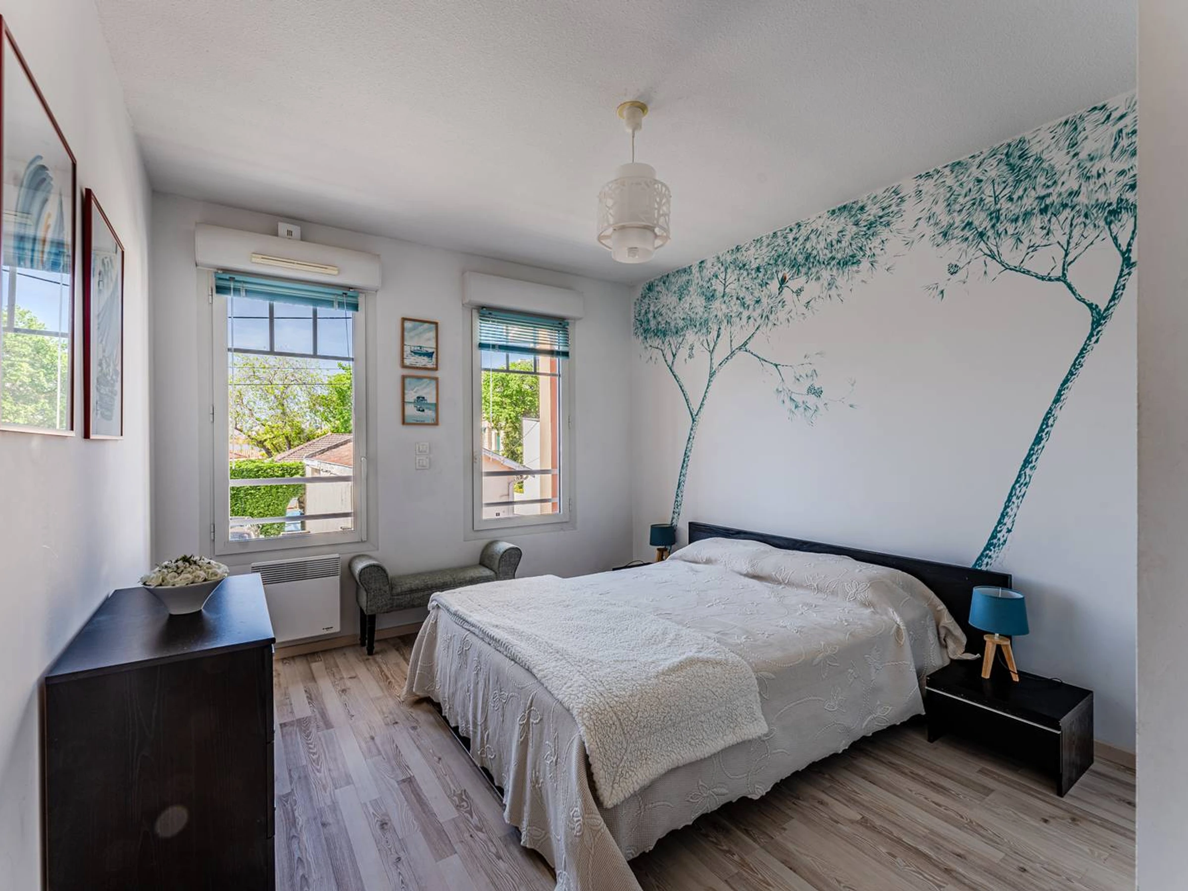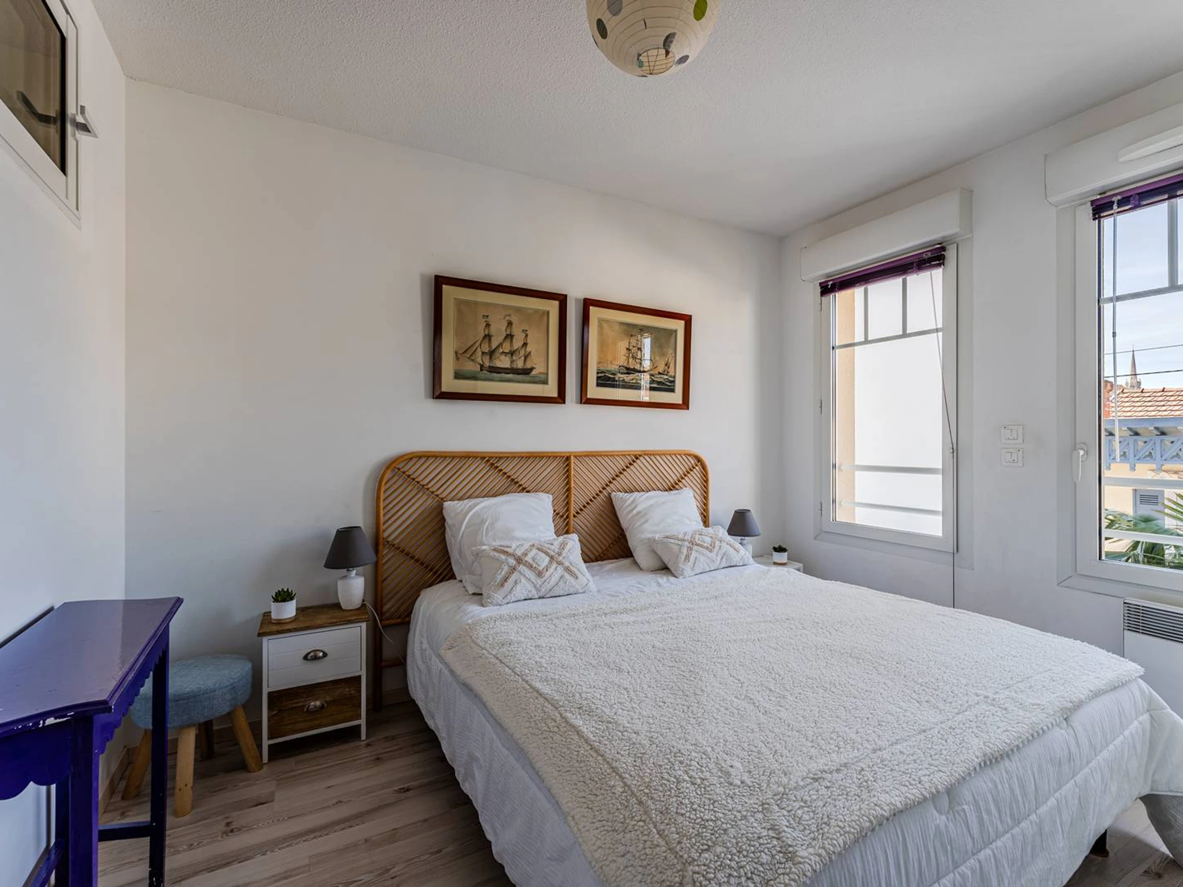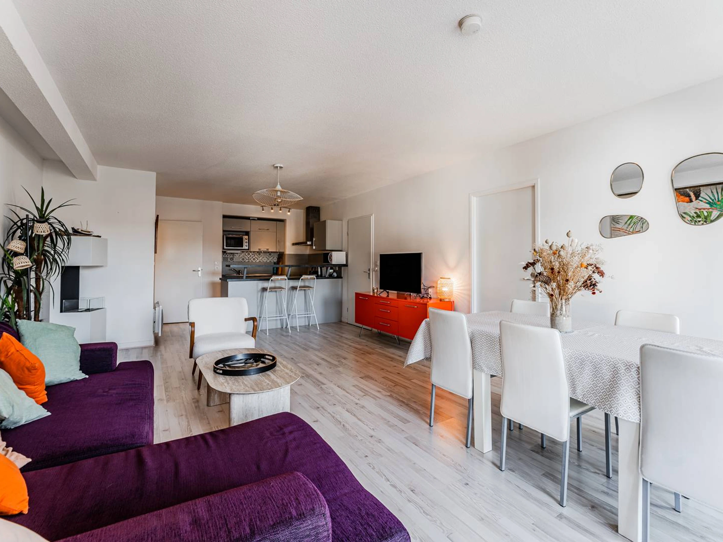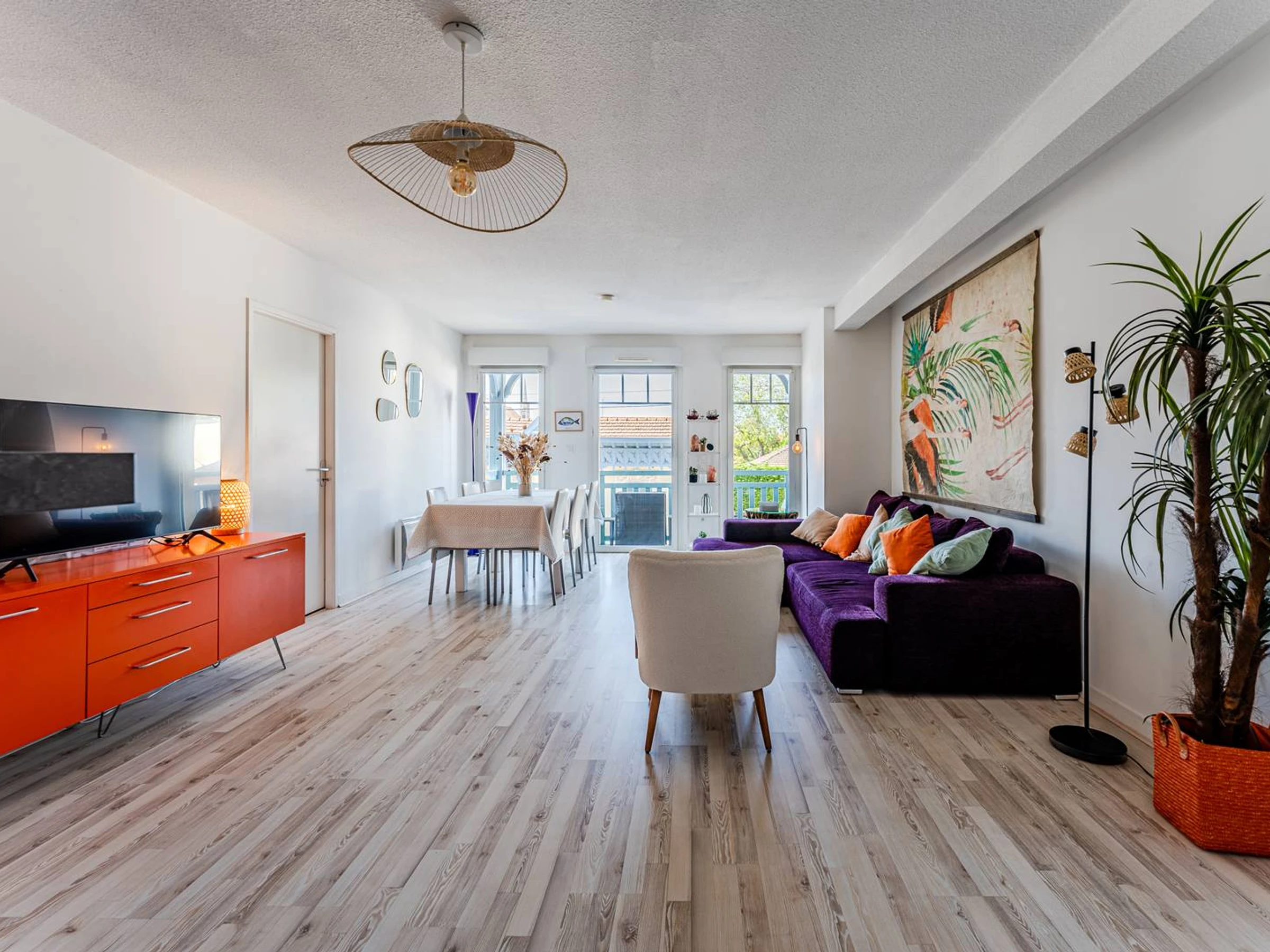 Beim Betreten der Wohnung bietet ein Einbauschrank praktischen Stauraum und führt zum ersten Badezimmer mit WC sowie in ein helles und geräumiges, nach Westen ausgerichtetes Schlafzimmer mit Doppelbett und Einbauschränken. Der einladende und gut gestaltete Wohnbereich verfügt über eine voll ausgestattete offene Küche mit Geschirrspüler, Kühlschrank, Gefrierschrank, Minibackofen, Mikrowelle, Dunstabzugshaube und Vier-Platten-Elektroherd. Eine Frühstücksbar mit Barhockern trennt diesen Bereich dezent vom Wohn- und Essbereich mit einem großen, bequemen Sofa, einem Fernseher und einem Esstisch. Ein Flur führt zu einem zweiten Badezimmer mit WC und Waschmaschine sowie zu einem Raum, der als Schlafzimmer oder Gäste-WC genutzt werden kann. Dieses Zimmer verfügt über ein hohes Fenster mit Blick auf Schlafzimmer 3, das Privatsphäre bietet und mit einem Doppelbett (140 cm), das sich zu einem Sofa ausklappen lässt, einem Fernseher und einem Kleiderschrank ausgestattet ist. Das dritte Schlafzimmer, ebenfalls nach Westen ausgerichtet, verfügt über zwei zusammengeschobene Einzelbetten (80 cm) und Stauraum. Draußen bietet ein ca. 5 m² großer, nach Westen ausgerichteter Balkon mit Blick auf die Straße einen angenehmen Platz, um einen Kaffee zu genießen oder den Tag entspannt ausklingen zu lassen. Die Wohnung ist sehr gut ausgestattet, inklusive WLAN-Internetzugang, pflegeleicht und modern eingerichtet. Sie profitiert von einer besonders attraktiven Lage: Der Wochenmarkt ist nur 8 Gehminuten und der Strand nur 5 Gehminuten entfernt. Haustiere sind nicht erlaubt. Bettwäsche wird nicht gestellt, kann aber bei unserem Partner „Le Linge du Bassin“ (Code: vacances33) gemietet werden. Eine Reiserücktrittsversicherung ist inklusive (optionale Mitgliedschaft). Die Endreinigung ist im Preis enthalten, sofern die Wohnung während Ihres Aufenthalts ordnungsgemäß und regelmäßig gepflegt wird.