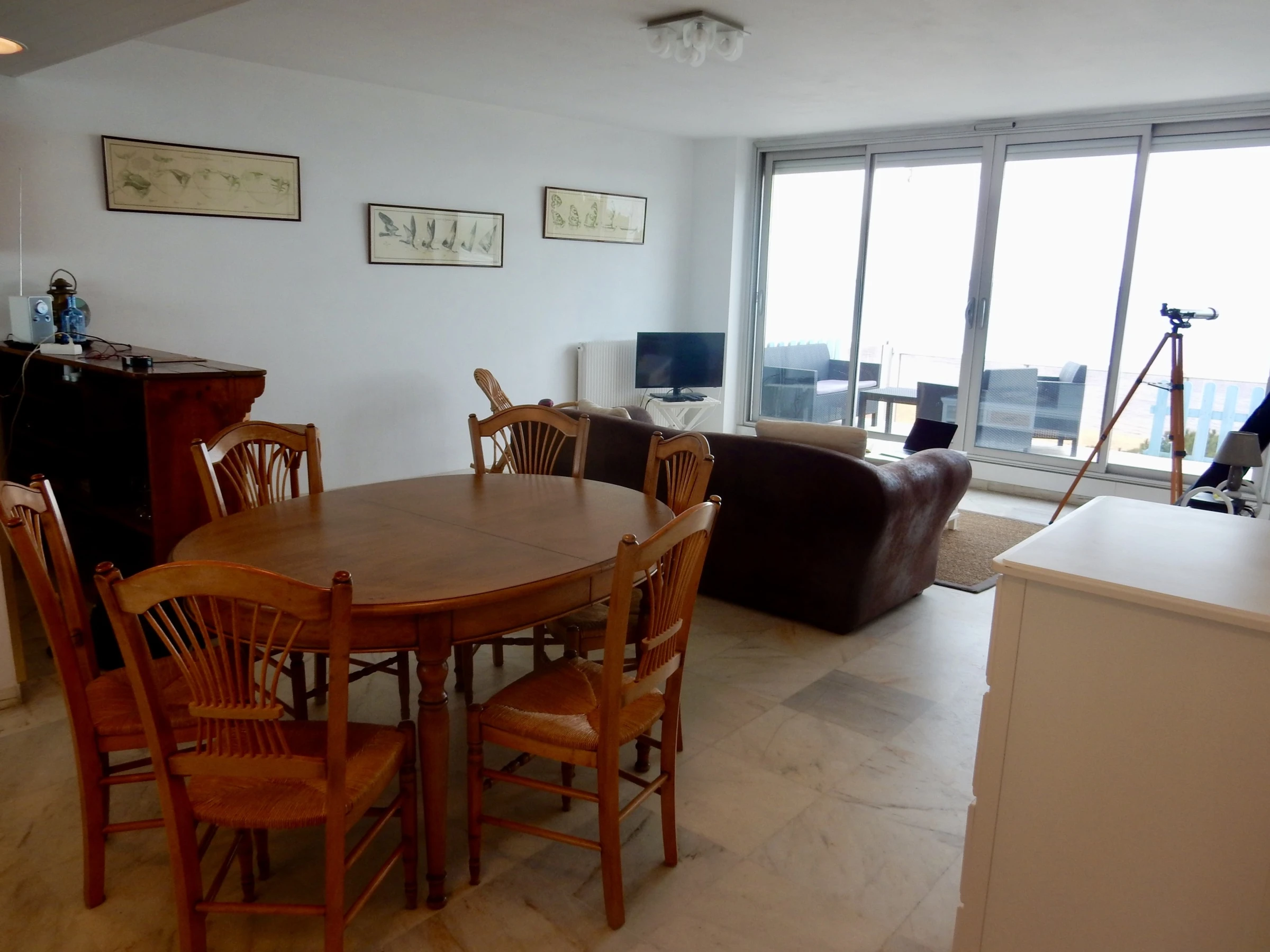 - Wohnzimmer mit Schlafcouch (140x190), TV, Bluetooth-Lautsprecher-Radio und Esszimmer mit Zugang zur Terrasse mit SEHR SCHÖNEM BLICK auf den Pool und Möbel.