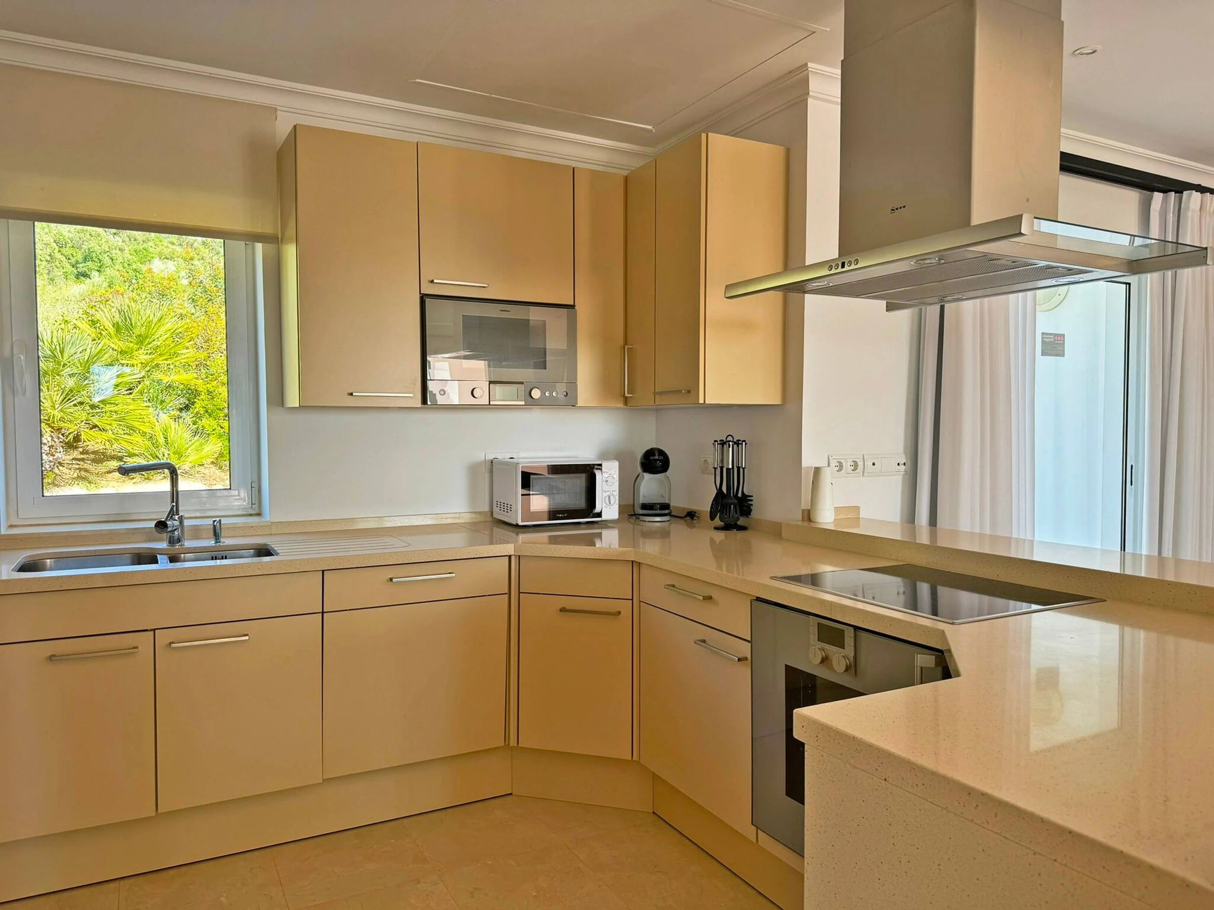 Dieses offene küche, mit ceranfeld, ist ausgestattet in kühlschrank, mikrowelle, backofen, gefrierschrank, spülmaschine, geschirr/besteck, kochutensilien, kaffeemaschine, toaster, wasserkocher und herdplatte.