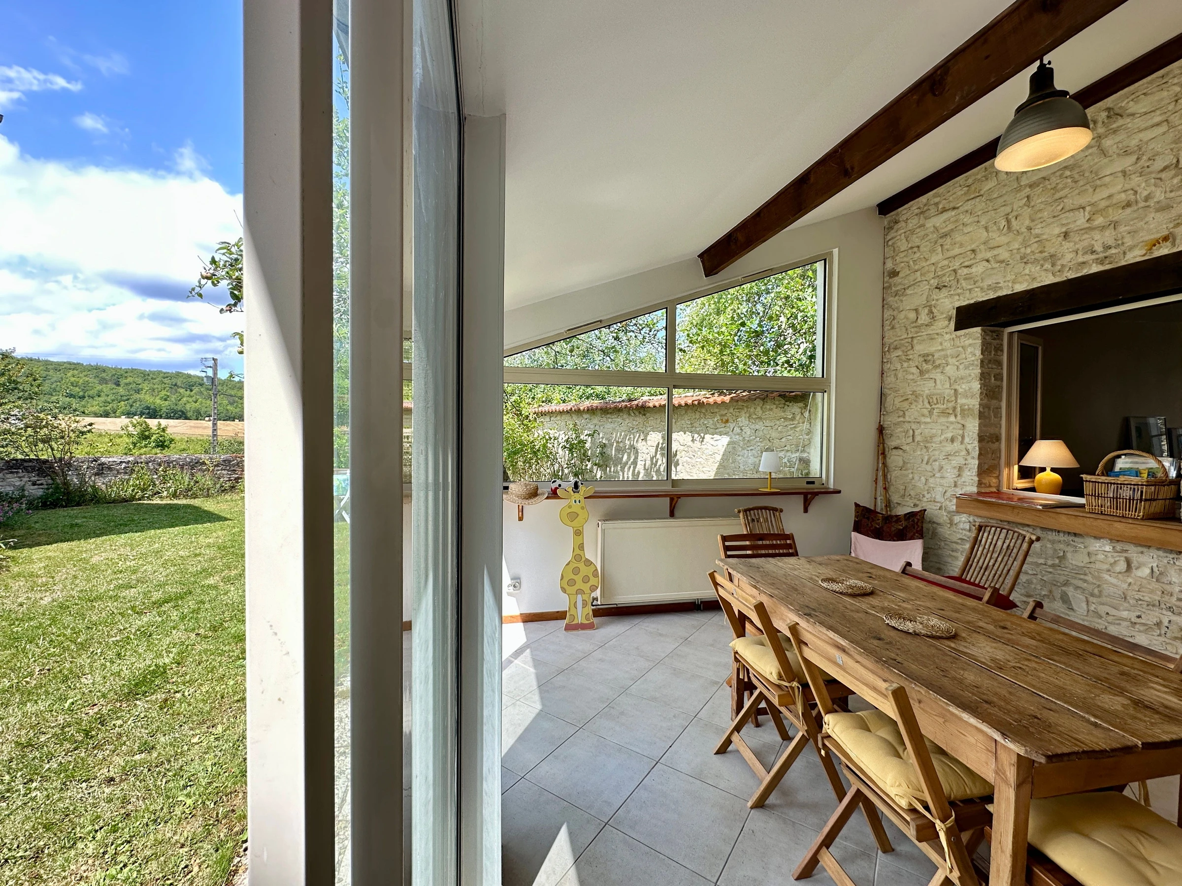 Im Erdgeschoss befindet sich ein einladendes Wohnzimmer mit offener Küche und Essbereich, der in ein Esszimmer im Veranda-Stil übergeht. Ein heller und freundlicher Raum.