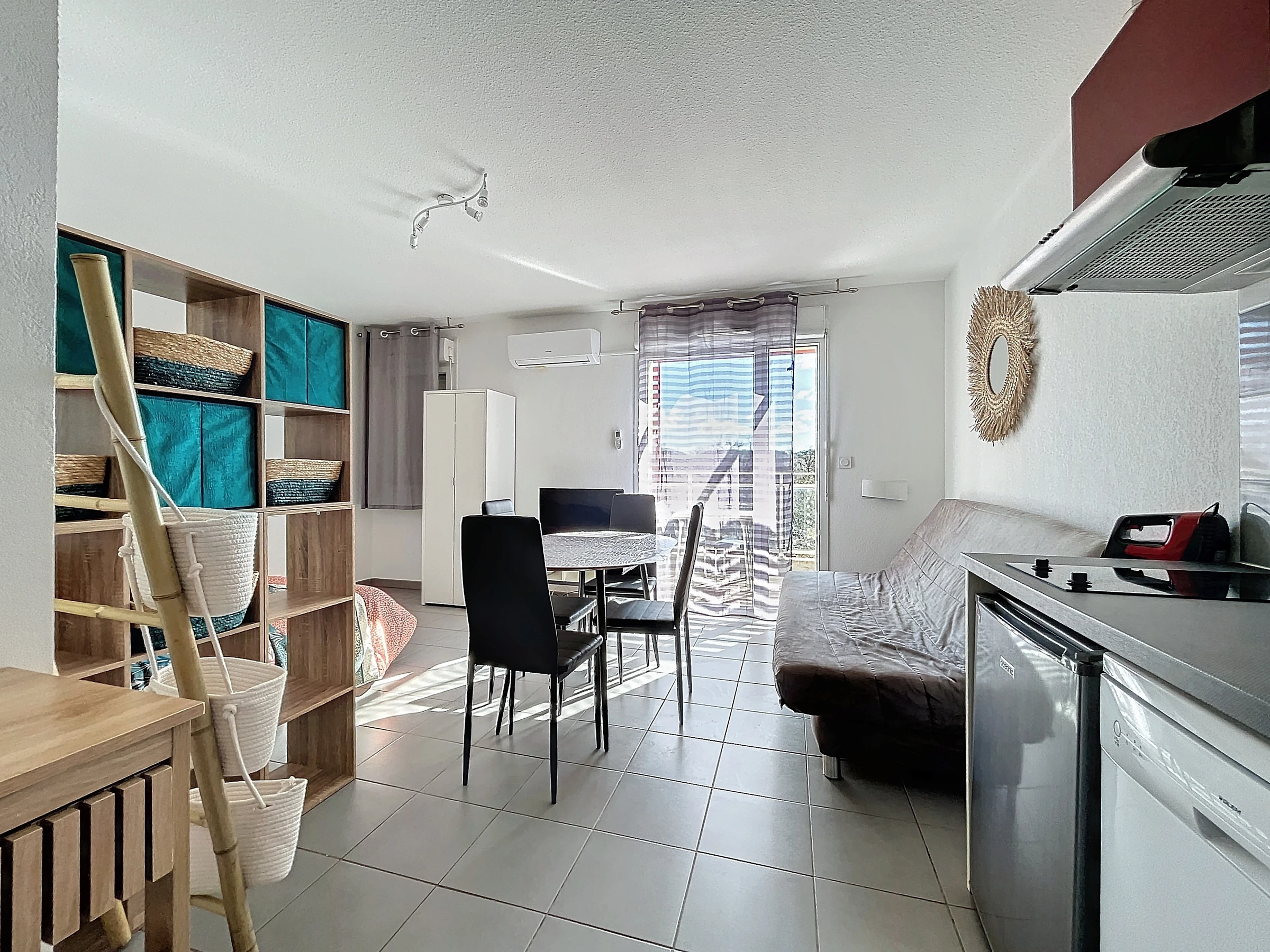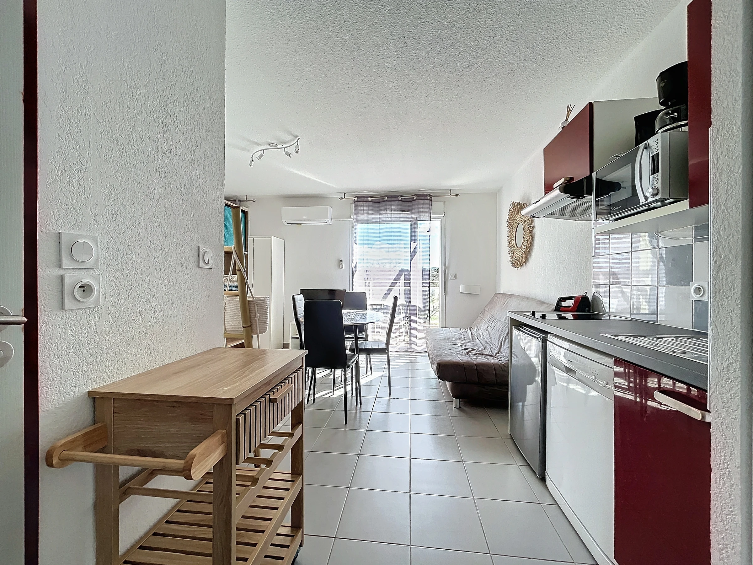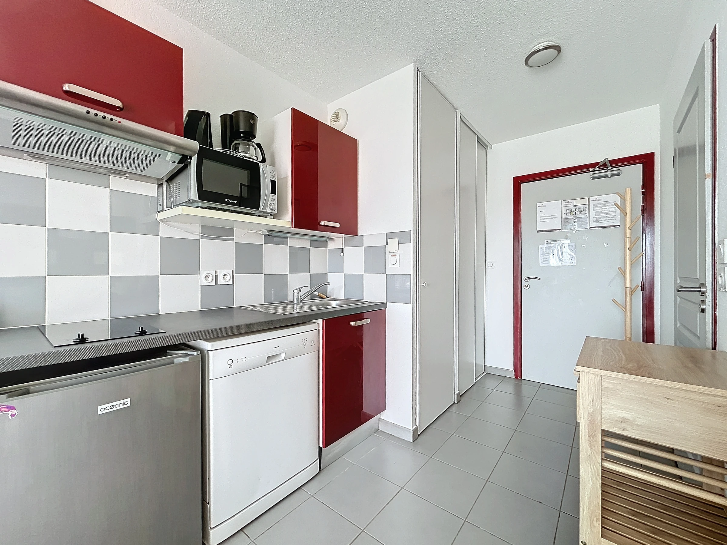 Bestehend aus einem Wohnzimmer mit Kochnische mit Geschirrspüler, einem Schlafbereich, einem Badezimmer mit WC und einer Terrasse bietet dieses Apartment allen Komfort für einen angenehmen Urlaub.