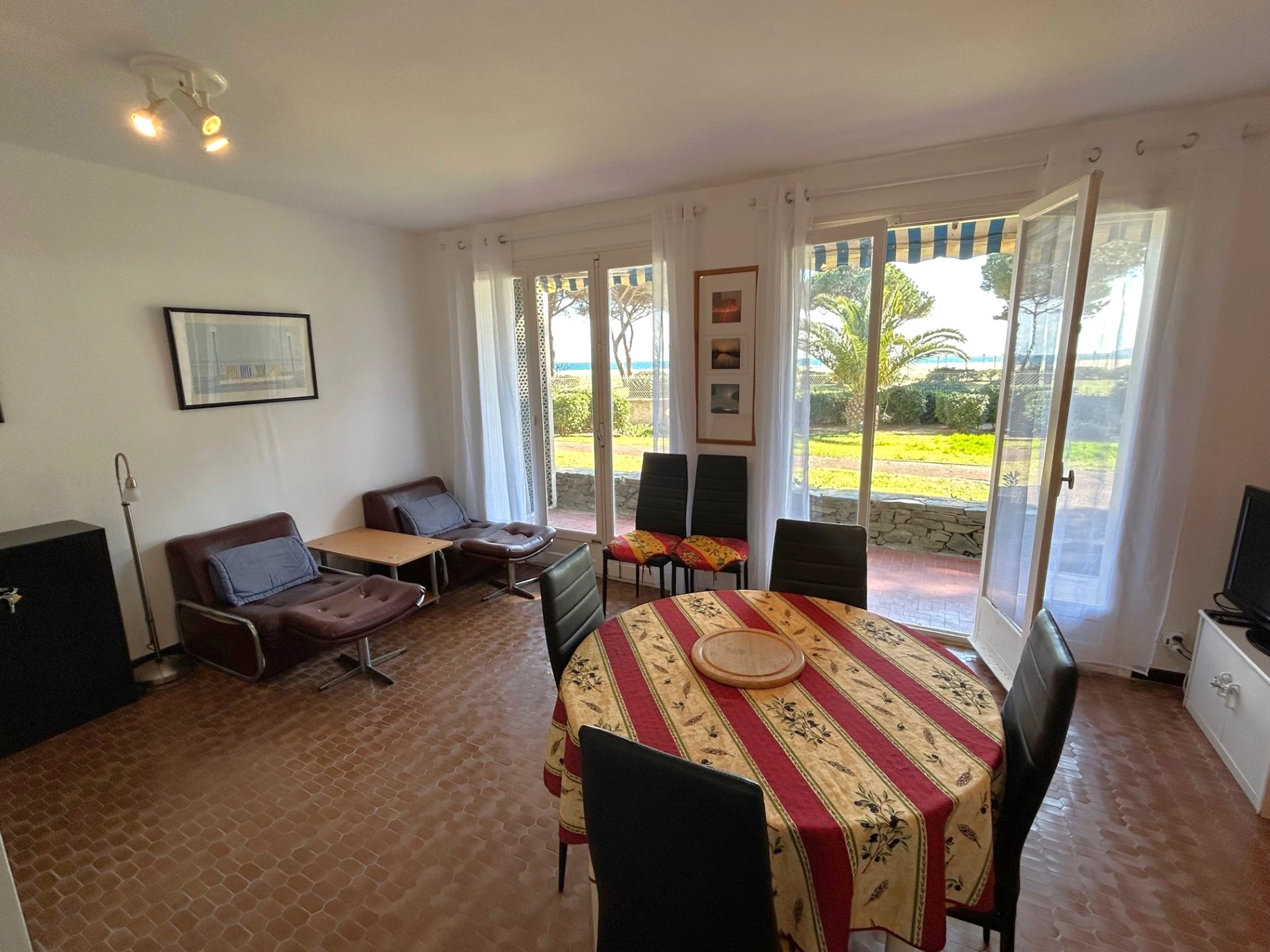Die Ferienwohnung befindet sich im Erdgeschoss eines Hauses, nur 50 Meter vom Strand entfernt und bietet direkten Zugang. Sie bietet Platz für 5 Personen: ein Doppelschlafsofa im Wohnzimmer sowie ein Doppelbett und zwei Etagenbetten im Schlafzimmer. Zur Ausstattung gehören ein Kühlschrank mit Gefrierfach, ein Gasherd mit vier Kochstellen, ein Backofen, eine Mikrowelle, eine Waschmaschine und ein Fernseher. Außerdem verfügt die Wohnung über eine 9 m² große Terrasse im Erdgeschoss mit Meerblick.