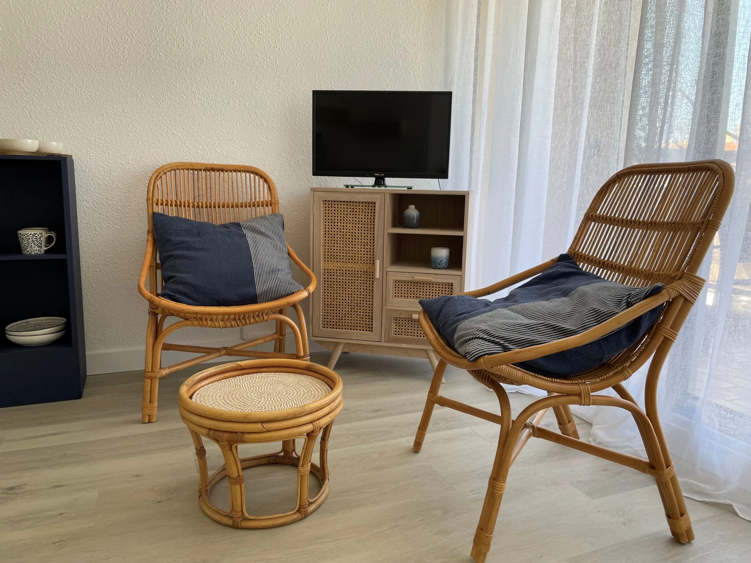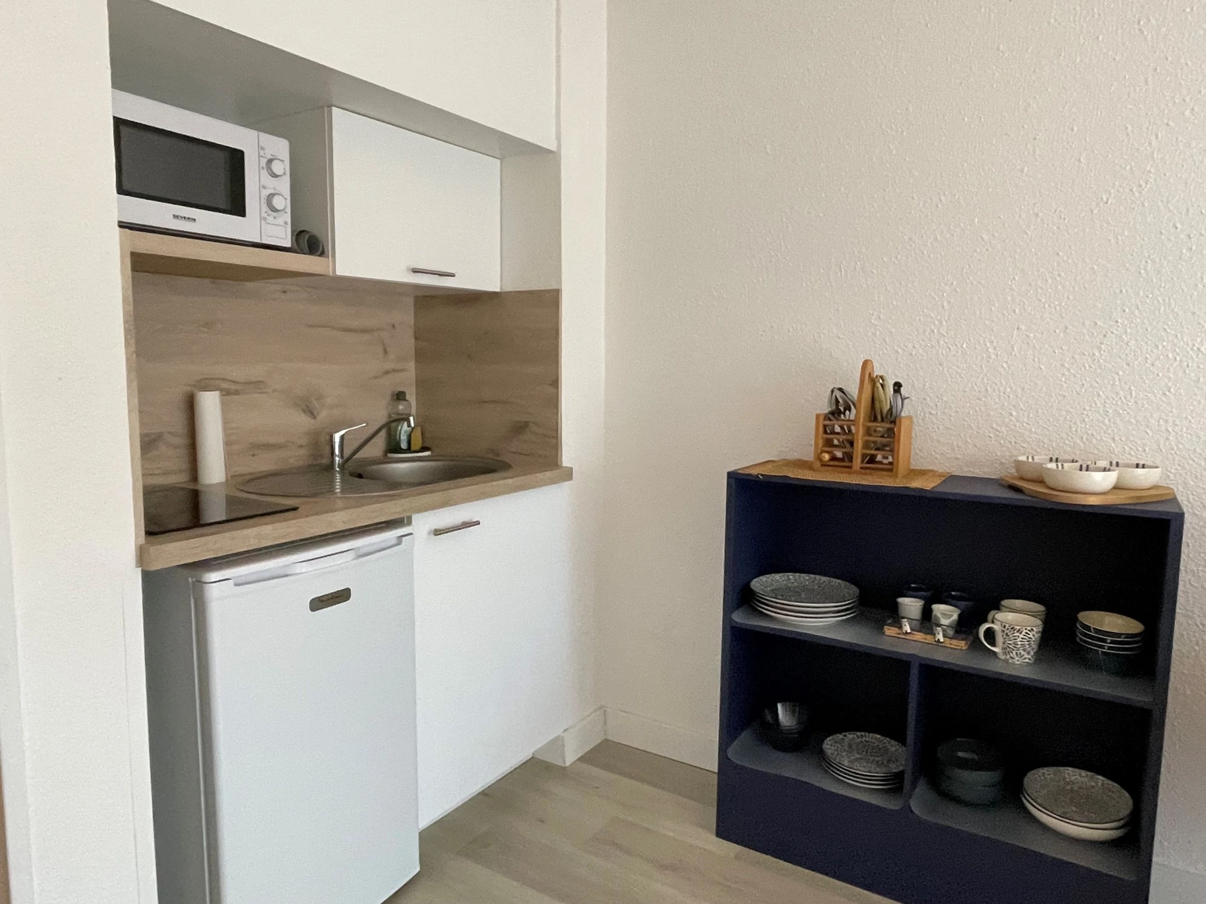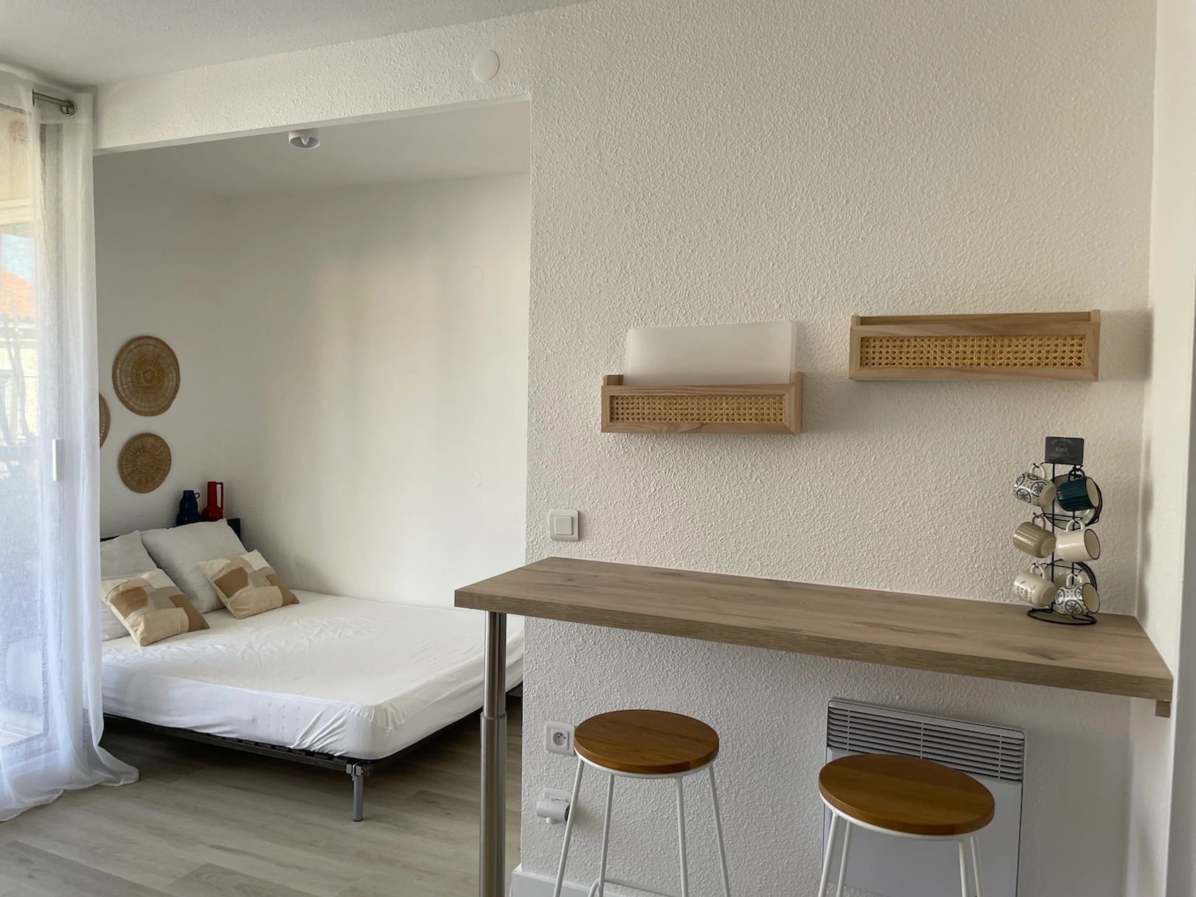 Die Wohnung befindet sich im ersten Stock eines Hauses, nur 100 Meter vom Strand und Geschäften entfernt. Sie bietet Platz für zwei Personen: ein Doppelbett (140 x 190 cm) im Wohnzimmer. Zur Ausstattung gehören ein Tischkühlschrank mit kleinem Gefrierfach, eine Mikrowelle und ein Cerankochfeld mit zwei Kochplatten. Gäste haben außerdem Zugang zum hauseigenen Pool und einem kleinen Balkon mit Essbereich im Freien. Bettwäsche und Handtücher werden nicht gestellt, können aber gemietet werden. Die Endreinigung ist nicht im Preis inbegriffen (Reinigungsgebühr: 45 €).