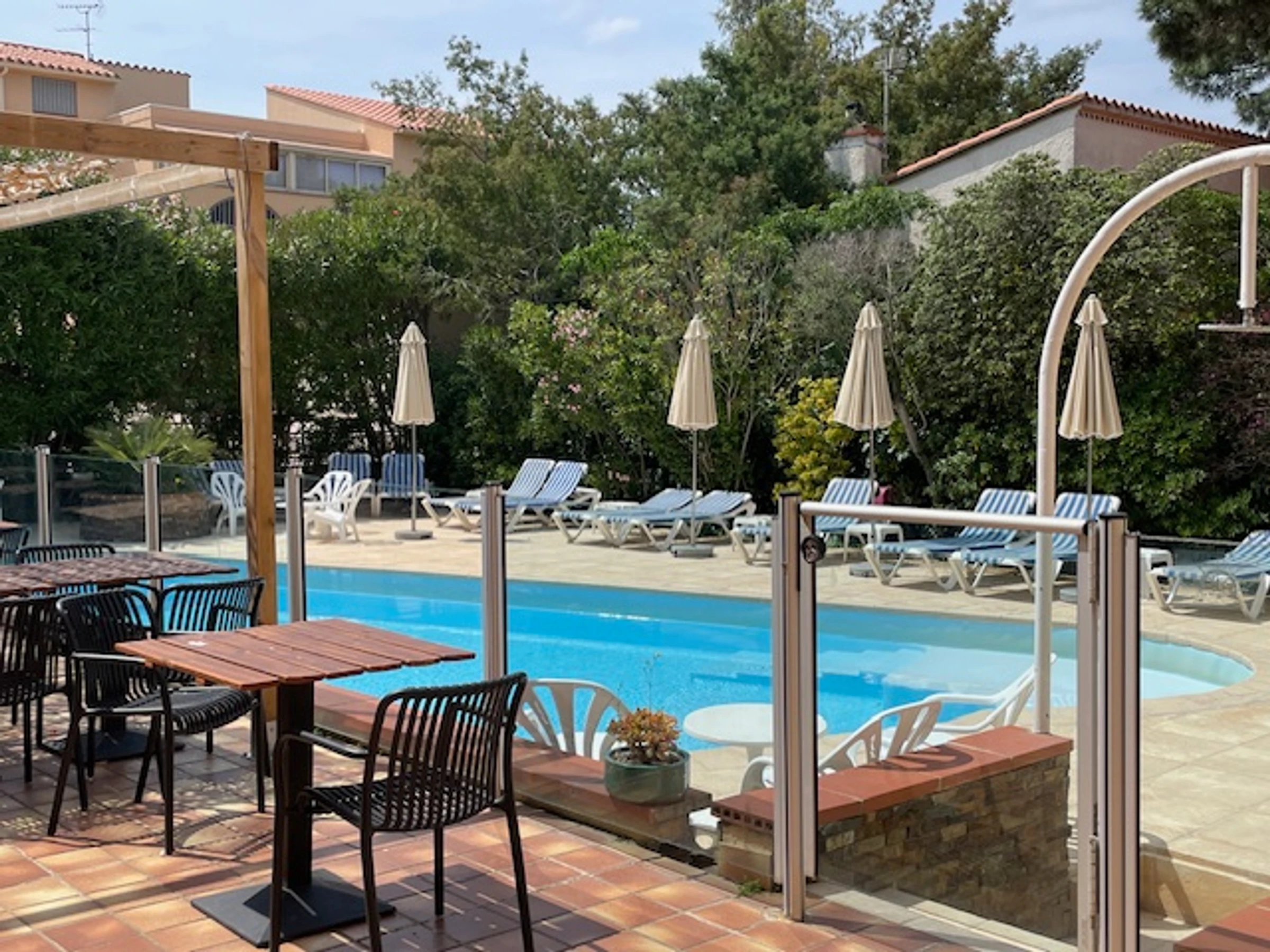 Die Residenz „Le Maritime“ ist ein Gebäude ohne Aufzug und liegt etwa 100 m vom Strand entfernt. Der Zugang zum Gebäude ist durch einen Code gesichert, und man hat Zugang zum hoteleigenen Swimmingpool.