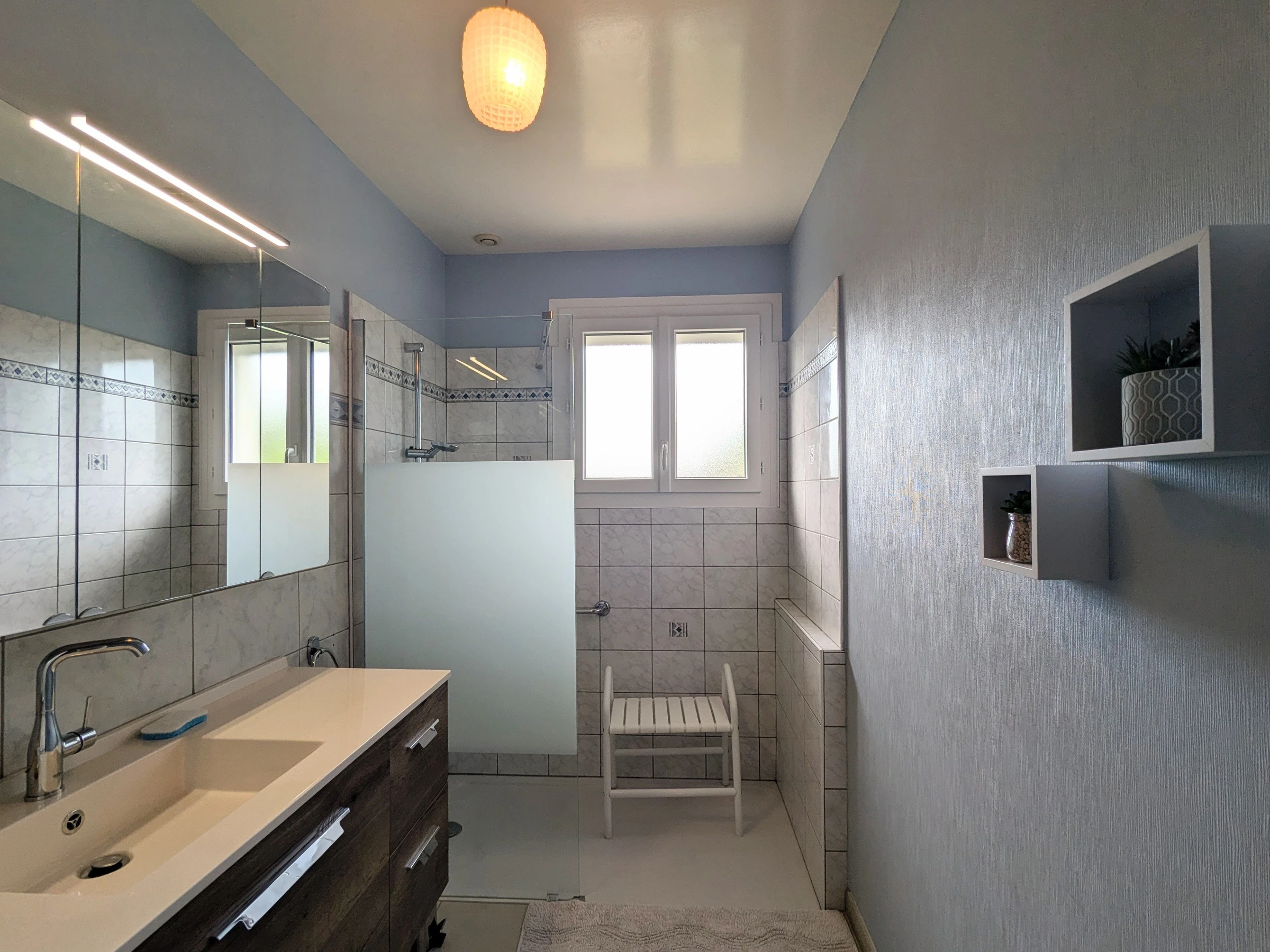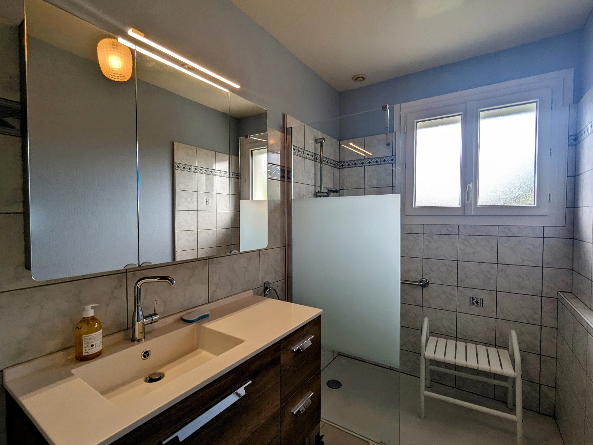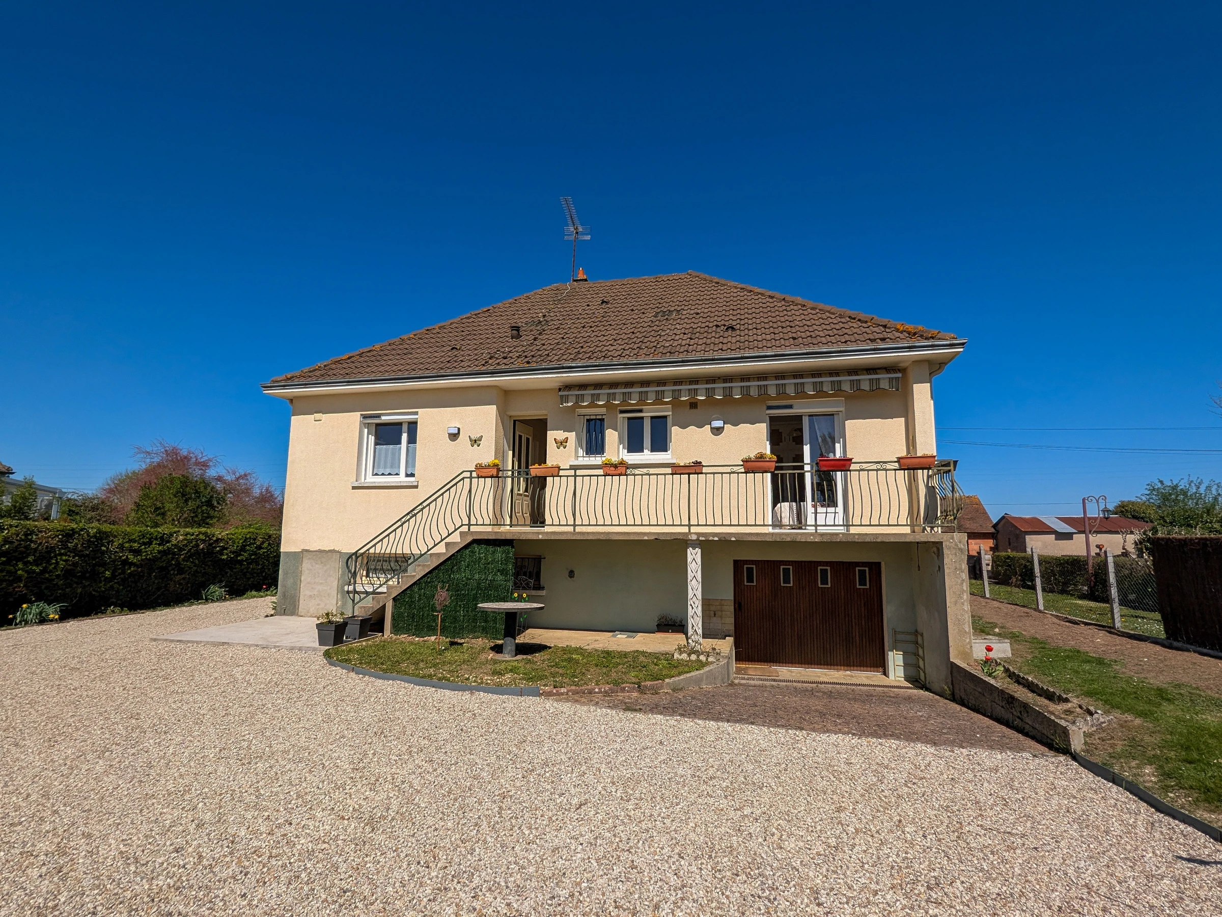 Die Pluspunkte: Eingezäunter und privater Garten, Garage, Spielzimmer. Im ersten Stock: Wohnzimmer mit Küche, Aufenthaltsraum, Esszimmer mit umschaltbarer Klimaanlage, zwei Schlafzimmer mit jeweils einem Doppelbett (140 x 190 cm), ein Schlafzimmer mit 2 Einzelbetten (90 x 190 cm), Toilette, Duschraum. Balkon