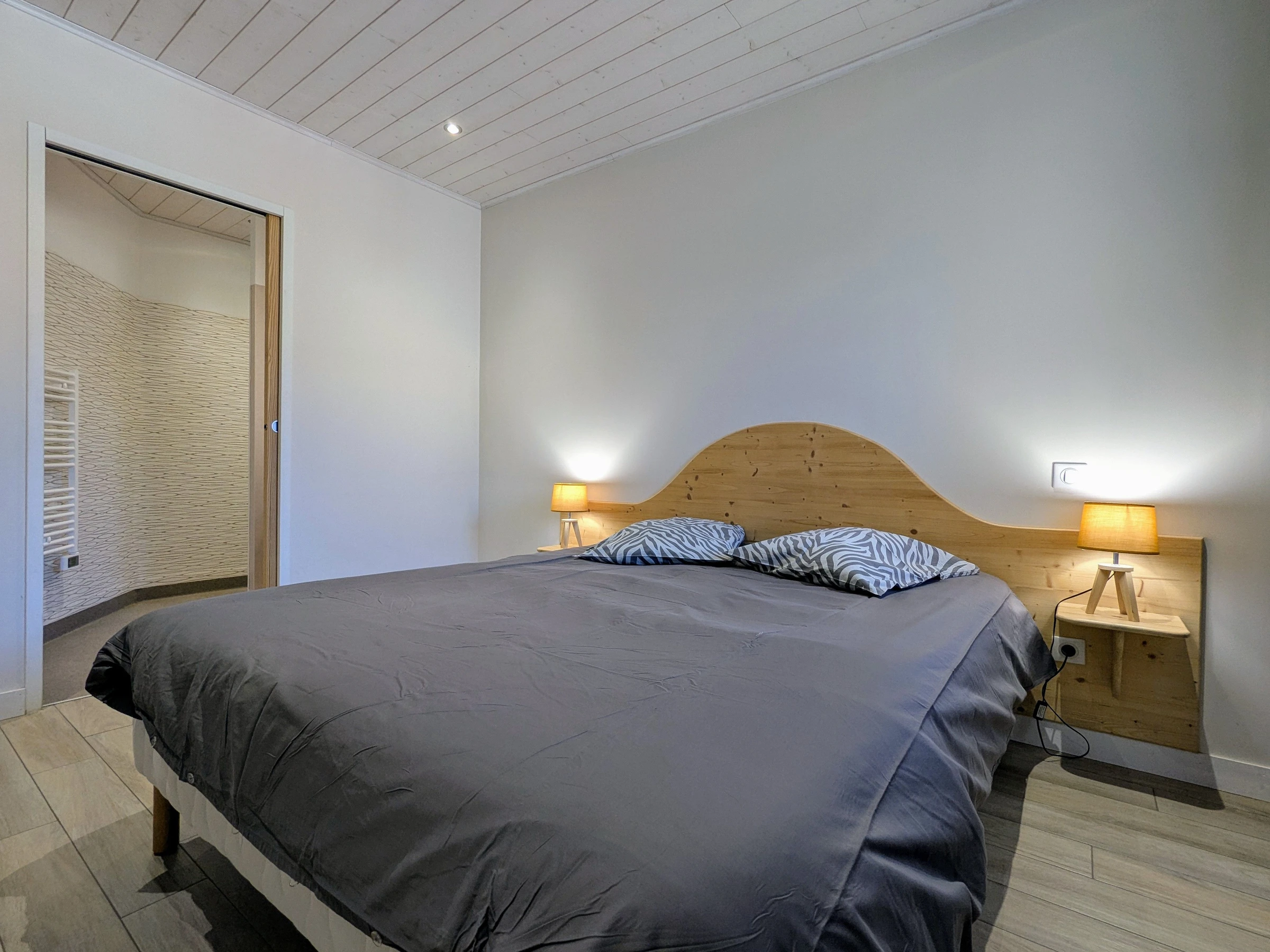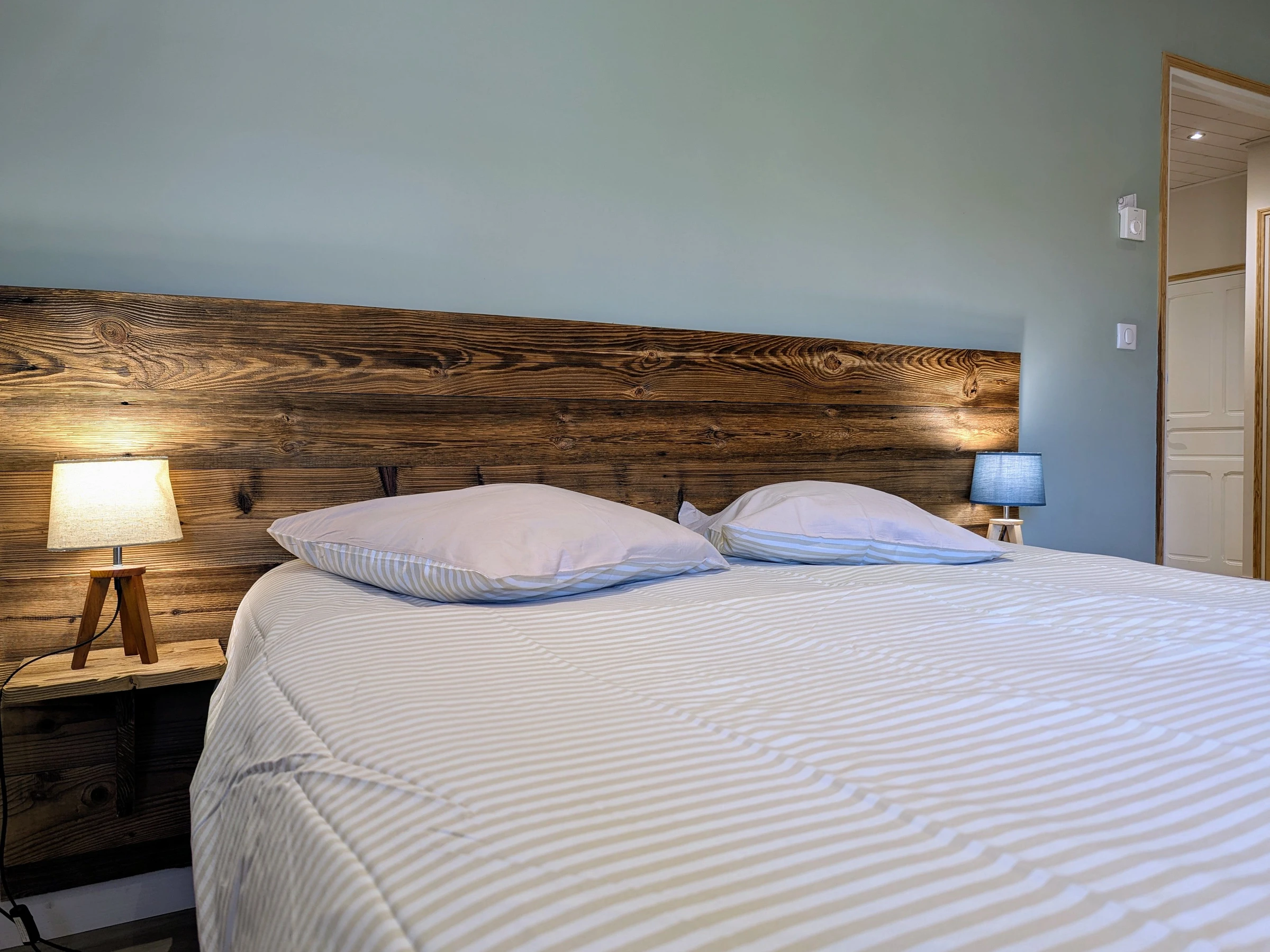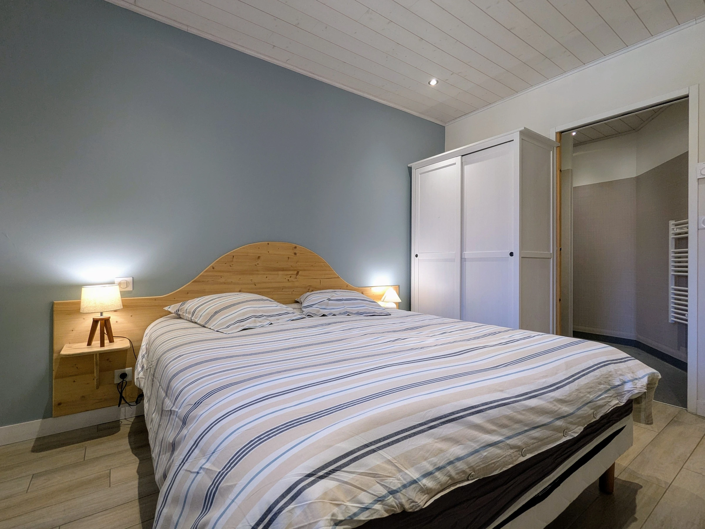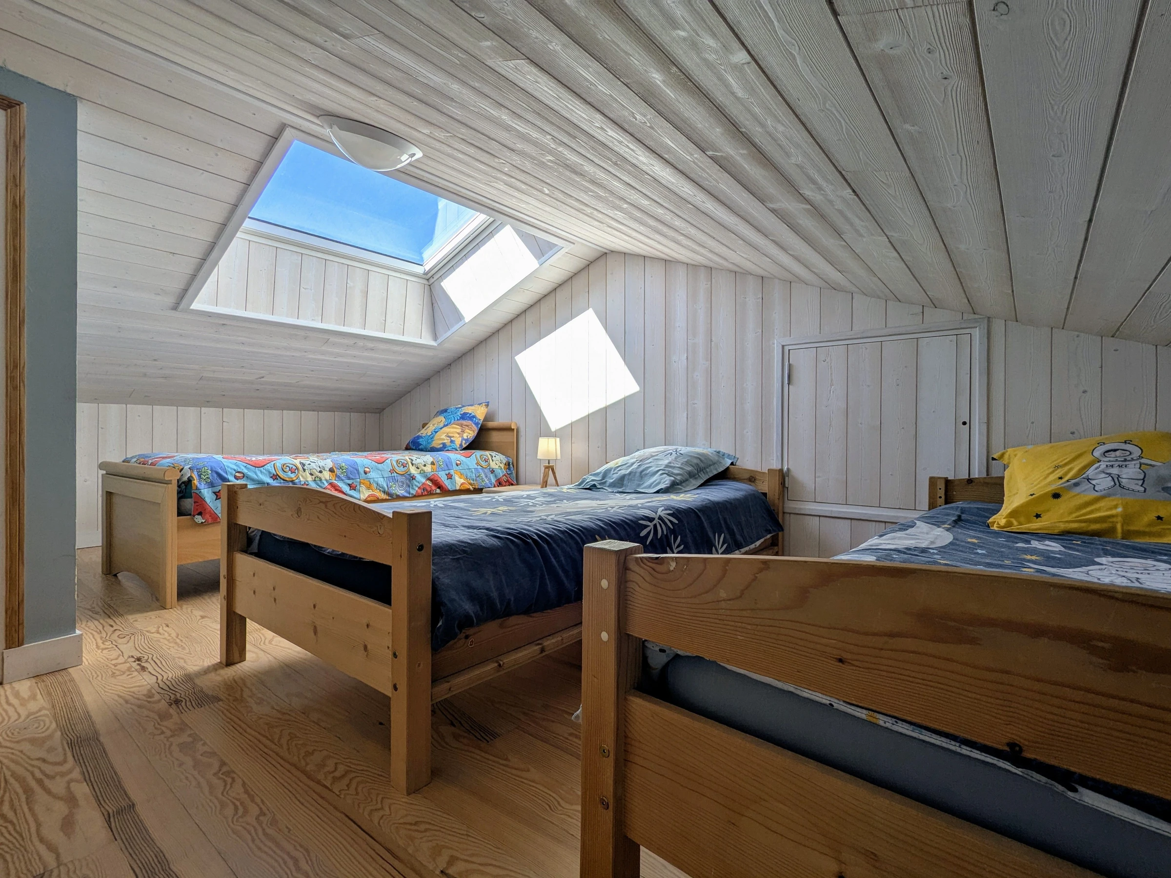 Im Obergeschoss befindet sich ein Doppelzimmer mit Dachschrägen, aber niedrigen Decken, das ideal für Kinder ist.