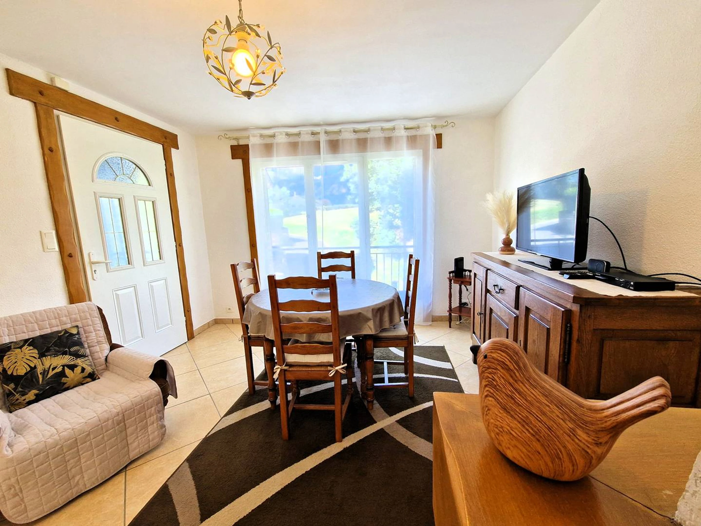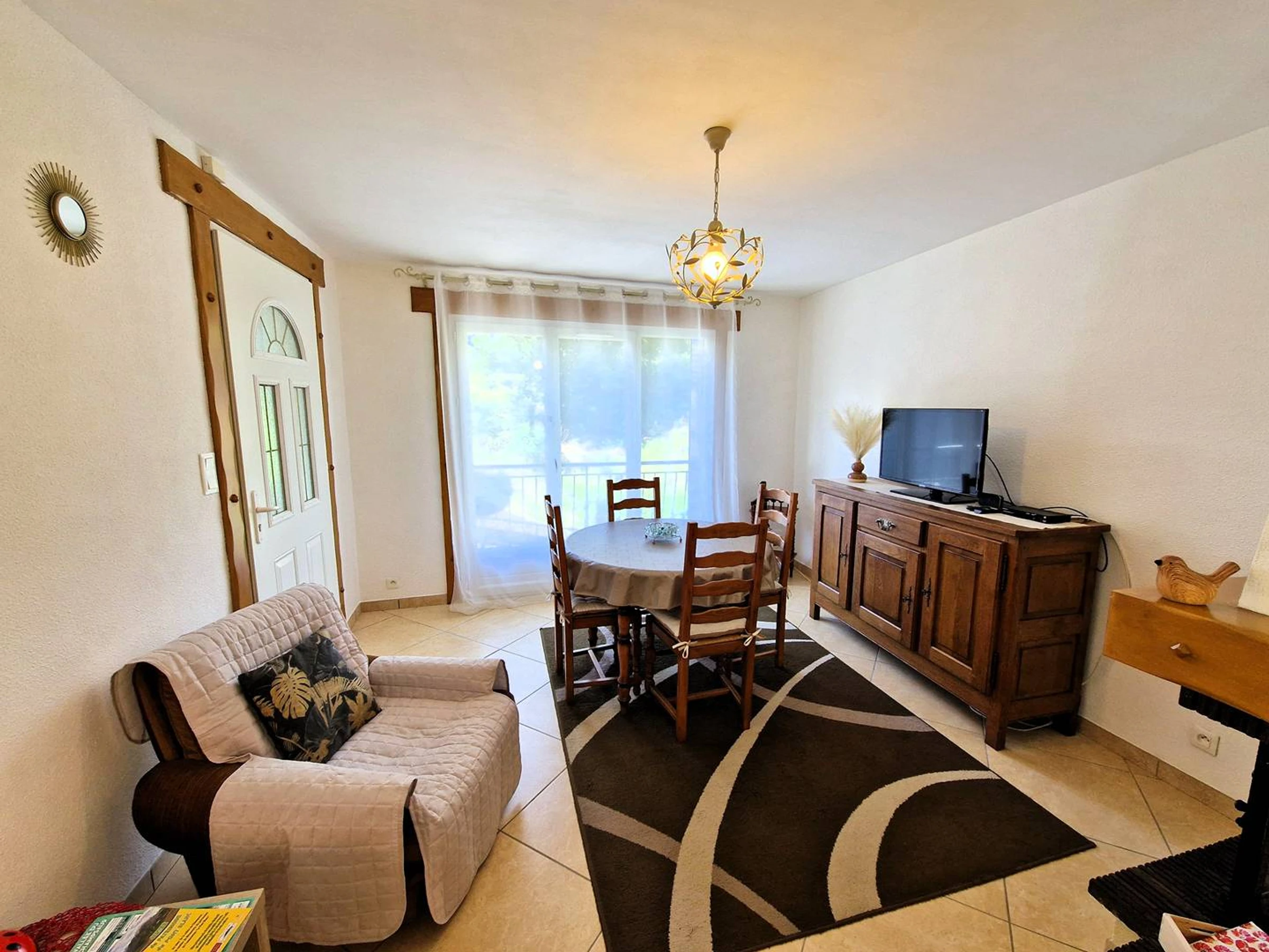 Helles Wohn-/Esszimmer mit offenem Zugang zum Außenbereich, großem Erkerfenster, Balkon, Fernseher und Essbereich