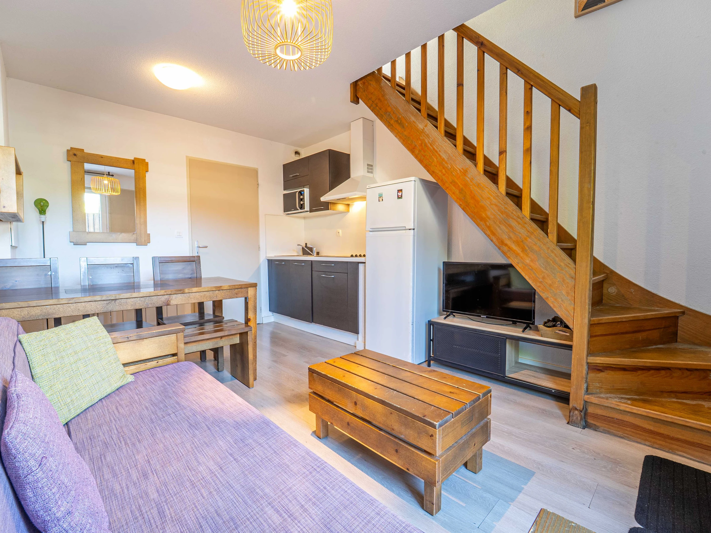 Die Wohnung lädt sofort zum Entspannen und Loslassen ein. Sie finden ein Wohnzimmer mit einer Sitzecke, einem Sofa und einem Flachbildfernseher. Die offene Küche ist so ausgestattet, dass Sie Ihre Mahlzeiten problemlos zubereiten können. Im Erdgeschoss befinden sich außerdem ein Badezimmer und eine separate Toilette. Im Obergeschoss verfügt das erste Schlafzimmer über ein 140 cm breites Doppelbett und das zweite über zwei 90 cm breite Einzelbetten.