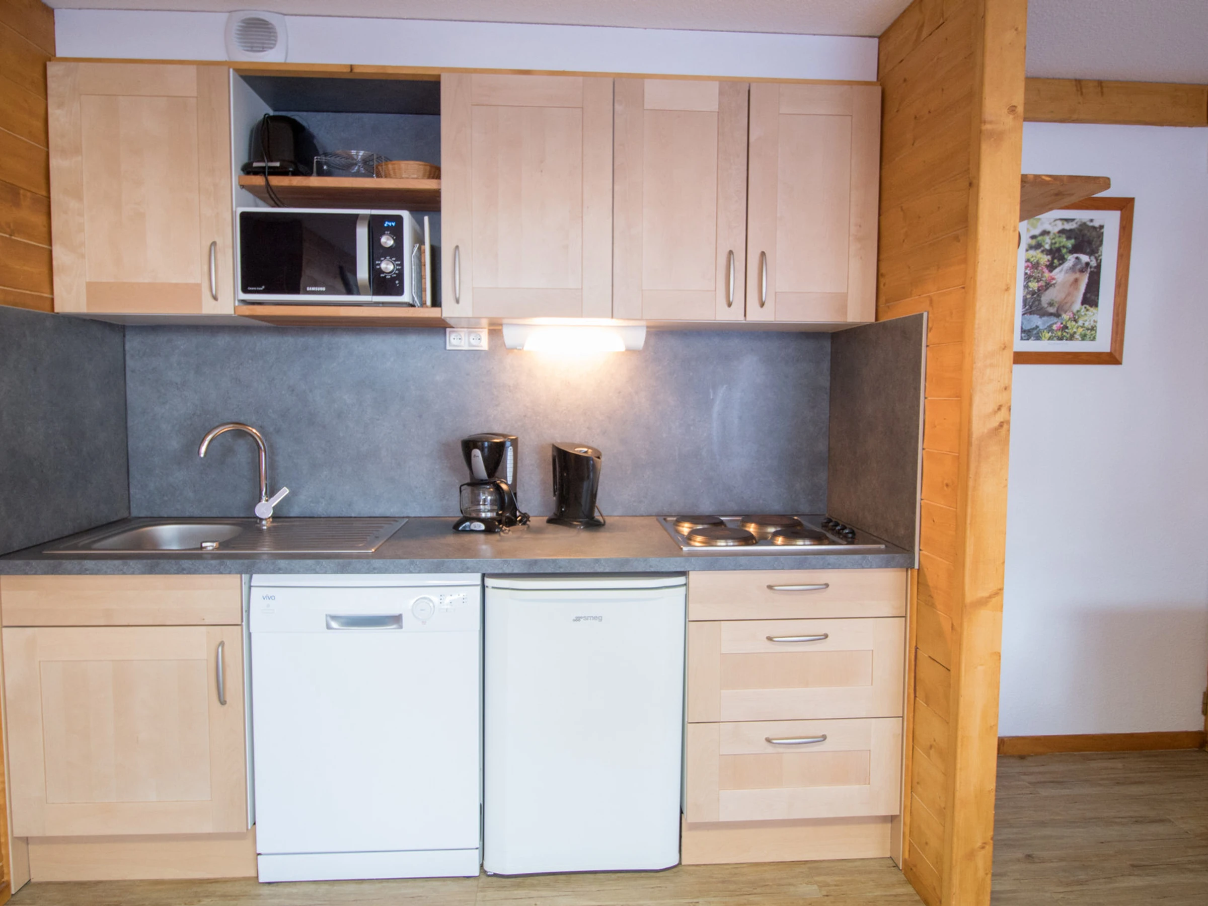 Küchenzeile: Mikrowelle/Grill, Kühlschrank, 4-Platten-Elektroherd, Geschirrspüler