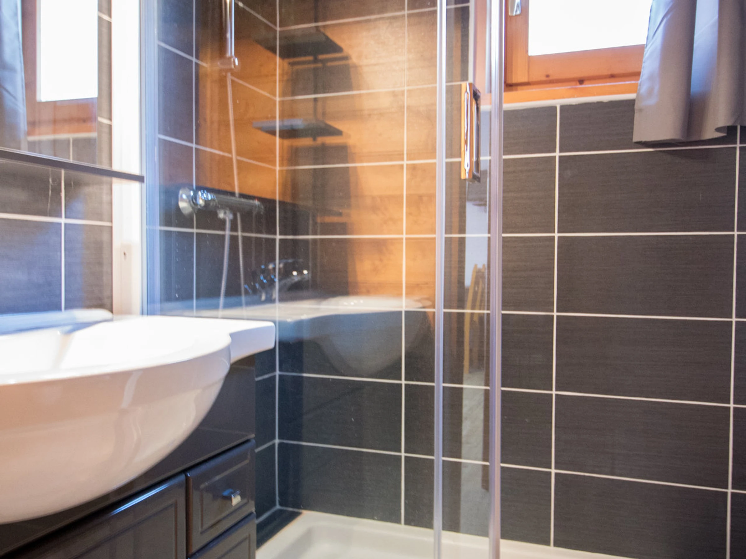 Badezimmer: Dusche, Waschbecken, Waschmaschine, separates WC