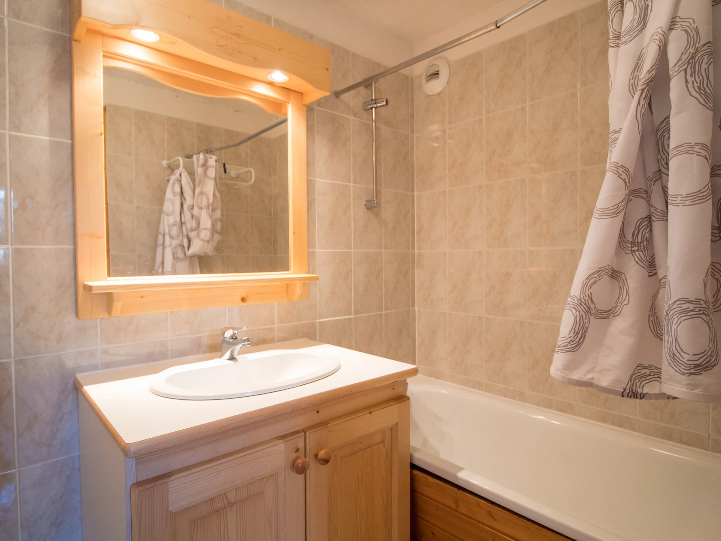 Badezimmer: Badewanne, Waschbecken. Separates WC.
